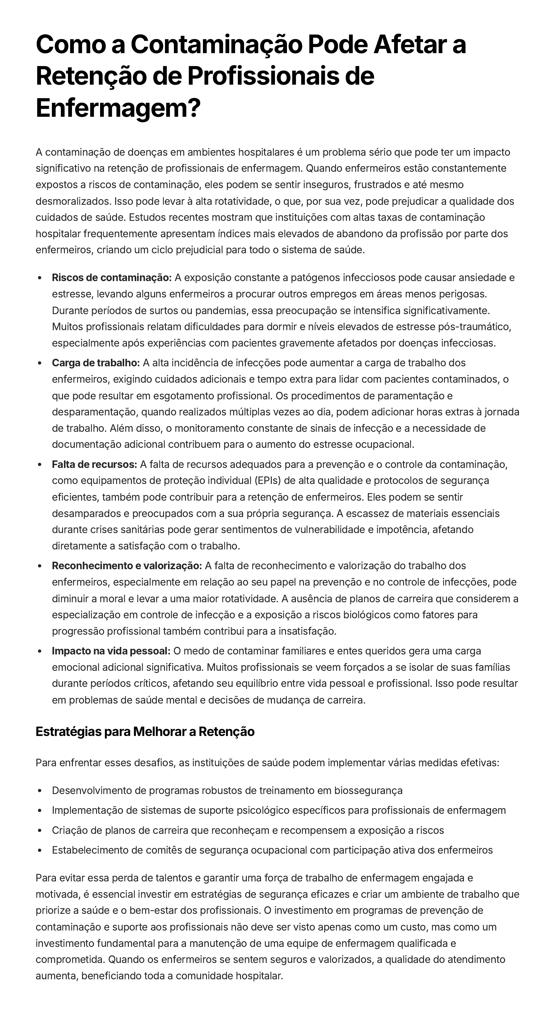 Como a Contaminação Pode Afetar a Retenção de Profissionais de Enfermagem? A contaminação de doenças em ambientes hospitalares é um problema sério que pode ter um impacto significativo na retenção de profissionais de enfermagem. Quando enfermeiros estão constantemente expostos a riscos de contaminação, eles podem se sentir inseguros, frustrados e até mesmo desmoralizados. Isso pode levar à alta rotatividade, o que, por sua vez, pode prejudicar a qualidade dos cuidados de saúde. Estudos recentes mostram que instituições com altas taxas de contaminação hospitalar frequentemente apresentam índices mais elevados de abandono da profissão por parte dos enfermeiros, criando um ciclo prejudicial para todo o sistema de saúde. Riscos de contaminação: A exposição constante a patógenos infecciosos pode causar ansiedade e estresse, levando alguns enfermeiros a procurar outros empregos em áreas menos perigosas. Durante períodos de surtos ou pandemias, essa preocupação se intensifica significativamente. Muitos profissionais relatam dificuldades para dormir e níveis elevados de estresse pós-traumático, especialmente após experiências com pacientes gravemente afetados por doenças infecciosas. Carga de trabalho: A alta incidência de infecções pode aumentar a carga de trabalho dos enfermeiros, exigindo cuidados adicionais e tempo extra para lidar com pacientes contaminados, o que pode resultar em esgotamento profissional. Os procedimentos de paramentação e desparamentação, quando realizados múltiplas vezes ao dia, podem adicionar horas extras à jornada de trabalho. Além disso, o monitoramento constante de sinais de infecção e a necessidade de documentação adicional contribuem para o aumento do estresse ocupacional. Falta de recursos: A falta de recursos adequados para a prevenção e o controle da contaminação, como equipamentos de proteção individual (EPIs) de alta qualidade e protocolos de segurança eficientes, também pode contribuir para a retenção de enfermeiros. Eles podem se sentir desamparados e preocupados com a sua própria segurança. A escassez de materiais essenciais durante crises sanitárias pode gerar sentimentos de vulnerabilidade e impotência, afetando diretamente a satisfação com o trabalho. Reconhecimento e valorização: A falta de reconhecimento e valorização do trabalho dos enfermeiros, especialmente em relação ao seu papel na prevenção e no controle de infecções, pode diminuir a moral e levar a uma maior rotatividade. A ausência de planos de carreira que considerem a especialização em controle de infecção e a exposição a riscos biológicos como fatores para progressão profissional também contribui para a insatisfação. Impacto na vida pessoal: O medo de contaminar familiares e entes queridos gera uma carga emocional adicional significativa. Muitos profissionais se veem forçados a se isolar de suas famílias durante períodos críticos, afetando seu equilíbrio entre vida pessoal e profissional. Isso pode resultar em problemas de saúde mental e decisões de mudança de carreira. Estratégias para Melhorar a Retenção Para enfrentar esses desafios, as instituições de saúde podem implementar várias medidas efetivas: Desenvolvimento de programas robustos de treinamento em biossegurança Implementação de sistemas de suporte psicológico específicos para profissionais de enfermagem Criação de planos de carreira que reconheçam e recompensem a exposição a riscos Estabelecimento de comitês de segurança ocupacional com participação ativa dos enfermeiros Para evitar essa perda de talentos e garantir uma força de trabalho de enfermagem engajada e motivada, é essencial investir em estratégias de segurança eficazes e criar um ambiente de trabalho que priorize a saúde e o bem-estar dos profissionais. O investimento em programas de prevenção de contaminação e suporte aos profissionais não deve ser visto apenas como um custo, mas como um investimento fundamental para a manutenção de uma equipe de enfermagem qualificada e comprometida. Quando os enfermeiros se sentem seguros e valorizados, a qualidade do atendimento aumenta, beneficiando toda a comunidade hospitalar.
