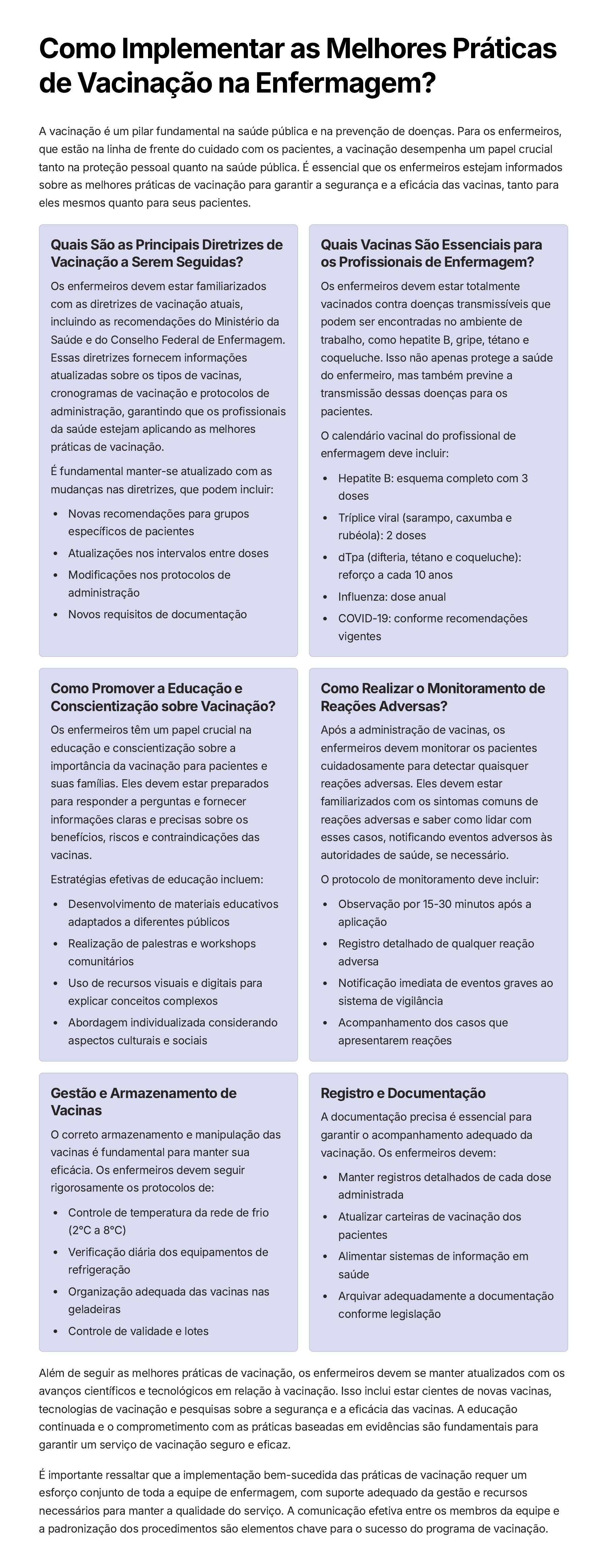 Como Implementar as Melhores Práticas de Vacinação na Enfermagem? A vacinação é um pilar fundamental na saúde pública e na prevenção de doenças. Para os enfermeiros, que estão na linha de frente do cuidado com os pacientes, a vacinação desempenha um papel crucial tanto na proteção pessoal quanto na saúde pública. É essencial que os enfermeiros estejam informados sobre as melhores práticas de vacinação para garantir a segurança e a eficácia das vacinas, tanto para eles mesmos quanto para seus pacientes. Quais São as Principais Diretrizes de Vacinação a Serem Seguidas? Os enfermeiros devem estar familiarizados com as diretrizes de vacinação atuais, incluindo as recomendações do Ministério da Saúde e do Conselho Federal de Enfermagem. Essas diretrizes fornecem informações atualizadas sobre os tipos de vacinas, cronogramas de vacinação e protocolos de administração, garantindo que os profissionais da saúde estejam aplicando as melhores práticas de vacinação. É fundamental manter-se atualizado com as mudanças nas diretrizes, que podem incluir: Novas recomendações para grupos específicos de pacientes Atualizações nos intervalos entre doses Modificações nos protocolos de administração Novos requisitos de documentação Quais Vacinas São Essenciais para os Profissionais de Enfermagem? Os enfermeiros devem estar totalmente vacinados contra doenças transmissíveis que podem ser encontradas no ambiente de trabalho, como hepatite B, gripe, tétano e coqueluche. Isso não apenas protege a saúde do enfermeiro, mas também previne a transmissão dessas doenças para os pacientes. O calendário vacinal do profissional de enfermagem deve incluir: Hepatite B: esquema completo com 3 doses Tríplice viral (sarampo, caxumba e rubéola): 2 doses dTpa (difteria, tétano e coqueluche): reforço a cada 10 anos Influenza: dose anual COVID-19: conforme recomendações vigentes Como Promover a Educação e Conscientização sobre Vacinação? Os enfermeiros têm um papel crucial na educação e conscientização sobre a importância da vacinação para pacientes e suas famílias. Eles devem estar preparados para responder a perguntas e fornecer informações claras e precisas sobre os benefícios, riscos e contraindicações das vacinas. Estratégias efetivas de educação incluem: Desenvolvimento de materiais educativos adaptados a diferentes públicos Realização de palestras e workshops comunitários Uso de recursos visuais e digitais para explicar conceitos complexos Abordagem individualizada considerando aspectos culturais e sociais Como Realizar o Monitoramento de Reações Adversas? Após a administração de vacinas, os enfermeiros devem monitorar os pacientes cuidadosamente para detectar quaisquer reações adversas. Eles devem estar familiarizados com os sintomas comuns de reações adversas e saber como lidar com esses casos, notificando eventos adversos às autoridades de saúde, se necessário. O protocolo de monitoramento deve incluir: Observação por 15-30 minutos após a aplicação Registro detalhado de qualquer reação adversa Notificação imediata de eventos graves ao sistema de vigilância Acompanhamento dos casos que apresentarem reações Gestão e Armazenamento de Vacinas O correto armazenamento e manipulação das vacinas é fundamental para manter sua eficácia. Os enfermeiros devem seguir rigorosamente os protocolos de: Controle de temperatura da rede de frio (2°C a 8°C) Verificação diária dos equipamentos de refrigeração Organização adequada das vacinas nas geladeiras Controle de validade e lotes Registro e Documentação A documentação precisa é essencial para garantir o acompanhamento adequado da vacinação. Os enfermeiros devem: Manter registros detalhados de cada dose administrada Atualizar carteiras de vacinação dos pacientes Alimentar sistemas de informação em saúde Arquivar adequadamente a documentação conforme legislação Além de seguir as melhores práticas de vacinação, os enfermeiros devem se manter atualizados com os avanços científicos e tecnológicos em relação à vacinação. Isso inclui estar cientes de novas vacinas, tecnologias de vacinação e pesquisas sobre a segurança e a eficácia das vacinas. A educação continuada e o comprometimento com as práticas baseadas em evidências são fundamentais para garantir um serviço de vacinação seguro e eficaz. É importante ressaltar que a implementação bem-sucedida das práticas de vacinação requer um esforço conjunto de toda a equipe de enfermagem, com suporte adequado da gestão e recursos necessários para manter a qualidade do serviço. A comunicação efetiva entre os membros da equipe e a padronização dos procedimentos são elementos chave para o sucesso do programa de vacinação.