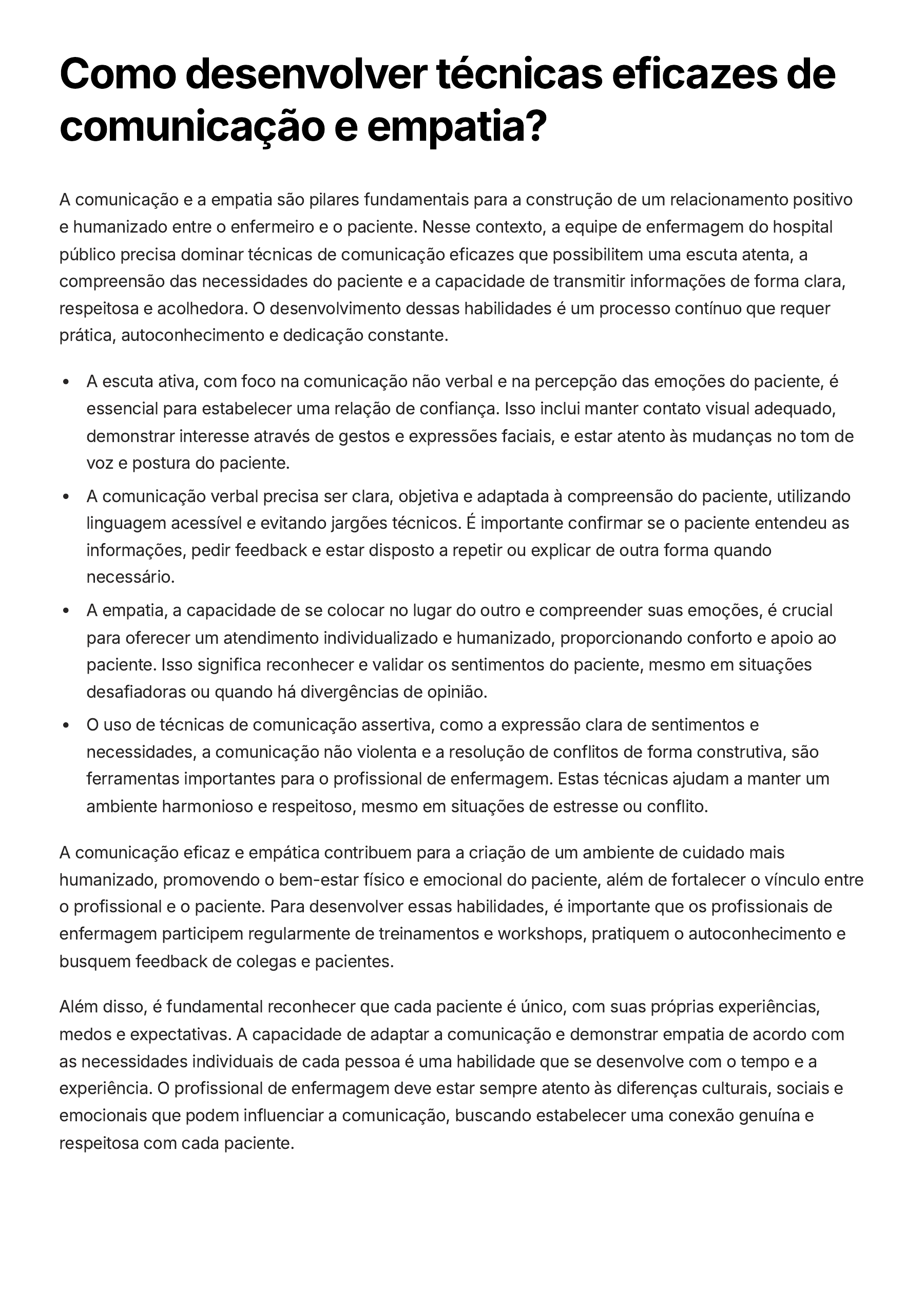 Como desenvolver técnicas eficazes de comunicação e empatia? A comunicação e a empatia são pilares fundamentais para a construção de um relacionamento positivo e humanizado entre o enfermeiro e o paciente. Nesse contexto, a equipe de enfermagem do hospital público precisa dominar técnicas de comunicação eficazes que possibilitem uma escuta atenta, a compreensão das necessidades do paciente e a capacidade de transmitir informações de forma clara, respeitosa e acolhedora. O desenvolvimento dessas habilidades é um processo contínuo que requer prática, autoconhecimento e dedicação constante. A escuta ativa, com foco na comunicação não verbal e na percepção das emoções do paciente, é essencial para estabelecer uma relação de confiança. Isso inclui manter contato visual adequado, demonstrar interesse através de gestos e expressões faciais, e estar atento às mudanças no tom de voz e postura do paciente. A comunicação verbal precisa ser clara, objetiva e adaptada à compreensão do paciente, utilizando linguagem acessível e evitando jargões técnicos. É importante confirmar se o paciente entendeu as informações, pedir feedback e estar disposto a repetir ou explicar de outra forma quando necessário. A empatia, a capacidade de se colocar no lugar do outro e compreender suas emoções, é crucial para oferecer um atendimento individualizado e humanizado, proporcionando conforto e apoio ao paciente. Isso significa reconhecer e validar os sentimentos do paciente, mesmo em situações desafiadoras ou quando há divergências de opinião. O uso de técnicas de comunicação assertiva, como a expressão clara de sentimentos e necessidades, a comunicação não violenta e a resolução de conflitos de forma construtiva, são ferramentas importantes para o profissional de enfermagem. Estas técnicas ajudam a manter um ambiente harmonioso e respeitoso, mesmo em situações de estresse ou conflito. A comunicação eficaz e empática contribuem para a criação de um ambiente de cuidado mais humanizado, promovendo o bem-estar físico e emocional do paciente, além de fortalecer o vínculo entre o profissional e o paciente. Para desenvolver essas habilidades, é importante que os profissionais de enfermagem participem regularmente de treinamentos e workshops, pratiquem o autoconhecimento e busquem feedback de colegas e pacientes. Além disso, é fundamental reconhecer que cada paciente é único, com suas próprias experiências, medos e expectativas. A capacidade de adaptar a comunicação e demonstrar empatia de acordo com as necessidades individuais de cada pessoa é uma habilidade que se desenvolve com o tempo e a experiência. O profissional de enfermagem deve estar sempre atento às diferenças culturais, sociais e emocionais que podem influenciar a comunicação, buscando estabelecer uma conexão genuína e respeitosa com cada paciente.