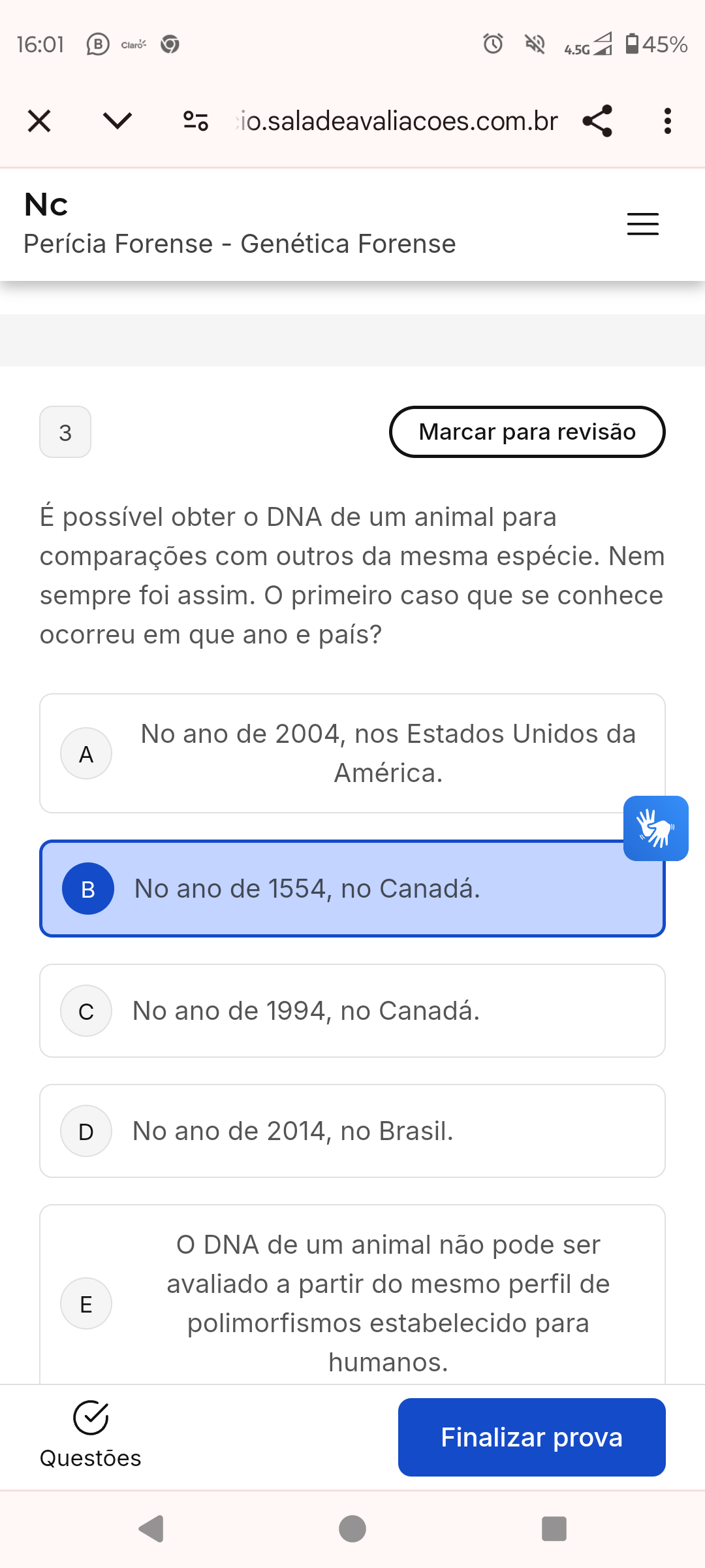 Questão 10: A biologia forense é a área das ciências forenses responsável por analisar toda e qualquer amostra biológica com o objetivo de localizar,