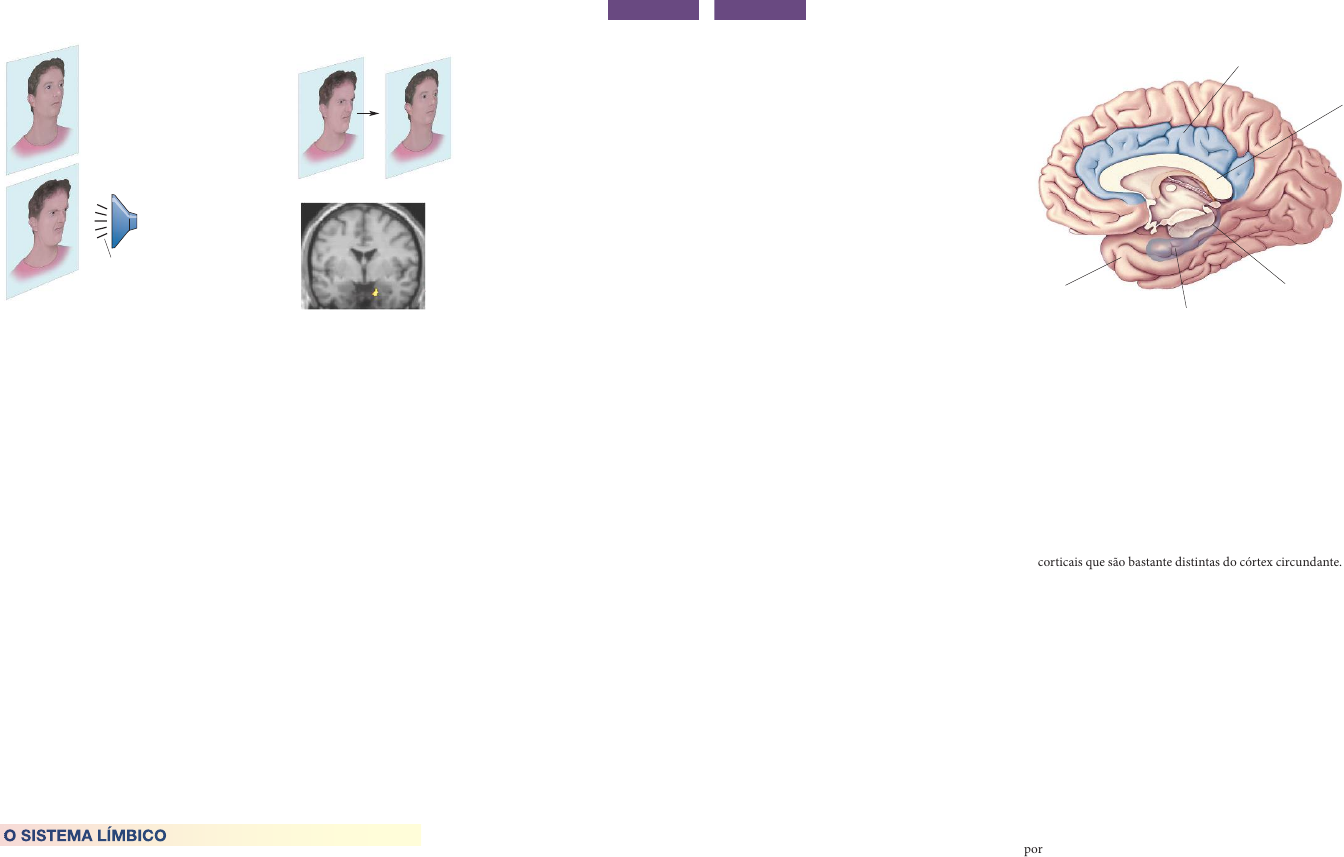 CAPÍTULO 18 Os Mecanismos da Emoção no Encéfalo 621 desagradável, ou sem esse som (Figura 18.3). Como antes, os participantes não percebiam as faces raivosas quando um estímulo para as mascarar era apre- sentado. Ainda assim, medidas da condutância da pele mostraram que os par- ticipantes respondiam às faces raivosas que haviam sido pareadas com o som. Além disso, imageamento usando tomografia por emissão de pósitrons (TEP) foi utilizado para registrar a atividade encefálica enquanto as fotos eram apre- sentadas. As imagens do encéfalo mostram que as faces zangadas, condiciona- das a serem desagradáveis, evocavam uma maior atividade no encéfalo em certo local, a amígdala. Teremos mais a dizer sobre a amígdala posteriormente neste capítulo. Por enquanto, um ponto importante a ser lembrado é que as medidas, tanto de respostas neurovegetativas quanto da atividade da amígdala, correla- cionam-se à apresentação de faces zangadas condicionadas a serem desagradá- veis, apesar do fato de essas faces não serem percebidas. Se sinais sensoriais podem apresentar impacto emocional no encéfalo sem estarmos cientes deles, isso parece descartar teorias nas quais a experiência emocional é um pré-requisito para a expressão da emoção. No entanto, mesmo aceitando essa conclusão, há muitas maneiras possíveis para o encéfalo proces- sar informação emocional. Consideraremos agora as vias que ligam, no encé- falo, as sensações (sinais de entrada) às respostas comportamentais (sinais de saída) que caracterizam a experiência emocional. No restante deste capítulo, veremos que diferentes emoções podem depender de distintos circuitos neu- rais, mas algumas partes do encéfalo são importantes para múltiplas emoções. O SISTEMA LÍMBICO Em capítulos anteriores, discutimos como a informação sensorial proveniente de receptores periféricos é processada ao longo de vias claramente definidas e O SISTEMA LÍMBICO + Percepção: face sem expressão SNV: sem efeito Percepção: face sem expressão SNV: aumento da condutância da pele Percepção: face raivosa SNV: aumento da condutância da pele Som desagradável (a) Condicionamento (b) Teste (c) Atividade encefálica FIGURA 18.3 Atividade encefálica emocional inconsciente. (a) Participantes humanos foram condicio- nados utilizando-se fotografias de faces sem expressão e de faces raivosas. Os participan- tes respondiam à face raivosa, pareada com um som alto e desagradável, com aumento na atividade simpática (condutância da pele). (b) Na fase de teste, uma face raivosa era mostra- da brevemente, seguindo-se imediatamente uma face desprovida de expressão. Os partici- pantes relataram ter visto apenas a face sem expressão, mas um aumento na condutância da pele ainda ocorria. (c) Apesar do fato de que a face raivosa não era percebida na fase de teste, ocorria ativação da amígdala (em vermelho e amarelo) apenas quando o estímulo (face sem expressão) era precedido pela face raivosa (Fonte: Morris, Öhman e Dolan, 1998.) PARTE III O Encéfalo e o Comportamento622 anatomicamente distintas que seguem para o neocórtex. Os componentes de uma via constituem coletivamente um sistema. Por exemplo, neurônios loca- lizados na retina, no núcleo geniculado lateral (NGL) e no córtex estriado tra- balham juntos para servir à visão, de forma que dizemos que eles são parte do sistema visual. Há, nesse sentido, um sistema responsável pela experiência das emoções? Desde cerca de 1930, alguns cientistas têm argumentado que há, e tal sistema veio a ser conhecido como sistema límbico. Discutiremos brevemente as dificuldades de se tentar definir um sistema único para a emoção. Inicial- mente, porém, examinaremos a origem do conceito de sistema límbico. O Lobo Límbico de Broca Em um artigo publicado em 1878, o neurologista francês Paul Broca observou que todos os mamíferos possuem, na superfície medial do cérebro, um grupo de áreas corticais que são bastante distintas do córtex circundante. Utilizando a palavra latina para “borda” (limbus), Broca designou essa coleção de áreas corti- cais como lobo límbico, uma vez que elas formam um anel, ou borda, ao redor do tronco encefálico (Figura 18.4). De acordo com essa definição, o lobo lím- bico é constituído por córtex ao redor do corpo caloso (principalmente o giro cingulado), córtex na superfície medial do lobo temporal e hipocampo. Broca não escreveu sobre a importância dessas estruturas para a emoção, e, por algum tempo, pensou-se que estivessem envolvidas primariamente com o olfato. A palavra límbico, contudo, e as estruturas no lobo límbico de Broca foram, após, associadas fortemente à emoção. O Circuito de Papez Por volta da década de 1930, evidências sugeriram que algumas estruturas lím- bicas estivessem envolvidas na emoção. Refletindo a respeito de trabalhos ante- riores de Cannon, Bard e outros, o neurologista norte-americano James Papez propôs que houvesse, na parede medial do encéfalo, um “sistema da emoção”, que ligaria o córtex ao hipotálamo. A Figura 18.5 mostra o grupo de estruturas que veio a ser chamado de circuito de Papez. Cada estrutura está conectada à outra por algum importante tracto axonal. Papez acreditava, como muitos cientistas hoje, que o córtex estivesse critica- mente envolvido com a experiência emocional. Algumas vezes, lesões em certas FIGURA 18.4 O lobo límbico. Broca definiu o lobo límbico como as estruturas que for- mam um anel ao redor do tronco en- cefálico e do corpo caloso, nas pare- des mediais do encéfalo. As principais estruturas do lobo límbico assinala- das aqui são o giro cingulado, o cór- tex temporal medial e o hipocampo. O tronco encefálico foi removido na fi- gura para que a superfície medial do lobo temporal fosse visível. Lobo temporal (superfície medial) Hipocampo Giro cingulado Corte da borda do tronco encefálico Corte da borda do corpo caloso Mobil