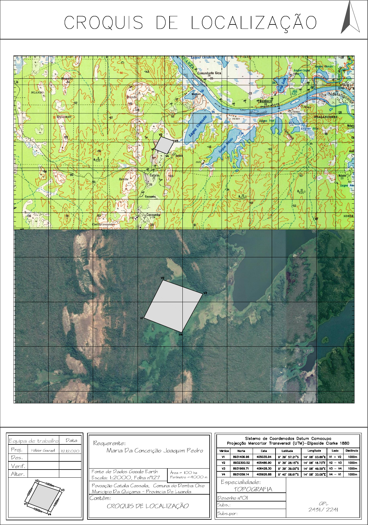 N Proj. Des. Verif. Data Contém: CROQUIS DE LOCALIZAÇÃO 12.12.020Hélder Gourgel Alter. Subs.: Subs.por: GPL 2431/2241 Desenho nº01 Especialidade: TOPOGRAFIA Equipa de trabalho Fonte de Dados Google Earth Escala: 1:2000, Folha nº127 Povoação Catala Cassala, Comuna do Demba Chio Municipio Da Quiçama - Provincia De Luanda Área = 100 ha Perímetro =4000 m Requerente: Maria Da Conceição Joaquim Pedro 269000.000 270000.000 271000.000 272000.000 273000.000 274000.000 275000.000 269000.000 270000.000 271000.000 272000.000 273000.000 274000.000 275000.000 9 0 0 8 0 0 0 . 0 0 0 9 0 0 9 0 0 0 . 0 0 0 9 0 1 0 0 0 0 . 0 0 0 9 0 1 1 0 0 0 . 0 0 0 9 0 1 2 0 0 0 . 0 0 0 9 0 1 3 0 0 0 . 0 0 0 9 0 1 4 0 0 0 . 0 0 0 9 0 1 5 0 0 0 . 0 0 0 9 0 0 8 0 0 0 . 0 0 0 9 0 0 9 0 0 0 . 0 0 0 9 0 1 0 0 0 0 . 0 0 0 9 0 1 1 0 0 0 . 0 0 0 9 0 1 2 0 0 0 . 0 0 0 9 0 1 3 0 0 0 . 0 0 0 9 0 1 4 0 0 0 . 0 0 0 9 0 1 5 0 0 0 . 0 0 0 AutoCAD SHX Text CROQUIS DE LOCALIZAÇÃO AutoCAD SHX Text Sistema de Coordenadas Datum Camacupa AutoCAD SHX Text Projecção Mercartor Transversal (UTM)-Elipsoide Clarke 1880 AutoCAD SHX Text Vértice AutoCAD SHX Text Norte AutoCAD SHX Text 8931406.96 AutoCAD SHX Text 8932300.52 AutoCAD SHX Text 8931969.71 AutoCAD SHX Text 8931059.14 AutoCAD SHX Text Este AutoCAD SHX Text 405035.94 AutoCAD SHX Text 405486.90 AutoCAD SHX Text 406428.30 AutoCAD SHX Text 405926.88 AutoCAD SHX Text Latitude AutoCAD SHX Text 9° 39' 57.21"S AutoCAD SHX Text Longitude AutoCAD SHX Text 14° 08' 03.86"E AutoCAD SHX Text Lado AutoCAD SHX Text V1 - V2 AutoCAD SHX Text Distância AutoCAD SHX Text V1 AutoCAD SHX Text V2 AutoCAD SHX Text V3 AutoCAD SHX Text V4 AutoCAD SHX Text V2 - V3 AutoCAD SHX Text V3 - V4 AutoCAD SHX Text V4 - V1 AutoCAD SHX Text V1 AutoCAD SHX Text V2 AutoCAD SHX Text V3 AutoCAD SHX Text V4 AutoCAD SHX Text V1 AutoCAD SHX Text V2 AutoCAD SHX Text V3 AutoCAD SHX Text V4 AutoCAD SHX Text 9° 39' 28.15"S AutoCAD SHX Text 14° 08' 18.73"E AutoCAD SHX Text 9° 39' 39.00"S AutoCAD SHX Text 14° 08' 49.59"E AutoCAD SHX Text 9° 40' 08.61"S AutoCAD SHX Text 14° 08' 33.06"E AutoCAD SHX Text 1000m AutoCAD SHX Text 1000m AutoCAD SHX Text 1000m AutoCAD SHX Text 1000m AutoCAD SHX Text V1 AutoCAD SHX Text V2 AutoCAD SHX Text V3 AutoCAD SHX Text V4 Sheets and Views Victorino Pedro