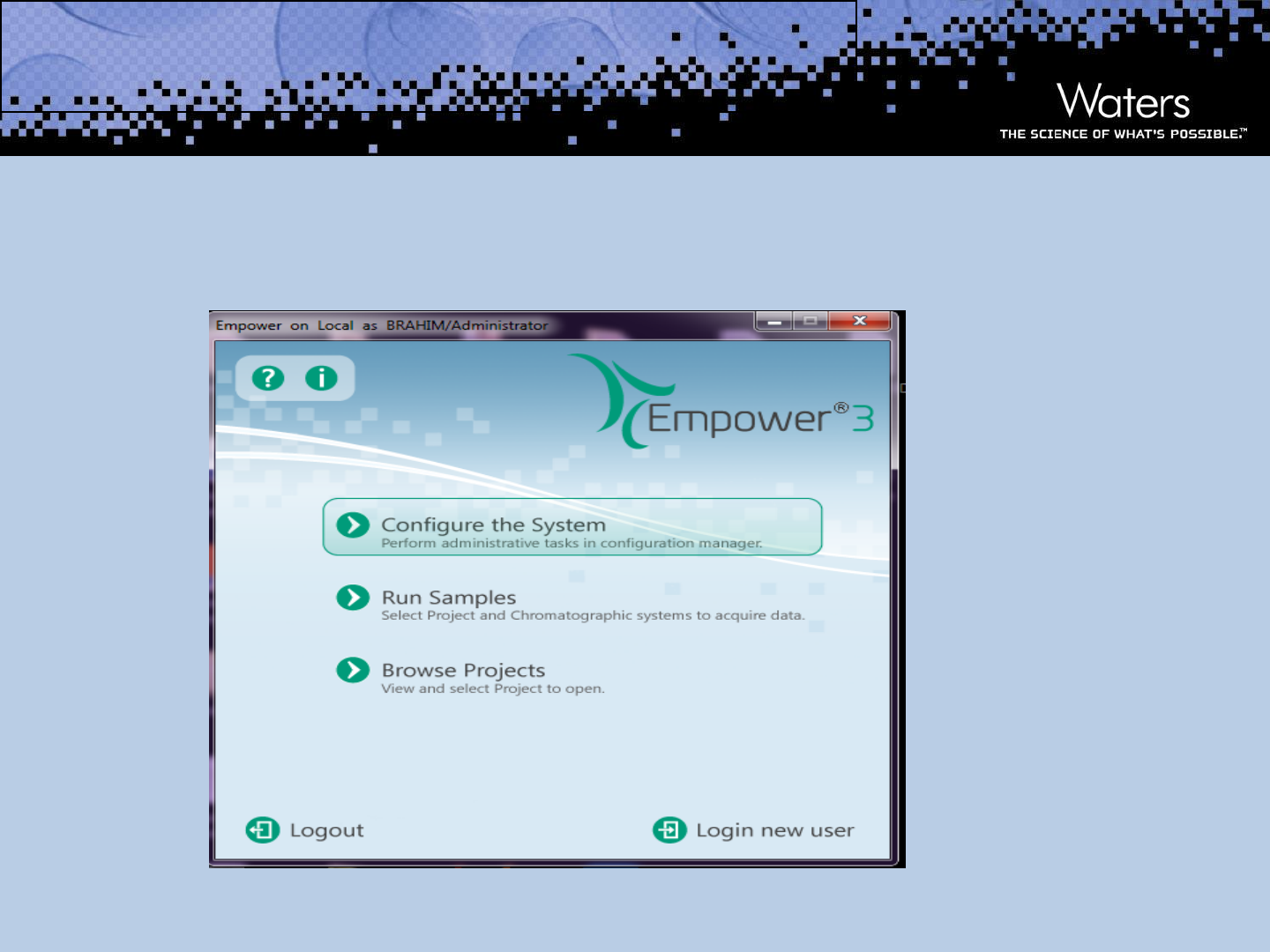 ©2007 Waters Corporation 1 Empower® Software Tutorial: Step-by- Step Project Creation ©2007 Waters Corporation 2©2007 Waters Corporation Click on "Configure the System." ©2007 Waters Corporation 3 Right-click with the mouse on Projects Then click on New and select Project. ©2007 Waters Corporation 4 If you want to create a project, click on the "Projects" root, and then click "Next." If you want to create a subproject, click on the project to which you want to attach this subproject, and then click "Next." ©2007 Waters Corporation 5 You can leave everything as default and click on "Next" Or Uncheck the "Full Audit Trail" box (this option is used to record everything that happens at the project level) For the rest, leave it as default. ©2007 Waters Corporation 6 Leave by default and click on Next. ©2007 Waters Corporation 7 Select Owner, Group, and World. Check the boxes for Administrators and Guests. Then click on Next. ©2007 Waters Corporation 8 Select the Default project and click on Next. This Default project will serve as a template to create the other projects. ©2007 Waters Corporation 9 Give a name to the project Write a comment Click on finish ©2007 Waters Corporation 10 Congratulations, you have created your first project! ©2007 Waters Corporation 11 ©2007 Waters Corporation 12©2007 Waters Corporation Empower® Software Tutorial: Step-by-Step Guide to Creating Method Sets and Sample Sets ©2007 Waters Corporation 13 ©2007 Waters Corporation 14 Select the project and the channel on which you will perform your injections. Then click OK. ©2007 Waters Corporation 15 Click on "Edit." ©2007 Waters Corporation 16 Introduction of the parameters for the pump instrument method ©2007 Waters Corporation 17 Introduction of the parameters of the instrument method of the Detector. ©2007 Waters Corporation 18 ©2007 Waters Corporation 19 Select the instrument method (MI), then click on Develop Methods ©2007 Waters Corporation 20 Select the MI Then click on "Next." Then click on "Next." Give a name to the Method Set (MS) Then click on Finish. ©2007 Waters Corporation 21 It is on this Samples tab that we will create our injection table ©2007 Waters Corporation 22 ? ©2007 Waters Corporation 23 Empower® Software Essentials: Step-by-Step Tutorial for Processing Method Creation and Data Analysis Choose the chromatogram with the lowest concentration and then click on Review. Click on the Processing Method Wizard icon. Choose: - Processing type "LC" The algorithm "traditional" Click on "ok" Select the base of one of the peaks by clicking with the mouse and then dragging it to the desired part of the peak, then click on "Next." With the mouse, select and then drag it into a part of the chromatogram where there are no peaks (that is, at the baseline level), then click on 'next' Select the part of the chromatogram that you want to process, either by: 1- Entering the start and end time of the chromatogram. 2- Zoom in on the part of the chromatogram using the mouse. 1 2 3 1- Check "Minimum Area" 2- Enter a number corresponding to a minimum surface 3- Click on test To remove unwanted peaks Select the type of calibration curve. Generally, it is either: 1- Linear when working with multiple concentrations of standards. 2- Response factor when working with a single concentration of standard. Write the name of each peak Then click on "Next" Enter a name example: Training To calculate the concentration of unknowns, you need to input the concentrations of the three standards so that the software can plot the calibration curve and then extrapolate the concentration of each unknown based on its area. Select the standards and the unknowns, then click on the "Alter Sample" icon. In the column labeled "SampleWeight," you enter the weights of the samples taken. In the column labeled "Dilution," you enter your dilution factor. For the Standards, if you have a constant called 'Purity,' you can directly introduce it at the level of the Standards' SimpleWeight. "Click on Amount" "Click on Edit." Click on "Copy Component From Process Method." Select the previously created Process Method and click on Open Enter the number 1 for all peaks In the Units column, always precede your unit with the symbol