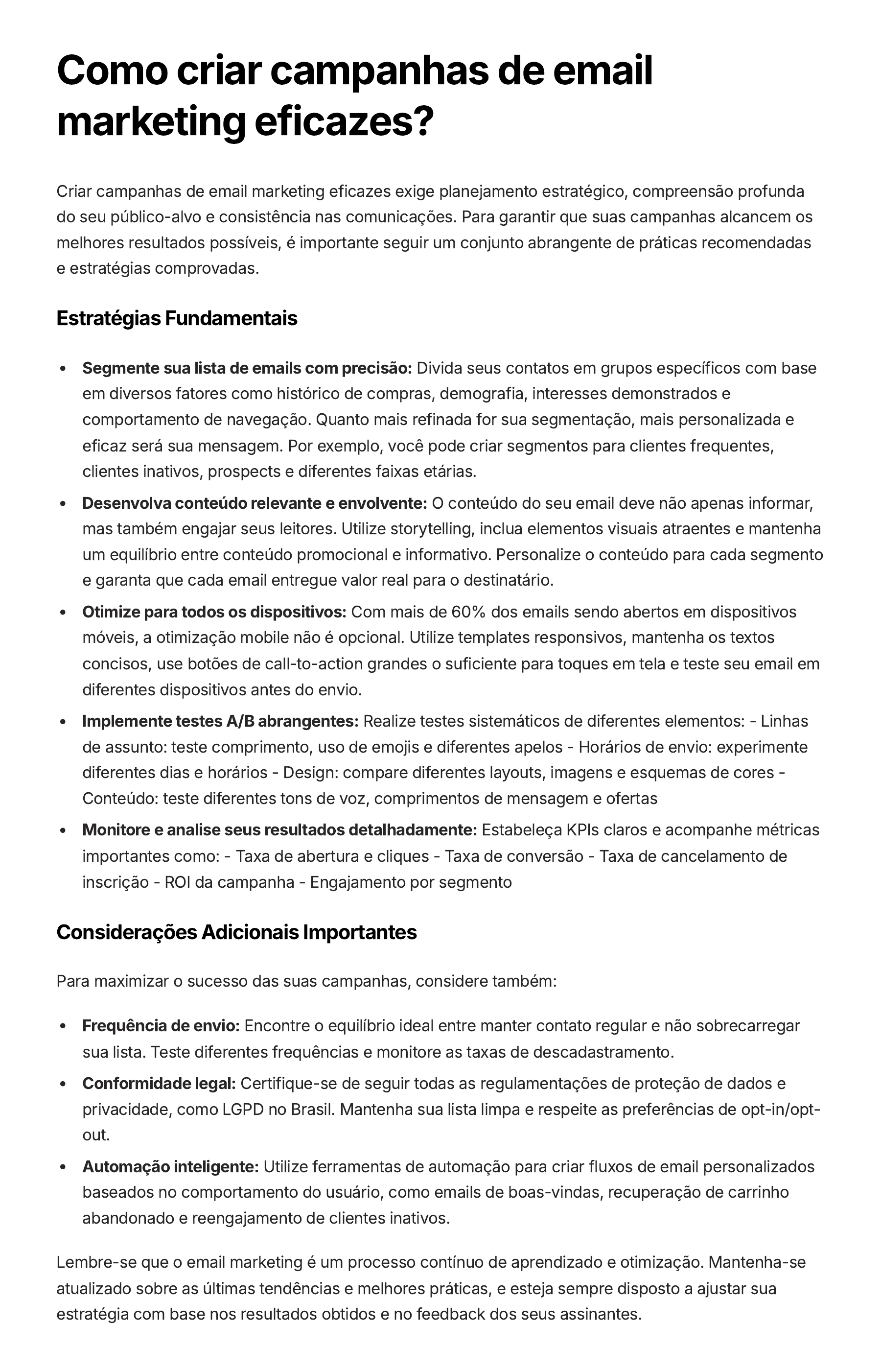 Como criar campanhas de email marketing eficazes? Criar campanhas de email marketing eficazes exige planejamento estratégico, compreensão profunda do seu público-alvo e consistência nas comunicações. Para garantir que suas campanhas alcancem os melhores resultados possíveis, é importante seguir um conjunto abrangente de práticas recomendadas e estratégias comprovadas. Estratégias Fundamentais Segmente sua lista de emails com precisão: Divida seus contatos em grupos específicos com base em diversos fatores como histórico de compras, demografia, interesses demonstrados e comportamento de navegação. Quanto mais refinada for sua segmentação, mais personalizada e eficaz será sua mensagem. Por exemplo, você pode criar segmentos para clientes frequentes, clientes inativos, prospects e diferentes faixas etárias. Desenvolva conteúdo relevante e envolvente: O conteúdo do seu email deve não apenas informar, mas também engajar seus leitores. Utilize storytelling, inclua elementos visuais atraentes e mantenha um equilíbrio entre conteúdo promocional e informativo. Personalize o conteúdo para cada segmento e garanta que cada email entregue valor real para o destinatário. Otimize para todos os dispositivos: Com mais de 60% dos emails sendo abertos em dispositivos móveis, a otimização mobile não é opcional. Utilize templates responsivos, mantenha os textos concisos, use botões de call-to-action grandes o suficiente para toques em tela e teste seu email em diferentes dispositivos antes do envio. Implemente testes A/B abrangentes: Realize testes sistemáticos de diferentes elementos: - Linhas de assunto: teste comprimento, uso de emojis e diferentes apelos - Horários de envio: experimente diferentes dias e horários - Design: compare diferentes layouts, imagens e esquemas de cores - Conteúdo: teste diferentes tons de voz, comprimentos de mensagem e ofertas Monitore e analise seus resultados detalhadamente: Estabeleça KPIs claros e acompanhe métricas importantes como: - Taxa de abertura e cliques - Taxa de conversão - Taxa de cancelamento de inscrição - ROI da campanha - Engajamento por segmento Considerações Adicionais Importantes Para maximizar o sucesso das suas campanhas, considere também: Frequência de envio: Encontre o equilíbrio ideal entre manter contato regular e não sobrecarregar sua lista. Teste diferentes frequências e monitore as taxas de descadastramento. Conformidade legal: Certifique-se de seguir todas as regulamentações de proteção de dados e privacidade, como LGPD no Brasil. Mantenha sua lista limpa e respeite as preferências de opt-in/opt- out. Automação inteligente: Utilize ferramentas de automação para criar fluxos de email personalizados baseados no comportamento do usuário, como emails de boas-vindas, recuperação de carrinho abandonado e reengajamento de clientes inativos. Lembre-se que o email marketing é um processo contínuo de aprendizado e otimização. Mantenha-se atualizado sobre as últimas tendências e melhores práticas, e esteja sempre disposto a ajustar sua estratégia com base nos resultados obtidos e no feedback dos seus assinantes.