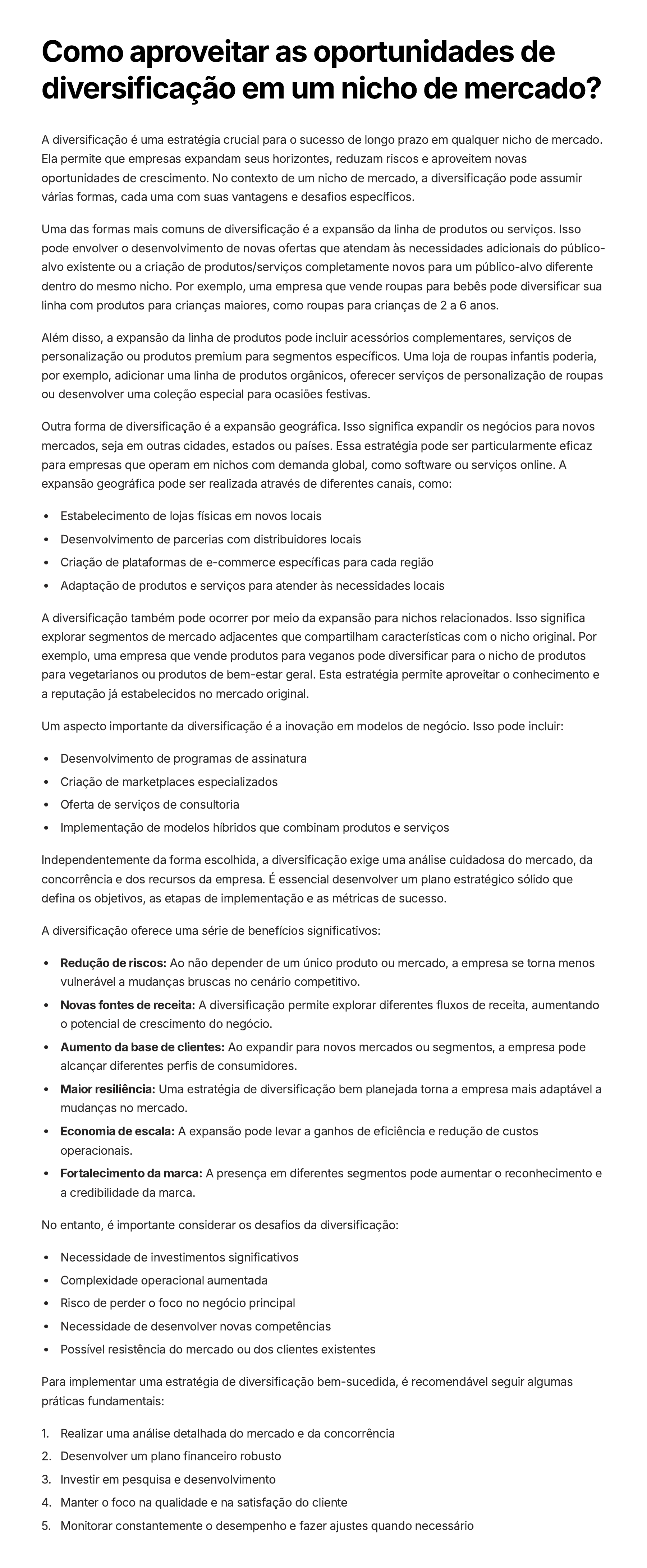 Como aproveitar as oportunidades de diversificação em um nicho de mercado? A diversificação é uma estratégia crucial para o sucesso de longo prazo em qualquer nicho de mercado. Ela permite que empresas expandam seus horizontes, reduzam riscos e aproveitem novas oportunidades de crescimento. No contexto de um nicho de mercado, a diversificação pode assumir várias formas, cada uma com suas vantagens e desafios específicos. Uma das formas mais comuns de diversificação é a expansão da linha de produtos ou serviços. Isso pode envolver o desenvolvimento de novas ofertas que atendam às necessidades adicionais do público- alvo existente ou a criação de produtos/serviços completamente novos para um público-alvo diferente dentro do mesmo nicho. Por exemplo, uma empresa que vende roupas para bebês pode diversificar sua linha com produtos para crianças maiores, como roupas para crianças de 2 a 6 anos. Além disso, a expansão da linha de produtos pode incluir acessórios complementares, serviços de personalização ou produtos premium para segmentos específicos. Uma loja de roupas infantis poderia, por exemplo, adicionar uma linha de produtos orgânicos, oferecer serviços de personalização de roupas ou desenvolver uma coleção especial para ocasiões festivas. Outra forma de diversificação é a expansão geográfica. Isso significa expandir os negócios para novos mercados, seja em outras cidades, estados ou países. Essa estratégia pode ser particularmente eficaz para empresas que operam em nichos com demanda global, como software ou serviços online. A expansão geográfica pode ser realizada através de diferentes canais, como: Estabelecimento de lojas físicas em novos locais Desenvolvimento de parcerias com distribuidores locais Criação de plataformas de e-commerce específicas para cada região Adaptação de produtos e serviços para atender às necessidades locais A diversificação também pode ocorrer por meio da expansão para nichos relacionados. Isso significa explorar segmentos de mercado adjacentes que compartilham características com o nicho original. Por exemplo, uma empresa que vende produtos para veganos pode diversificar para o nicho de produtos para vegetarianos ou produtos de bem-estar geral. Esta estratégia permite aproveitar o conhecimento e a reputação já estabelecidos no mercado original. Um aspecto importante da diversificação é a inovação em modelos de negócio. Isso pode incluir: Desenvolvimento de programas de assinatura Criação de marketplaces especializados Oferta de serviços de consultoria Implementação de modelos híbridos que combinam produtos e serviços Independentemente da forma escolhida, a diversificação exige uma análise cuidadosa do mercado, da concorrência e dos recursos da empresa. É essencial desenvolver um plano estratégico sólido que defina os objetivos, as etapas de implementação e as métricas de sucesso. A diversificação oferece uma série de benefícios significativos: Redução de riscos: Ao não depender de um único produto ou mercado, a empresa se torna menos vulnerável a mudanças bruscas no cenário competitivo. Novas fontes de receita: A diversificação permite explorar diferentes fluxos de receita, aumentando o potencial de crescimento do negócio. Aumento da base de clientes: Ao expandir para novos mercados ou segmentos, a empresa pode alcançar diferentes perfis de consumidores. Maior resiliência: Uma estratégia de diversificação bem planejada torna a empresa mais adaptável a mudanças no mercado. Economia de escala: A expansão pode levar a ganhos de eficiência e redução de custos operacionais. Fortalecimento da marca: A presença em diferentes segmentos pode aumentar o reconhecimento e a credibilidade da marca. No entanto, é importante considerar os desafios da diversificação: Necessidade de investimentos significativos Complexidade operacional aumentada Risco de perder o foco no negócio principal Necessidade de desenvolver novas competências Possível resistência do mercado ou dos clientes existentes Para implementar uma estratégia de diversificação bem-sucedida, é recomendável seguir algumas práticas fundamentais: Realizar uma análise detalhada do mercado e da concorrência1. Desenvolver um plano financeiro robusto2. Investir em pesquisa e desenvolvimento3. Manter o foco na qualidade e na satisfação do cliente4. Monitorar constantemente o desempenho e fazer ajustes quando necessário5.