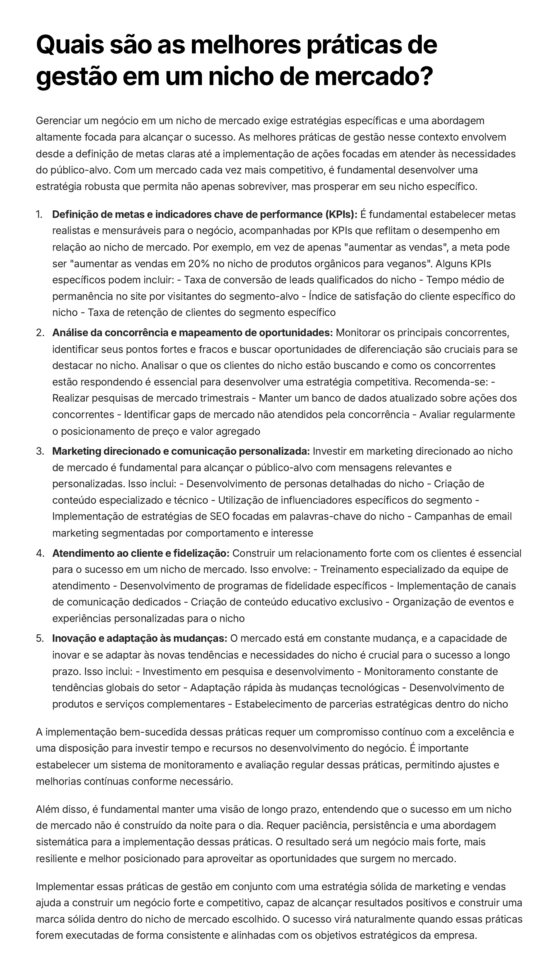 Quais são as melhores práticas de gestão em um nicho de mercado? Gerenciar um negócio em um nicho de mercado exige estratégias específicas e uma abordagem altamente focada para alcançar o sucesso. As melhores práticas de gestão nesse contexto envolvem desde a definição de metas claras até a implementação de ações focadas em atender às necessidades do público-alvo. Com um mercado cada vez mais competitivo, é fundamental desenvolver uma estratégia robusta que permita não apenas sobreviver, mas prosperar em seu nicho específico. Definição de metas e indicadores chave de performance (KPIs): É fundamental estabelecer metas realistas e mensuráveis para o negócio, acompanhadas por KPIs que reflitam o desempenho em relação ao nicho de mercado. Por exemplo, em vez de apenas "aumentar as vendas", a meta pode ser "aumentar as vendas em 20% no nicho de produtos orgânicos para veganos". Alguns KPIs específicos podem incluir: - Taxa de conversão de leads qualificados do nicho - Tempo médio de permanência no site por visitantes do segmento-alvo - Índice de satisfação do cliente específico do nicho - Taxa de retenção de clientes do segmento específico 1. Análise da concorrência e mapeamento de oportunidades: Monitorar os principais concorrentes, identificar seus pontos fortes e fracos e buscar oportunidades de diferenciação são cruciais para se destacar no nicho. Analisar o que os clientes do nicho estão buscando e como os concorrentes estão respondendo é essencial para desenvolver uma estratégia competitiva. Recomenda-se: - Realizar pesquisas de mercado trimestrais - Manter um banco de dados atualizado sobre ações dos concorrentes - Identificar gaps de mercado não atendidos pela concorrência - Avaliar regularmente o posicionamento de preço e valor agregado 2. Marketing direcionado e comunicação personalizada: Investir em marketing direcionado ao nicho de mercado é fundamental para alcançar o público-alvo com mensagens relevantes e personalizadas. Isso inclui: - Desenvolvimento de personas detalhadas do nicho - Criação de conteúdo especializado e técnico - Utilização de influenciadores específicos do segmento - Implementação de estratégias de SEO focadas em palavras-chave do nicho - Campanhas de email marketing segmentadas por comportamento e interesse 3. Atendimento ao cliente e fidelização: Construir um relacionamento forte com os clientes é essencial para o sucesso em um nicho de mercado. Isso envolve: - Treinamento especializado da equipe de atendimento - Desenvolvimento de programas de fidelidade específicos - Implementação de canais de comunicação dedicados - Criação de conteúdo educativo exclusivo - Organização de eventos e experiências personalizadas para o nicho 4. Inovação e adaptação às mudanças: O mercado está em constante mudança, e a capacidade de inovar e se adaptar às novas tendências e necessidades do nicho é crucial para o sucesso a longo prazo. Isso inclui: - Investimento em pesquisa e desenvolvimento - Monitoramento constante de tendências globais do setor - Adaptação rápida às mudanças tecnológicas - Desenvolvimento de produtos e serviços complementares - Estabelecimento de parcerias estratégicas dentro do nicho 5. A implementação bem-sucedida dessas práticas requer um compromisso contínuo com a excelência e uma disposição para investir tempo e recursos no desenvolvimento do negócio. É importante estabelecer um sistema de monitoramento e avaliação regular dessas práticas, permitindo ajustes e melhorias contínuas conforme necessário. Além disso, é fundamental manter uma visão de longo prazo, entendendo que o sucesso em um nicho de mercado não é construído da noite para o dia. Requer paciência, persistência e uma abordagem sistemática para a implementação dessas práticas. O resultado será um negócio mais forte, mais resiliente e melhor posicionado para aproveitar as oportunidades que surgem no mercado. Implementar essas práticas de gestão em conjunto com uma estratégia sólida de marketing e vendas ajuda a construir um negócio forte e competitivo, capaz de alcançar resultados positivos e construir uma marca sólida dentro do nicho de mercado escolhido. O sucesso virá naturalmente quando essas práticas forem executadas de forma consistente e alinhadas com os objetivos estratégicos da empresa.