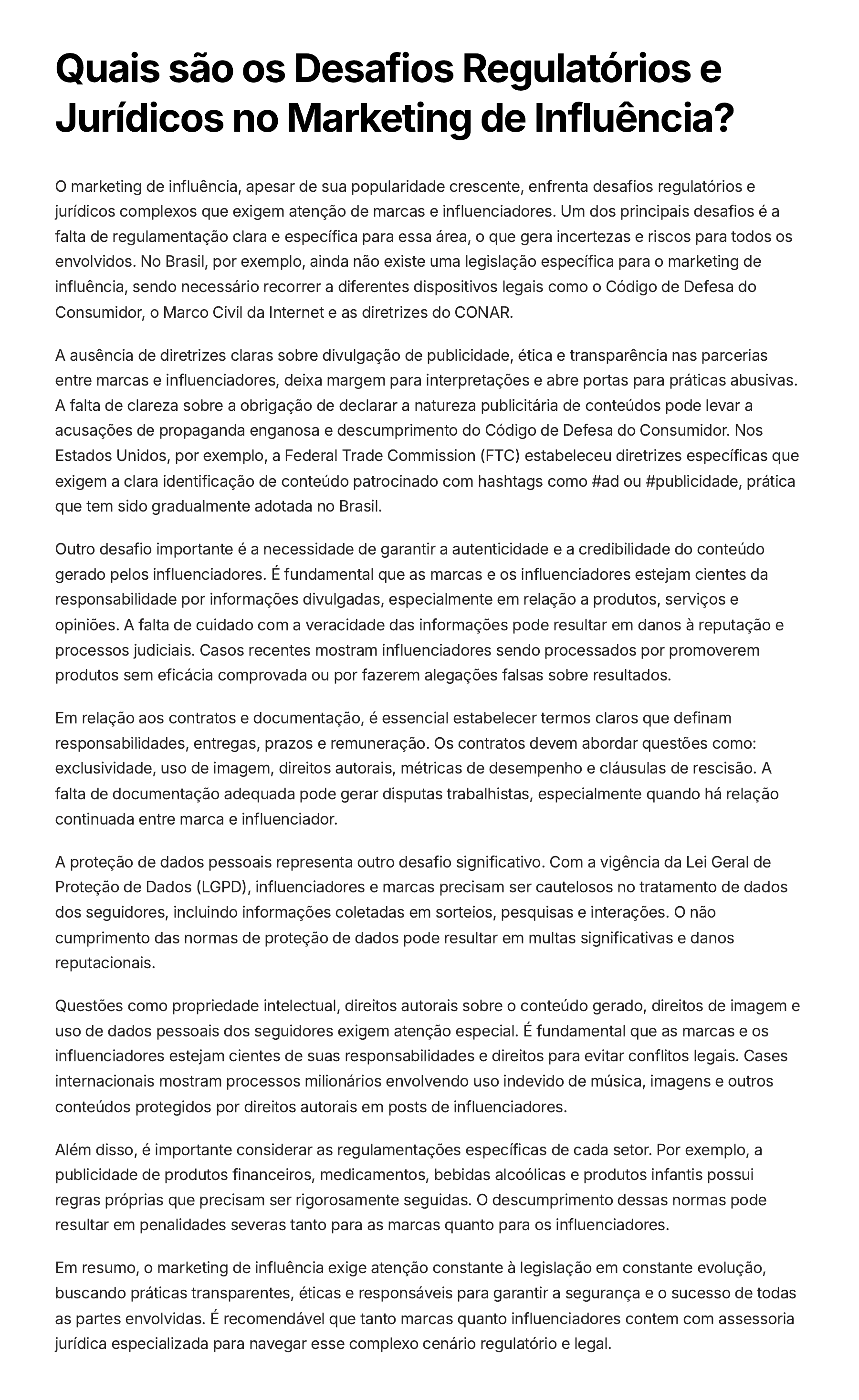 Quais são os Desafios Regulatórios e Jurídicos no Marketing de Influência? O marketing de influência, apesar de sua popularidade crescente, enfrenta desafios regulatórios e jurídicos complexos que exigem atenção de marcas e influenciadores. Um dos principais desafios é a falta de regulamentação clara e específica para essa área, o que gera incertezas e riscos para todos os envolvidos. No Brasil, por exemplo, ainda não existe uma legislação específica para o marketing de influência, sendo necessário recorrer a diferentes dispositivos legais como o Código de Defesa do Consumidor, o Marco Civil da Internet e as diretrizes do CONAR. A ausência de diretrizes claras sobre divulgação de publicidade, ética e transparência nas parcerias entre marcas e influenciadores, deixa margem para interpretações e abre portas para práticas abusivas. A falta de clareza sobre a obrigação de declarar a natureza publicitária de conteúdos pode levar a acusações de propaganda enganosa e descumprimento do Código de Defesa do Consumidor. Nos Estados Unidos, por exemplo, a Federal Trade Commission (FTC) estabeleceu diretrizes específicas que exigem a clara identificação de conteúdo patrocinado com hashtags como #ad ou #publicidade, prática que tem sido gradualmente adotada no Brasil. Outro desafio importante é a necessidade de garantir a autenticidade e a credibilidade do conteúdo gerado pelos influenciadores. É fundamental que as marcas e os influenciadores estejam cientes da responsabilidade por informações divulgadas, especialmente em relação a produtos, serviços e opiniões. A falta de cuidado com a veracidade das informações pode resultar em danos à reputação e processos judiciais. Casos recentes mostram influenciadores sendo processados por promoverem produtos sem eficácia comprovada ou por fazerem alegações falsas sobre resultados. Em relação aos contratos e documentação, é essencial estabelecer termos claros que definam responsabilidades, entregas, prazos e remuneração. Os contratos devem abordar questões como: exclusividade, uso de imagem, direitos autorais, métricas de desempenho e cláusulas de rescisão. A falta de documentação adequada pode gerar disputas trabalhistas, especialmente quando há relação continuada entre marca e influenciador. A proteção de dados pessoais representa outro desafio significativo. Com a vigência da Lei Geral de Proteção de Dados (LGPD), influenciadores e marcas precisam ser cautelosos no tratamento de dados dos seguidores, incluindo informações coletadas em sorteios, pesquisas e interações. O não cumprimento das normas de proteção de dados pode resultar em multas significativas e danos reputacionais. Questões como propriedade intelectual, direitos autorais sobre o conteúdo gerado, direitos de imagem e uso de dados pessoais dos seguidores exigem atenção especial. É fundamental que as marcas e os influenciadores estejam cientes de suas responsabilidades e direitos para evitar conflitos legais. Cases internacionais mostram processos milionários envolvendo uso indevido de música, imagens e outros conteúdos protegidos por direitos autorais em posts de influenciadores. Além disso, é importante considerar as regulamentações específicas de cada setor. Por exemplo, a publicidade de produtos financeiros, medicamentos, bebidas alcoólicas e produtos infantis possui regras próprias que precisam ser rigorosamente seguidas. O descumprimento dessas normas pode resultar em penalidades severas tanto para as marcas quanto para os influenciadores. Em resumo, o marketing de influência exige atenção constante à legislação em constante evolução, buscando práticas transparentes, éticas e responsáveis para garantir a segurança e o sucesso de todas as partes envolvidas. É recomendável que tanto marcas quanto influenciadores contem com assessoria jurídica especializada para navegar esse complexo cenário regulatório e legal.