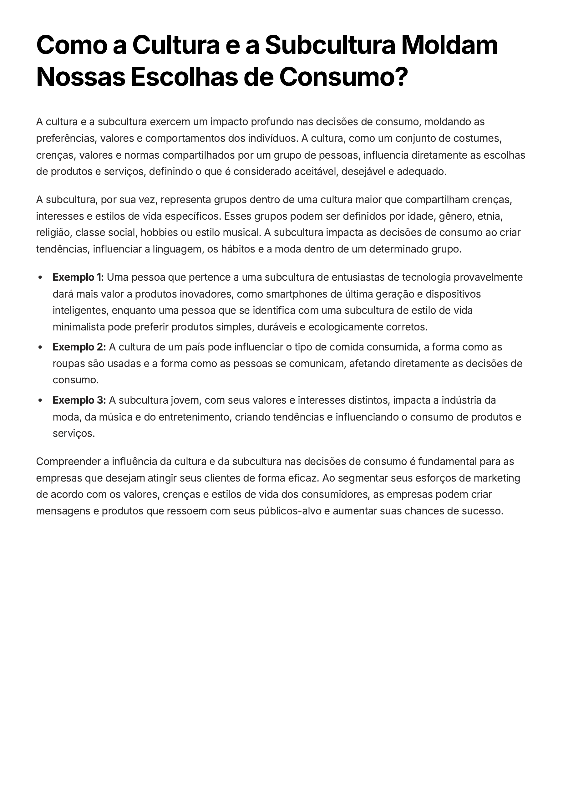Como a Cultura e a Subcultura Moldam Nossas Escolhas de Consumo? A cultura e a subcultura exercem um impacto profundo nas decisões de consumo, moldando as preferências, valores e comportamentos dos indivíduos. A cultura, como um conjunto de costumes, crenças, valores e normas compartilhados por um grupo de pessoas, influencia diretamente as escolhas de produtos e serviços, definindo o que é considerado aceitável, desejável e adequado. A subcultura, por sua vez, representa grupos dentro de uma cultura maior que compartilham crenças, interesses e estilos de vida específicos. Esses grupos podem ser definidos por idade, gênero, etnia, religião, classe social, hobbies ou estilo musical. A subcultura impacta as decisões de consumo ao criar tendências, influenciar a linguagem, os hábitos e a moda dentro de um determinado grupo. Exemplo 1: Uma pessoa que pertence a uma subcultura de entusiastas de tecnologia provavelmente dará mais valor a produtos inovadores, como smartphones de última geração e dispositivos inteligentes, enquanto uma pessoa que se identifica com uma subcultura de estilo de vida minimalista pode preferir produtos simples, duráveis e ecologicamente corretos. Exemplo 2: A cultura de um país pode influenciar o tipo de comida consumida, a forma como as roupas são usadas e a forma como as pessoas se comunicam, afetando diretamente as decisões de consumo. Exemplo 3: A subcultura jovem, com seus valores e interesses distintos, impacta a indústria da moda, da música e do entretenimento, criando tendências e influenciando o consumo de produtos e serviços. Compreender a influência da cultura e da subcultura nas decisões de consumo é fundamental para as empresas que desejam atingir seus clientes de forma eficaz. Ao segmentar seus esforços de marketing de acordo com os valores, crenças e estilos de vida dos consumidores, as empresas podem criar mensagens e produtos que ressoem com seus públicos-alvo e aumentar suas chances de sucesso. Como a Classe Social Determina Nossos Padrões de Consumo e Escolhas de Marcas? A classe social, um conceito complexo que engloba aspectos como renda, educação, profissão e estilo de vida, exerce influência significativa nas decisões de consumo. Essa influência se manifesta em diversos níveis, desde a escolha de produtos básicos até a preferência por serviços e experiências. Consumidores de diferentes classes sociais tendem a priorizar valores e necessidades distintas. Por exemplo, indivíduos de classes sociais mais altas podem buscar bens de luxo, exclusividade e status, enquanto aqueles de classes mais baixas podem se concentrar em produtos essenciais e acessíveis. Essa diferenciação se estende também à escolha de serviços, como educação, saúde e entretenimento. A influência da classe social no consumo pode ser observada na forma como os indivíduos se vestem, nos locais que frequentam, nos tipos de carros que dirigem e nos hobbies que praticam. As marcas que os consumidores escolhem também refletem sua classe social, com algumas marcas sendo associadas a grupos específicos e estilos de vida. É fundamental que as empresas compreendam o impacto da classe social no comportamento de compra para desenvolver estratégias de marketing eficazes. Segmentar o mercado por classe social permite direcionar mensagens e produtos específicos para grupos com necessidades e expectativas semelhantes, otimizando a comunicação e o investimento. Como os Grupos de Referência Moldam Nossas Decisões de Compra? Os grupos de referência exercem um papel fundamental no comportamento de compra, influenciando as escolhas dos consumidores de diversas maneiras. Eles representam um conjunto de pessoas que servem como ponto de comparação e referência para a formação de valores, atitudes e comportamentos, impactando diretamente as decisões de consumo. Influência Informativa: Quando um consumidor busca informações e orientação de um grupo de referência sobre um determinado produto ou serviço, a influência é informativa. Por exemplo, consultar um amigo que é especialista em tecnologia antes de comprar um novo smartphone. Influência Comparativa: A influência comparativa ocorre quando o consumidor se compara a membros de um grupo de referência e ajusta suas atitudes e comportamentos para se assemelhar a eles. Por exemplo, comprar a mesma marca de roupa que seus colegas de trabalho usam. Influência Normativa: A influência normativa ocorre quando o consumidor sente pressão social para se conformar às normas e expectativas de um grupo de referência, para evitar rejeição ou obter aprovação. Por exemplo, comprar um carro de luxo para impressionar amigos e familiares. Influência de Assimilação: O consumidor identifica-se fortemente com o grupo de referência e adota seus valores e comportamentos. Por exemplo, um fã de esportes comprar produtos da marca patrocinadora do time. Compreender a influência dos grupos de referência é crucial para as estratégias de marketing. As empresas podem se conectar com os consumidores por meio de influenciadores digitais, embaixadores de marca e ações de marketing direcionadas a grupos específicos.