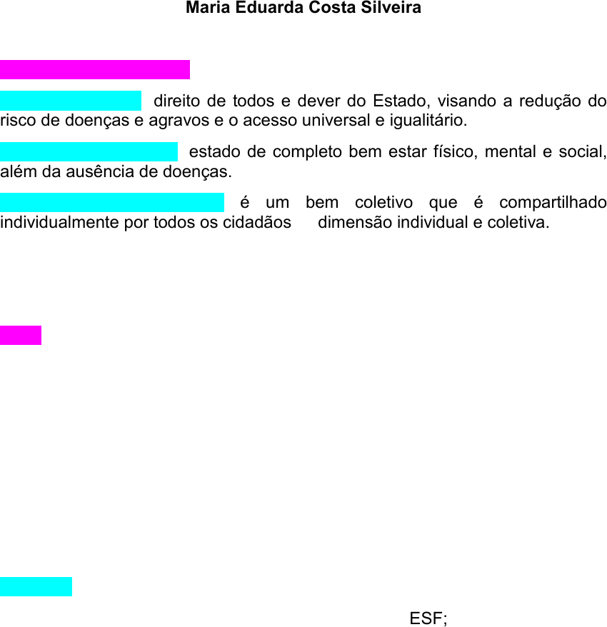 RESUMO IESC Maria Eduarda Costa Silveira CONCEITO DE SAÚDE: Conceito político: direito de todos e dever do Estado, visando a redução do risco de doenças e agravos e o acesso universal e igualitário. Conceito para a OMS: estado de completo bem estar físico, mental e social, além da ausência de doenças. Conceito contemporâneo: é um bem coletivo que é compartilhado individualmente por todos os cidadãos dimensão individual e coletiva. Exemplo: vizinho que deixa a água parada no quintal e pode acarretar em dengue na vizinhança toda. SUS: É uma formulação política e organizacional para o reordenamento dos serviços e ações em saúde estabelecida pela Constituição de 1988 e posteriormente pelas leis que o regulamentam (Lei 8.080 e 8.142). É um modelo social democrata. Obs¹: os SUS surgiu em 1988, mas “nasceu” em 1990. Obs²: o SUS está em todos os lugares (motéis – camisinha, cachorro quente, shampoo, pizzaria, etc). Obs³: depois que foi instituído, a mortalidade materna e infantil diminiu. É o sistema de saúde que mais faz transplantes e imunizações no mundo, tem o maior programa contra DST e realiza mais de 1,5 milhões de atendimentos por dia. Desafios: Ampliação da cobertura e correta utilização da ESF; Visão de Políticas Públicas de Saúde de forma regionalizada e não apenas municipalista; Redução da cultura hospitalar; Sensibilizar a população sobre sua responsabilidade no processo de saúde-doença; Falta de conhecimento da população; Cortes de recursos nas áreas de pesquisa, ciência, tecnologia e humanidades; Financiamento; Concorrência com o setor privado (troca de receitas e exames); Valorização dos profissionais; Número elevado de exames mal prescritos (negativos); Garantia de estrutura adequada para o bom funcionamento do sistema; Leitos de CTI. DETERMINANTES SOCIAIS DA SAÚDE (DSS): Fatores sociais, econômicos, culturais, psicológicos, comportamentais e étnicos/raciais moradia, alimentação, emprego, renda e escolaridade. Biologia humana (20%), estilo de vida (51%), ambiente (19%) e serviços de saúde (10%). CAUSA DAS CAUSAS: determinações socioeconômicas mais gerais do processo saúde-doença. Intervenções: ações no sistema de atenção à saúde, ampliação da autonomia dos sujeitos, mudança nos modelos assistenciais e nas condições socioeconômicas, ambientais e culturais através da intersetorialidade e subordinação da economia ao bem-estar social (distribuição mais equânime dos recursos). COMISSÃO NACIONAL SOBRE OS DETERMINANTES SOCIAIS DA SAÚDE (CNDSS): Brasil, 2006 – decreto presidencial. As intervenções sobre DSS devem promover a equidade em saúde. Objetivos: produzir conhecimentos, apoiar o desenvolvimento de políticas e programas, e promover atividades de mobilização da sociedade civil. PROMOÇÃO x PREVENÇÃO: Promoção: evitar o surgimento de determinada situação. Não tem um público alvo; Ações desenvolvidas para o bem estar coletivo; Medidas que visem a aumentar a saúde e o bem estar sem foco em doença específica. Exemplos: palestras em escolas sobre determinado assunto; não deixar água parada para não causar dengue; incentivo à alimentação saudável, à prática de exercícios físicos e ao abandono do tabaco e do álcool. Prevenção: evitar o agravamento de determinada situação e tem até 5 estágios. Tem público alvo; Ação antecipada evitar o surgimento de doenças específicas; Exemplos: cuidados que o diabético tem que ter no dia a dia; exercício físico e dieta para obesos não desenvolverem obesidade mórbida; evitar a transmissão de uma determinada doença infecciosa. NÍVEIS DE ATENÇÃO À SAÚDE: 1. ATENÇÃO PRIMÁRIA À SAÚDE: são ações, de caráter individual ou coletivo, relacionadas à promoção da saúde, à prevenção de agravos, o tratamento e a reabilitação. Concentra as ações relacionadas à diminuição do risco de doenças e à proteção da saúde. Exemplo: imunização, dieta e exercício físico para obesos. É a maior rede de serviços de saúde (+ 36 mil unidades). É capaz de resolver 85% dos problemas de saúde quando estão em bom funcionamento, evitando internações desnecessárias e melhorando a qualidade de vida da população. Responde de forma regionalizada, contínua e sistematizada. Porta de entrada dos usuários no SUS. Funciona como um filtro capaz de organizar o fluxo de serviços nas redes de saúde. Há uma continuidade da relação médico-paciente ao longo da vida, independentemente se o paciente está doente ou não. Abordagem integral e universal das pessoas. Reconhecimento do amplo espectro de necessidades da população. Acolhimento: Vínculo entre profissional e paciente, com responsabilidade, resolutividade e autonomização. UBS. PERÍODO DE PRÉ-PATOGÊNESE: as manifestações clínicas da doença ainda não se manifestaram, mas as condições para o desenvolvimento da doença já existem no indivíduo ou no ambiente em que ele vive. ÉTICA NA ATENÇÃO PRIMÁRIA À SAÚDE: beneficência (fazer o bem), não maleficência (evitar danos), autonomia (a pessoa escolhe) e justiça (priorizar com equidade). 2. ATENÇÃO SECUNDÁRIA À SAÚDE: diagnóstico precoce, tratamento imediato, diminuindo complicações e morte. Clínicas especializadas, urgência e emergência. Exemplo: rastreamento, mamografia de rotina, diagnóstico precoce. Ambulatórios, policlínicas, centros de especialidades médicas. PERÍODO DE PATOGÊNESE: processos mórbidos são reconhecíveis e são foco de ações para evitar ou retardar a sua progressão. 3. ATENÇÃO TERCIÁRIA À SAÚDE: recuperação e reabilitação do indivíduo de sequelas deixadas pela doença. Serviços de alta complexidade. Exemplo: cirurgias, prevenir complicações do diabetes e da obesidade, reabilitar pacientes após IAM ou AVC. Hospital, serviços de urgência e emergência, UPA (ponto de equilíbrio entre nível secundário e terciário, mas 