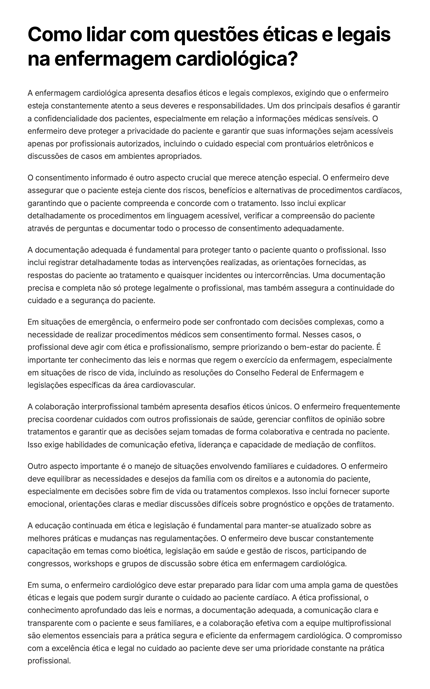 Como lidar com questões éticas e legais na enfermagem cardiológica? A enfermagem cardiológica apresenta desafios éticos e legais complexos, exigindo que o enfermeiro esteja constantemente atento a seus deveres e responsabilidades. Um dos principais desafios é garantir a confidencialidade dos pacientes, especialmente em relação a informações médicas sensíveis. O enfermeiro deve proteger a privacidade do paciente e garantir que suas informações sejam acessíveis apenas por profissionais autorizados, incluindo o cuidado especial com prontuários eletrônicos e discussões de casos em ambientes apropriados. O consentimento informado é outro aspecto crucial que merece atenção especial. O enfermeiro deve assegurar que o paciente esteja ciente dos riscos, benefícios e alternativas de procedimentos cardíacos, garantindo que o paciente compreenda e concorde com o tratamento. Isso inclui explicar detalhadamente os procedimentos em linguagem acessível, verificar a compreensão do paciente através de perguntas e documentar todo o processo de consentimento adequadamente. A documentação adequada é fundamental para proteger tanto o paciente quanto o profissional. Isso inclui registrar detalhadamente todas as intervenções realizadas, as orientações fornecidas, as respostas do paciente ao tratamento e quaisquer incidentes ou intercorrências. Uma documentação precisa e completa não só protege legalmente o profissional, mas também assegura a continuidade do cuidado e a segurança do paciente. Em situações de emergência, o enfermeiro pode ser confrontado com decisões complexas, como a necessidade de realizar procedimentos médicos sem consentimento formal. Nesses casos, o profissional deve agir com ética e profissionalismo, sempre priorizando o bem-estar do paciente. É importante ter conhecimento das leis e normas que regem o exercício da enfermagem, especialmente em situações de risco de vida, incluindo as resoluções do Conselho Federal de Enfermagem e legislações específicas da área cardiovascular. A colaboração interprofissional também apresenta desafios éticos únicos. O enfermeiro frequentemente precisa coordenar cuidados com outros profissionais de saúde, gerenciar conflitos de opinião sobre tratamentos e garantir que as decisões sejam tomadas de forma colaborativa e centrada no paciente. Isso exige habilidades de comunicação efetiva, liderança e capacidade de mediação de conflitos. Outro aspecto importante é o manejo de situações envolvendo familiares e cuidadores. O enfermeiro deve equilibrar as necessidades e desejos da família com os direitos e a autonomia do paciente, especialmente em decisões sobre fim de vida ou tratamentos complexos. Isso inclui fornecer suporte emocional, orientações claras e mediar discussões difíceis sobre prognóstico e opções de tratamento. A educação continuada em ética e legislação é fundamental para manter-se atualizado sobre as melhores práticas e mudanças nas regulamentações. O enfermeiro deve buscar constantemente capacitação em temas como bioética, legislação em saúde e gestão de riscos, participando de congressos, workshops e grupos de discussão sobre ética em enfermagem cardiológica. Em suma, o enfermeiro cardiológico deve estar preparado para lidar com uma ampla gama de questões éticas e legais que podem surgir durante o cuidado ao paciente cardíaco. A ética profissional, o conhecimento aprofundado das leis e normas, a documentação adequada, a comunicação clara e transparente com o paciente e seus familiares, e a colaboração efetiva com a equipe multiprofissional são elementos essenciais para a prática segura e eficiente da enfermagem cardiológica. O compromisso com a excelência ética e legal no cuidado ao paciente deve ser uma prioridade constante na prática profissional.