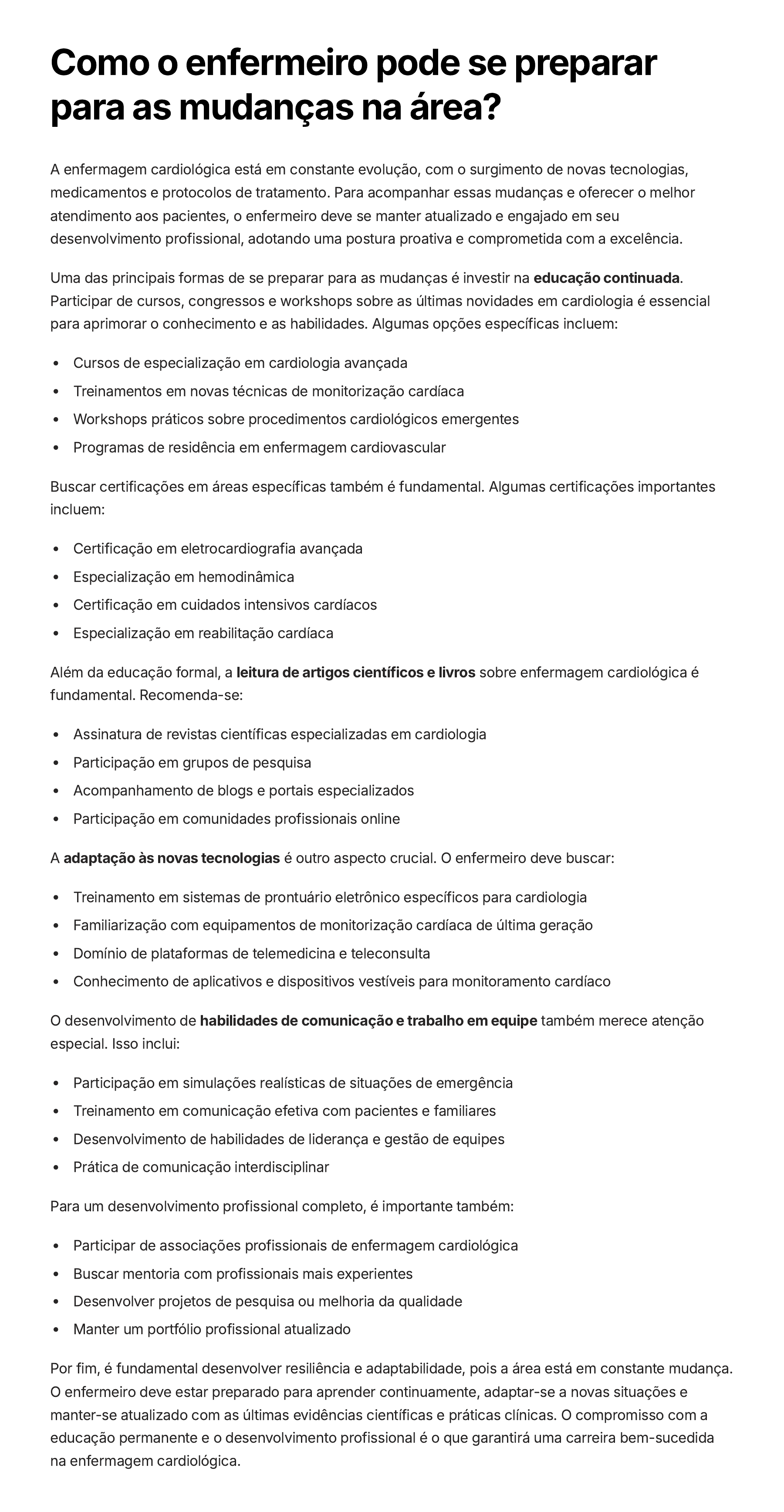 Como o enfermeiro pode se preparar para as mudanças na área? A enfermagem cardiológica está em constante evolução, com o surgimento de novas tecnologias, medicamentos e protocolos de tratamento. Para acompanhar essas mudanças e oferecer o melhor atendimento aos pacientes, o enfermeiro deve se manter atualizado e engajado em seu desenvolvimento profissional, adotando uma postura proativa e comprometida com a excelência. Uma das principais formas de se preparar para as mudanças é investir na educação continuada. Participar de cursos, congressos e workshops sobre as últimas novidades em cardiologia é essencial para aprimorar o conhecimento e as habilidades. Algumas opções específicas incluem: Cursos de especialização em cardiologia avançada Treinamentos em novas técnicas de monitorização cardíaca Workshops práticos sobre procedimentos cardiológicos emergentes Programas de residência em enfermagem cardiovascular Buscar certificações em áreas específicas também é fundamental. Algumas certificações importantes incluem: Certificação em eletrocardiografia avançada Especialização em hemodinâmica Certificação em cuidados intensivos cardíacos Especialização em reabilitação cardíaca Além da educação formal, a leitura de artigos científicos e livros sobre enfermagem cardiológica é fundamental. Recomenda-se: Assinatura de revistas científicas especializadas em cardiologia Participação em grupos de pesquisa Acompanhamento de blogs e portais especializados Participação em comunidades profissionais online A adaptação às novas tecnologias é outro aspecto crucial. O enfermeiro deve buscar: Treinamento em sistemas de prontuário eletrônico específicos para cardiologia Familiarização com equipamentos de monitorização cardíaca de última geração Domínio de plataformas de telemedicina e teleconsulta Conhecimento de aplicativos e dispositivos vestíveis para monitoramento cardíaco O desenvolvimento de habilidades de comunicação e trabalho em equipe também merece atenção especial. Isso inclui: Participação em simulações realísticas de situações de emergência Treinamento em comunicação efetiva com pacientes e familiares Desenvolvimento de habilidades de liderança e gestão de equipes Prática de comunicação interdisciplinar Para um desenvolvimento profissional completo, é importante também: Participar de associações profissionais de enfermagem cardiológica Buscar mentoria com profissionais mais experientes Desenvolver projetos de pesquisa ou melhoria da qualidade Manter um portfólio profissional atualizado Por fim, é fundamental desenvolver resiliência e adaptabilidade, pois a área está em constante mudança. O enfermeiro deve estar preparado para aprender continuamente, adaptar-se a novas situações e manter-se atualizado com as últimas evidências científicas e práticas clínicas. O compromisso com a educação permanente e o desenvolvimento profissional é o que garantirá uma carreira bem-sucedida na enfermagem cardiológica.
