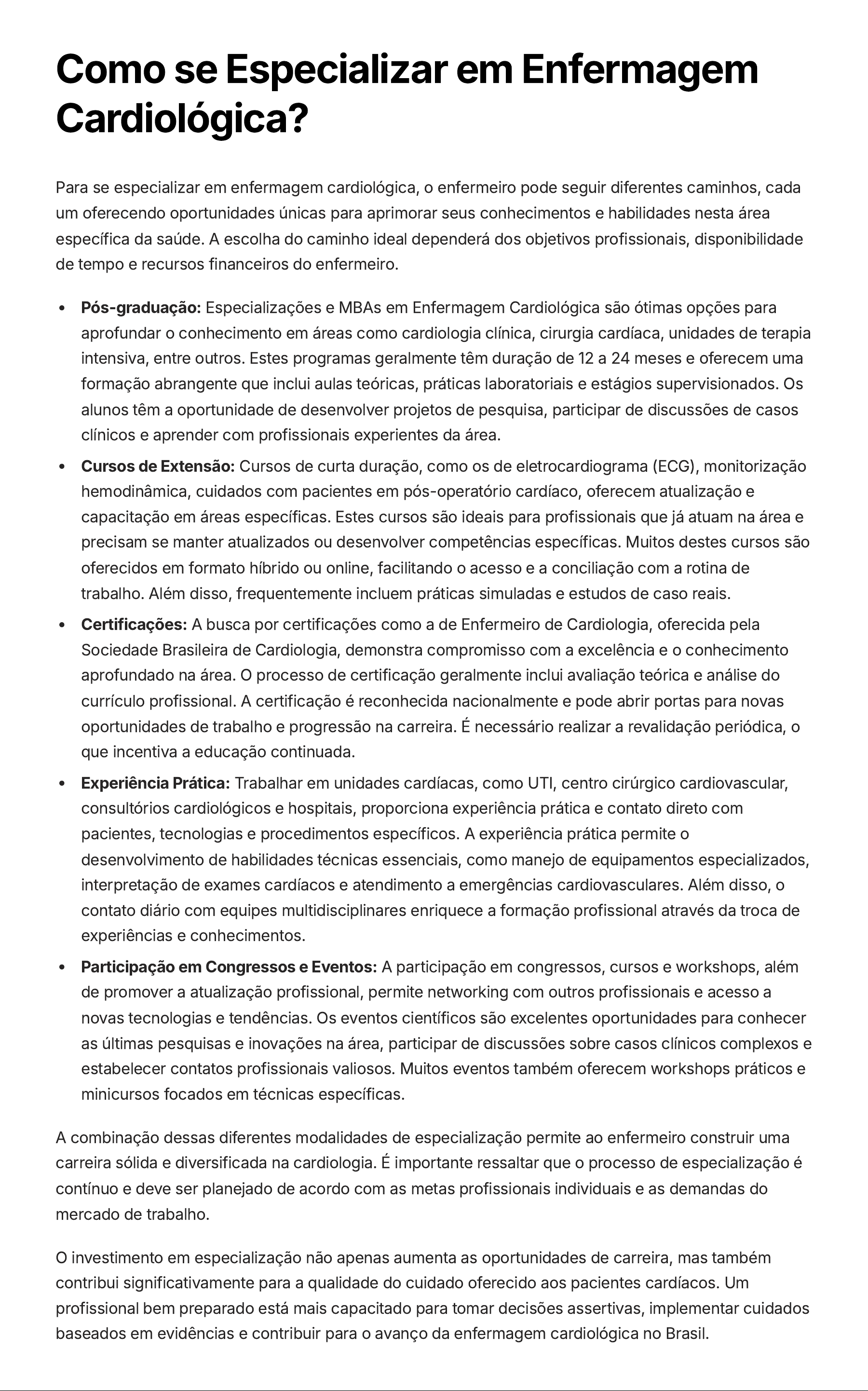 Como se Especializar em Enfermagem Cardiológica? Para se especializar em enfermagem cardiológica, o enfermeiro pode seguir diferentes caminhos, cada um oferecendo oportunidades únicas para aprimorar seus conhecimentos e habilidades nesta área específica da saúde. A escolha do caminho ideal dependerá dos objetivos profissionais, disponibilidade de tempo e recursos financeiros do enfermeiro. Pós-graduação: Especializações e MBAs em Enfermagem Cardiológica são ótimas opções para aprofundar o conhecimento em áreas como cardiologia clínica, cirurgia cardíaca, unidades de terapia intensiva, entre outros. Estes programas geralmente têm duração de 12 a 24 meses e oferecem uma formação abrangente que inclui aulas teóricas, práticas laboratoriais e estágios supervisionados. Os alunos têm a oportunidade de desenvolver projetos de pesquisa, participar de discussões de casos clínicos e aprender com profissionais experientes da área. Cursos de Extensão: Cursos de curta duração, como os de eletrocardiograma (ECG), monitorização hemodinâmica, cuidados com pacientes em pós-operatório cardíaco, oferecem atualização e capacitação em áreas específicas. Estes cursos são ideais para profissionais que já atuam na área e precisam se manter atualizados ou desenvolver competências específicas. Muitos destes cursos são oferecidos em formato híbrido ou online, facilitando o acesso e a conciliação com a rotina de trabalho. Além disso, frequentemente incluem práticas simuladas e estudos de caso reais. Certificações: A busca por certificações como a de Enfermeiro de Cardiologia, oferecida pela Sociedade Brasileira de Cardiologia, demonstra compromisso com a excelência e o conhecimento aprofundado na área. O processo de certificação geralmente inclui avaliação teórica e análise do currículo profissional. A certificação é reconhecida nacionalmente e pode abrir portas para novas oportunidades de trabalho e progressão na carreira. É necessário realizar a revalidação periódica, o que incentiva a educação continuada. Experiência Prática: Trabalhar em unidades cardíacas, como UTI, centro cirúrgico cardiovascular, consultórios cardiológicos e hospitais, proporciona experiência prática e contato direto com pacientes, tecnologias e procedimentos específicos. A experiência prática permite o desenvolvimento de habilidades técnicas essenciais, como manejo de equipamentos especializados, interpretação de exames cardíacos e atendimento a emergências cardiovasculares. Além disso, o contato diário com equipes multidisciplinares enriquece a formação profissional através da troca de experiências e conhecimentos. Participação em Congressos e Eventos: A participação em congressos, cursos e workshops, além de promover a atualização profissional, permite networking com outros profissionais e acesso a novas tecnologias e tendências. Os eventos científicos são excelentes oportunidades para conhecer as últimas pesquisas e inovações na área, participar de discussões sobre casos clínicos complexos e estabelecer contatos profissionais valiosos. Muitos eventos também oferecem workshops práticos e minicursos focados em técnicas específicas. A combinação dessas diferentes modalidades de especialização permite ao enfermeiro construir uma carreira sólida e diversificada na cardiologia. É importante ressaltar que o processo de especialização é contínuo e deve ser planejado de acordo com as metas profissionais individuais e as demandas do mercado de trabalho. O investimento em especialização não apenas aumenta as oportunidades de carreira, mas também contribui significativamente para a qualidade do cuidado oferecido aos pacientes cardíacos. Um profissional bem preparado está mais capacitado para tomar decisões assertivas, implementar cuidados baseados em evidências e contribuir para o avanço da enfermagem cardiológica no Brasil.