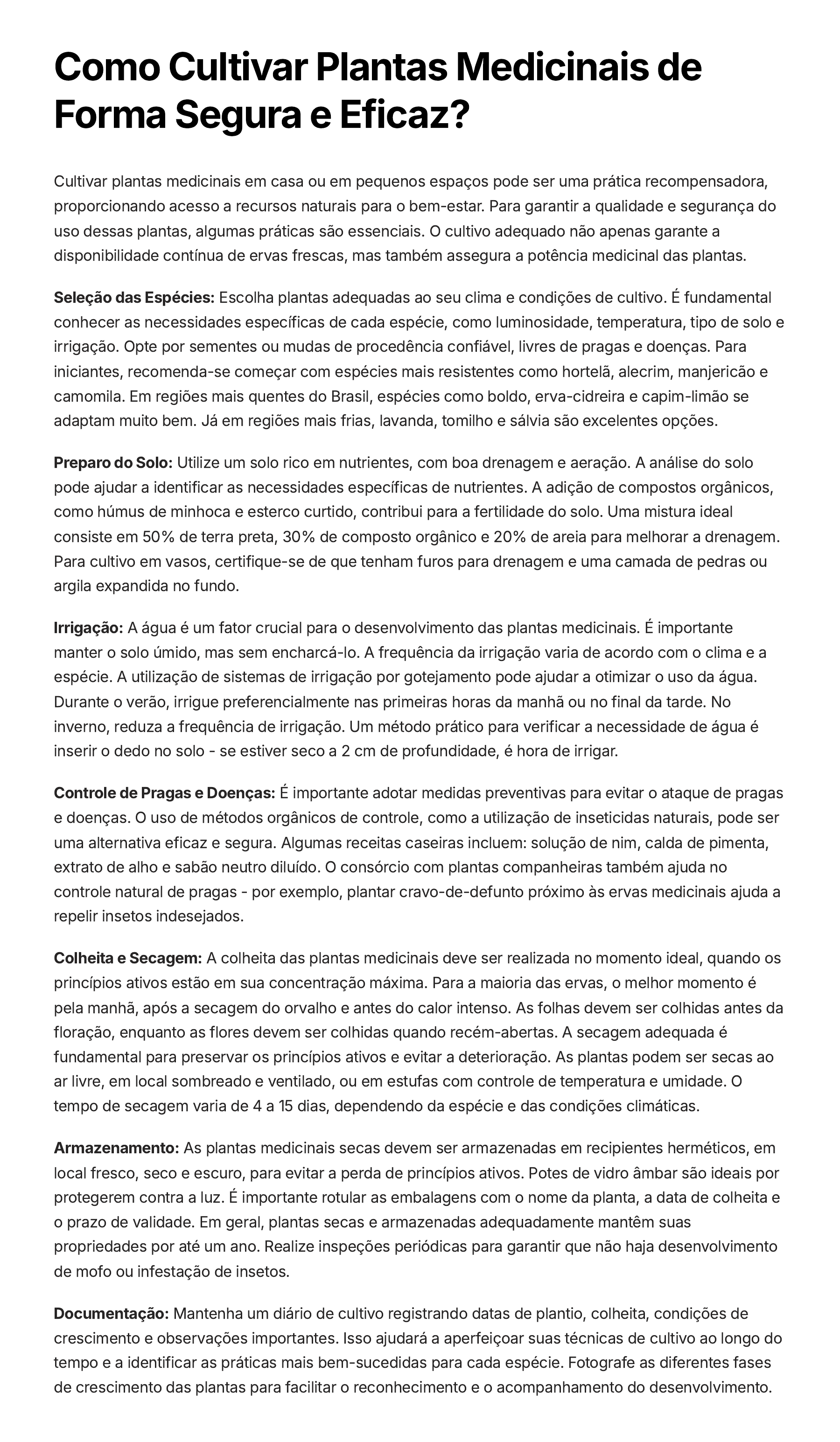 Como Cultivar Plantas Medicinais de Forma Segura e Eficaz? Cultivar plantas medicinais em casa ou em pequenos espaços pode ser uma prática recompensadora, proporcionando acesso a recursos naturais para o bem-estar. Para garantir a qualidade e segurança do uso dessas plantas, algumas práticas são essenciais. O cultivo adequado não apenas garante a disponibilidade contínua de ervas frescas, mas também assegura a potência medicinal das plantas. Seleção das Espécies: Escolha plantas adequadas ao seu clima e condições de cultivo. É fundamental conhecer as necessidades específicas de cada espécie, como luminosidade, temperatura, tipo de solo e irrigação. Opte por sementes ou mudas de procedência confiável, livres de pragas e doenças. Para iniciantes, recomenda-se começar com espécies mais resistentes como hortelã, alecrim, manjericão e camomila. Em regiões mais quentes do Brasil, espécies como boldo, erva-cidreira e capim-limão se adaptam muito bem. Já em regiões mais frias, lavanda, tomilho e sálvia são excelentes opções. Preparo do Solo: Utilize um solo rico em nutrientes, com boa drenagem e aeração. A análise do solo pode ajudar a identificar as necessidades específicas de nutrientes. A adição de compostos orgânicos, como húmus de minhoca e esterco curtido, contribui para a fertilidade do solo. Uma mistura ideal consiste em 50% de terra preta, 30% de composto orgânico e 20% de areia para melhorar a drenagem. Para cultivo em vasos, certifique-se de que tenham furos para drenagem e uma camada de pedras ou argila expandida no fundo. Irrigação: A água é um fator crucial para o desenvolvimento das plantas medicinais. É importante manter o solo úmido, mas sem encharcá-lo. A frequência da irrigação varia de acordo com o clima e a espécie. A utilização de sistemas de irrigação por gotejamento pode ajudar a otimizar o uso da água. Durante o verão, irrigue preferencialmente nas primeiras horas da manhã ou no final da tarde. No inverno, reduza a frequência de irrigação. Um método prático para verificar a necessidade de água é inserir o dedo no solo - se estiver seco a 2 cm de profundidade, é hora de irrigar. Controle de Pragas e Doenças: É importante adotar medidas preventivas para evitar o ataque de pragas e doenças. O uso de métodos orgânicos de controle, como a utilização de inseticidas naturais, pode ser uma alternativa eficaz e segura. Algumas receitas caseiras incluem: solução de nim, calda de pimenta, extrato de alho e sabão neutro diluído. O consórcio com plantas companheiras também ajuda no controle natural de pragas - por exemplo, plantar cravo-de-defunto próximo às ervas medicinais ajuda a repelir insetos indesejados. Colheita e Secagem: A colheita das plantas medicinais deve ser realizada no momento ideal, quando os princípios ativos estão em sua concentração máxima. Para a maioria das ervas, o melhor momento é pela manhã, após a secagem do orvalho e antes do calor intenso. As folhas devem ser colhidas antes da floração, enquanto as flores devem ser colhidas quando recém-abertas. A secagem adequada é fundamental para preservar os princípios ativos e evitar a deterioração. As plantas podem ser secas ao ar livre, em local sombreado e ventilado, ou em estufas com controle de temperatura e umidade. O tempo de secagem varia de 4 a 15 dias, dependendo da espécie e das condições climáticas. Armazenamento: As plantas medicinais secas devem ser armazenadas em recipientes herméticos, em local fresco, seco e escuro, para evitar a perda de princípios ativos. Potes de vidro âmbar são ideais por protegerem contra a luz. É importante rotular as embalagens com o nome da planta, a data de colheita e o prazo de validade. Em geral, plantas secas e armazenadas adequadamente mantêm suas propriedades por até um ano. Realize inspeções periódicas para garantir que não haja desenvolvimento de mofo ou infestação de insetos. Documentação: Mantenha um diário de cultivo registrando datas de plantio, colheita, condições de crescimento e observações importantes. Isso ajudará a aperfeiçoar suas técnicas de cultivo ao longo do tempo e a identificar as práticas mais bem-sucedidas para cada espécie. Fotografe as diferentes fases de crescimento das plantas para facilitar o reconhecimento e o acompanhamento do desenvolvimento.