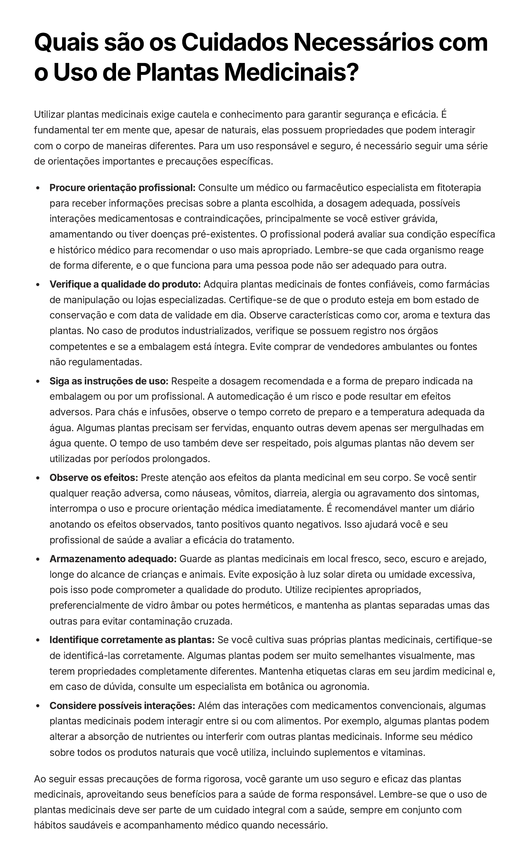 Quais são os Cuidados Necessários com o Uso de Plantas Medicinais? Utilizar plantas medicinais exige cautela e conhecimento para garantir segurança e eficácia. É fundamental ter em mente que, apesar de naturais, elas possuem propriedades que podem interagir com o corpo de maneiras diferentes. Para um uso responsável e seguro, é necessário seguir uma série de orientações importantes e precauções específicas. Procure orientação profissional: Consulte um médico ou farmacêutico especialista em fitoterapia para receber informações precisas sobre a planta escolhida, a dosagem adequada, possíveis interações medicamentosas e contraindicações, principalmente se você estiver grávida, amamentando ou tiver doenças pré-existentes. O profissional poderá avaliar sua condição específica e histórico médico para recomendar o uso mais apropriado. Lembre-se que cada organismo reage de forma diferente, e o que funciona para uma pessoa pode não ser adequado para outra. Verifique a qualidade do produto: Adquira plantas medicinais de fontes confiáveis, como farmácias de manipulação ou lojas especializadas. Certifique-se de que o produto esteja em bom estado de conservação e com data de validade em dia. Observe características como cor, aroma e textura das plantas. No caso de produtos industrializados, verifique se possuem registro nos órgãos competentes e se a embalagem está íntegra. Evite comprar de vendedores ambulantes ou fontes não regulamentadas. Siga as instruções de uso: Respeite a dosagem recomendada e a forma de preparo indicada na embalagem ou por um profissional. A automedicação é um risco e pode resultar em efeitos adversos. Para chás e infusões, observe o tempo correto de preparo e a temperatura adequada da água. Algumas plantas precisam ser fervidas, enquanto outras devem apenas ser mergulhadas em água quente. O tempo de uso também deve ser respeitado, pois algumas plantas não devem ser utilizadas por períodos prolongados. Observe os efeitos: Preste atenção aos efeitos da planta medicinal em seu corpo. Se você sentir qualquer reação adversa, como náuseas, vômitos, diarreia, alergia ou agravamento dos sintomas, interrompa o uso e procure orientação médica imediatamente. É recomendável manter um diário anotando os efeitos observados, tanto positivos quanto negativos. Isso ajudará você e seu profissional de saúde a avaliar a eficácia do tratamento. Armazenamento adequado: Guarde as plantas medicinais em local fresco, seco, escuro e arejado, longe do alcance de crianças e animais. Evite exposição à luz solar direta ou umidade excessiva, pois isso pode comprometer a qualidade do produto. Utilize recipientes apropriados, preferencialmente de vidro âmbar ou potes herméticos, e mantenha as plantas separadas umas das outras para evitar contaminação cruzada. Identifique corretamente as plantas: Se você cultiva suas próprias plantas medicinais, certifique-se de identificá-las corretamente. Algumas plantas podem ser muito semelhantes visualmente, mas terem propriedades completamente diferentes. Mantenha etiquetas claras em seu jardim medicinal e, em caso de dúvida, consulte um especialista em botânica ou agronomia. Considere possíveis interações: Além das interações com medicamentos convencionais, algumas plantas medicinais podem interagir entre si ou com alimentos. Por exemplo, algumas plantas podem alterar a absorção de nutrientes ou interferir com outras plantas medicinais. Informe seu médico sobre todos os produtos naturais que você utiliza, incluindo suplementos e vitaminas. Ao seguir essas precauções de forma rigorosa, você garante um uso seguro e eficaz das plantas medicinais, aproveitando seus benefícios para a saúde de forma responsável. Lembre-se que o uso de plantas medicinais deve ser parte de um cuidado integral com a saúde, sempre em conjunto com hábitos saudáveis e acompanhamento médico quando necessário.