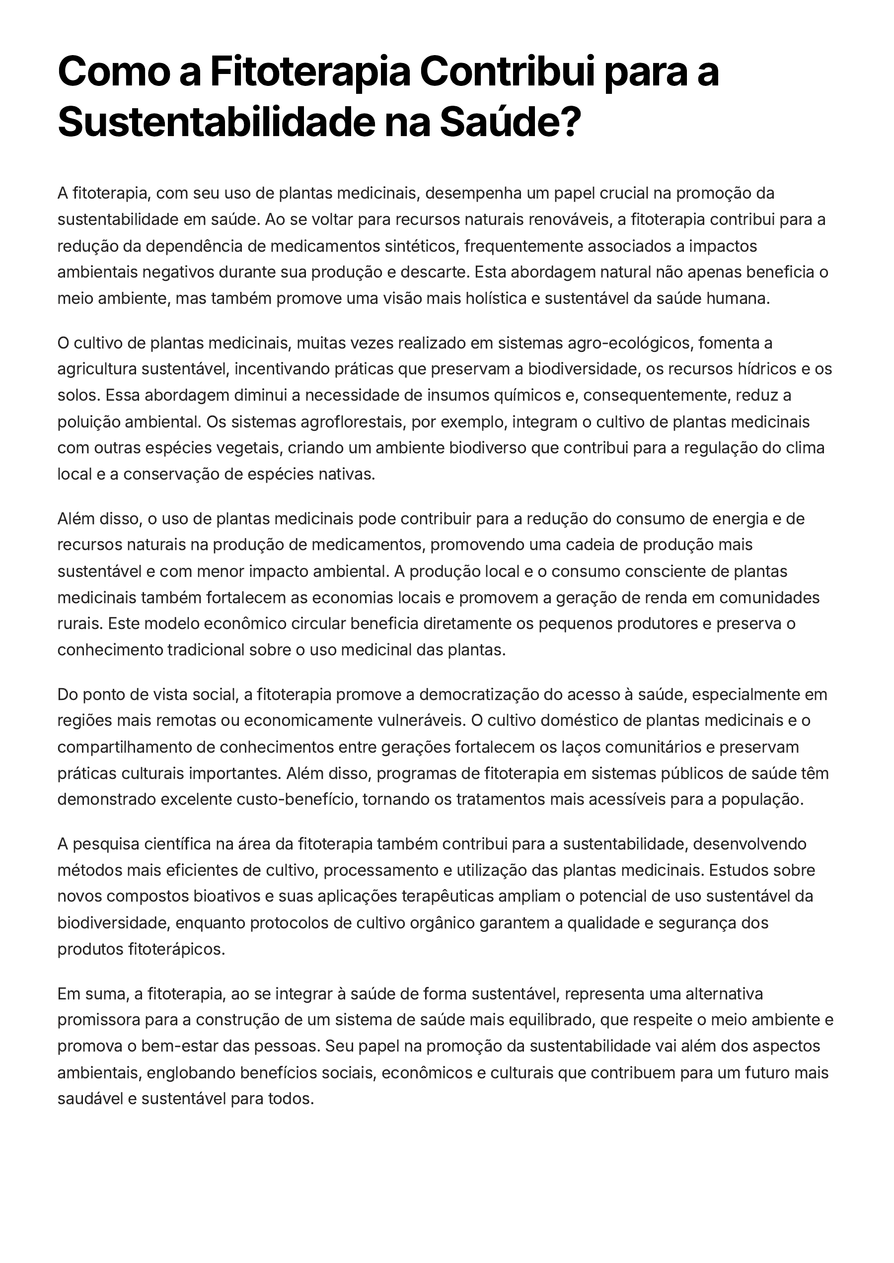 Como a Fitoterapia Contribui para a Sustentabilidade na Saúde? A fitoterapia, com seu uso de plantas medicinais, desempenha um papel crucial na promoção da sustentabilidade em saúde. Ao se voltar para recursos naturais renováveis, a fitoterapia contribui para a redução da dependência de medicamentos sintéticos, frequentemente associados a impactos ambientais negativos durante sua produção e descarte. Esta abordagem natural não apenas beneficia o meio ambiente, mas também promove uma visão mais holística e sustentável da saúde humana. O cultivo de plantas medicinais, muitas vezes realizado em sistemas agro-ecológicos, fomenta a agricultura sustentável, incentivando práticas que preservam a biodiversidade, os recursos hídricos e os solos. Essa abordagem diminui a necessidade de insumos químicos e, consequentemente, reduz a poluição ambiental. Os sistemas agroflorestais, por exemplo, integram o cultivo de plantas medicinais com outras espécies vegetais, criando um ambiente biodiverso que contribui para a regulação do clima local e a conservação de espécies nativas. Além disso, o uso de plantas medicinais pode contribuir para a redução do consumo de energia e de recursos naturais na produção de medicamentos, promovendo uma cadeia de produção mais sustentável e com menor impacto ambiental. A produção local e o consumo consciente de plantas medicinais também fortalecem as economias locais e promovem a geração de renda em comunidades rurais. Este modelo econômico circular beneficia diretamente os pequenos produtores e preserva o conhecimento tradicional sobre o uso medicinal das plantas. Do ponto de vista social, a fitoterapia promove a democratização do acesso à saúde, especialmente em regiões mais remotas ou economicamente vulneráveis. O cultivo doméstico de plantas medicinais e o compartilhamento de conhecimentos entre gerações fortalecem os laços comunitários e preservam práticas culturais importantes. Além disso, programas de fitoterapia em sistemas públicos de saúde têm demonstrado excelente custo-benefício, tornando os tratamentos mais acessíveis para a população. A pesquisa científica na área da fitoterapia também contribui para a sustentabilidade, desenvolvendo métodos mais eficientes de cultivo, processamento e utilização das plantas medicinais. Estudos sobre novos compostos bioativos e suas aplicações terapêuticas ampliam o potencial de uso sustentável da biodiversidade, enquanto protocolos de cultivo orgânico garantem a qualidade e segurança dos produtos fitoterápicos. Em suma, a fitoterapia, ao se integrar à saúde de forma sustentável, representa uma alternativa promissora para a construção de um sistema de saúde mais equilibrado, que respeite o meio ambiente e promova o bem-estar das pessoas. Seu papel na promoção da sustentabilidade vai além dos aspectos ambientais, englobando benefícios sociais, econômicos e culturais que contribuem para um futuro mais saudável e sustentável para todos.