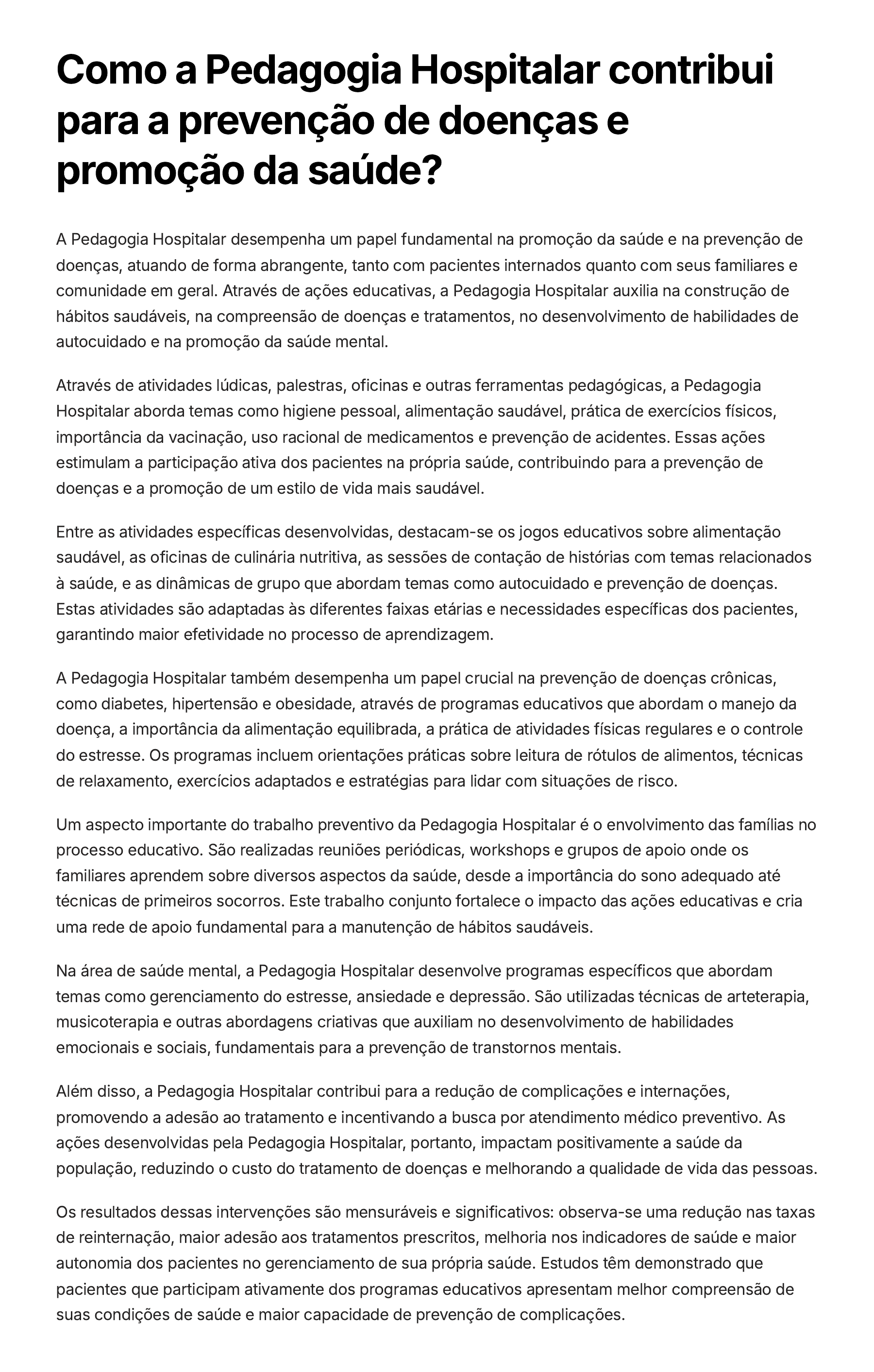 Como a Pedagogia Hospitalar contribui para a prevenção de doenças e promoção da saúde? A Pedagogia Hospitalar desempenha um papel fundamental na promoção da saúde e na prevenção de doenças, atuando de forma abrangente, tanto com pacientes internados quanto com seus familiares e comunidade em geral. Através de ações educativas, a Pedagogia Hospitalar auxilia na construção de hábitos saudáveis, na compreensão de doenças e tratamentos, no desenvolvimento de habilidades de autocuidado e na promoção da saúde mental. Através de atividades lúdicas, palestras, oficinas e outras ferramentas pedagógicas, a Pedagogia Hospitalar aborda temas como higiene pessoal, alimentação saudável, prática de exercícios físicos, importância da vacinação, uso racional de medicamentos e prevenção de acidentes. Essas ações estimulam a participação ativa dos pacientes na própria saúde, contribuindo para a prevenção de doenças e a promoção de um estilo de vida mais saudável. Entre as atividades específicas desenvolvidas, destacam-se os jogos educativos sobre alimentação saudável, as oficinas de culinária nutritiva, as sessões de contação de histórias com temas relacionados à saúde, e as dinâmicas de grupo que abordam temas como autocuidado e prevenção de doenças. Estas atividades são adaptadas às diferentes faixas etárias e necessidades específicas dos pacientes, garantindo maior efetividade no processo de aprendizagem. A Pedagogia Hospitalar também desempenha um papel crucial na prevenção de doenças crônicas, como diabetes, hipertensão e obesidade, através de programas educativos que abordam o manejo da doença, a importância da alimentação equilibrada, a prática de atividades físicas regulares e o controle do estresse. Os programas incluem orientações práticas sobre leitura de rótulos de alimentos, técnicas de relaxamento, exercícios adaptados e estratégias para lidar com situações de risco. Um aspecto importante do trabalho preventivo da Pedagogia Hospitalar é o envolvimento das famílias no processo educativo. São realizadas reuniões periódicas, workshops e grupos de apoio onde os familiares aprendem sobre diversos aspectos da saúde, desde a importância do sono adequado até técnicas de primeiros socorros. Este trabalho conjunto fortalece o impacto das ações educativas e cria uma rede de apoio fundamental para a manutenção de hábitos saudáveis. Na área de saúde mental, a Pedagogia Hospitalar desenvolve programas específicos que abordam temas como gerenciamento do estresse, ansiedade e depressão. São utilizadas técnicas de arteterapia, musicoterapia e outras abordagens criativas que auxiliam no desenvolvimento de habilidades emocionais e sociais, fundamentais para a prevenção de transtornos mentais. Além disso, a Pedagogia Hospitalar contribui para a redução de complicações e internações, promovendo a adesão ao tratamento e incentivando a busca por atendimento médico preventivo. As ações desenvolvidas pela Pedagogia Hospitalar, portanto, impactam positivamente a saúde da população, reduzindo o custo do tratamento de doenças e melhorando a qualidade de vida das pessoas. Os resultados dessas intervenções são mensuráveis e significativos: observa-se uma redução nas taxas de reinternação, maior adesão aos tratamentos prescritos, melhoria nos indicadores de saúde e maior autonomia dos pacientes no gerenciamento de sua própria saúde. Estudos têm demonstrado que pacientes que participam ativamente dos programas educativos apresentam melhor compreensão de suas condições de saúde e maior capacidade de prevenção de complicações.