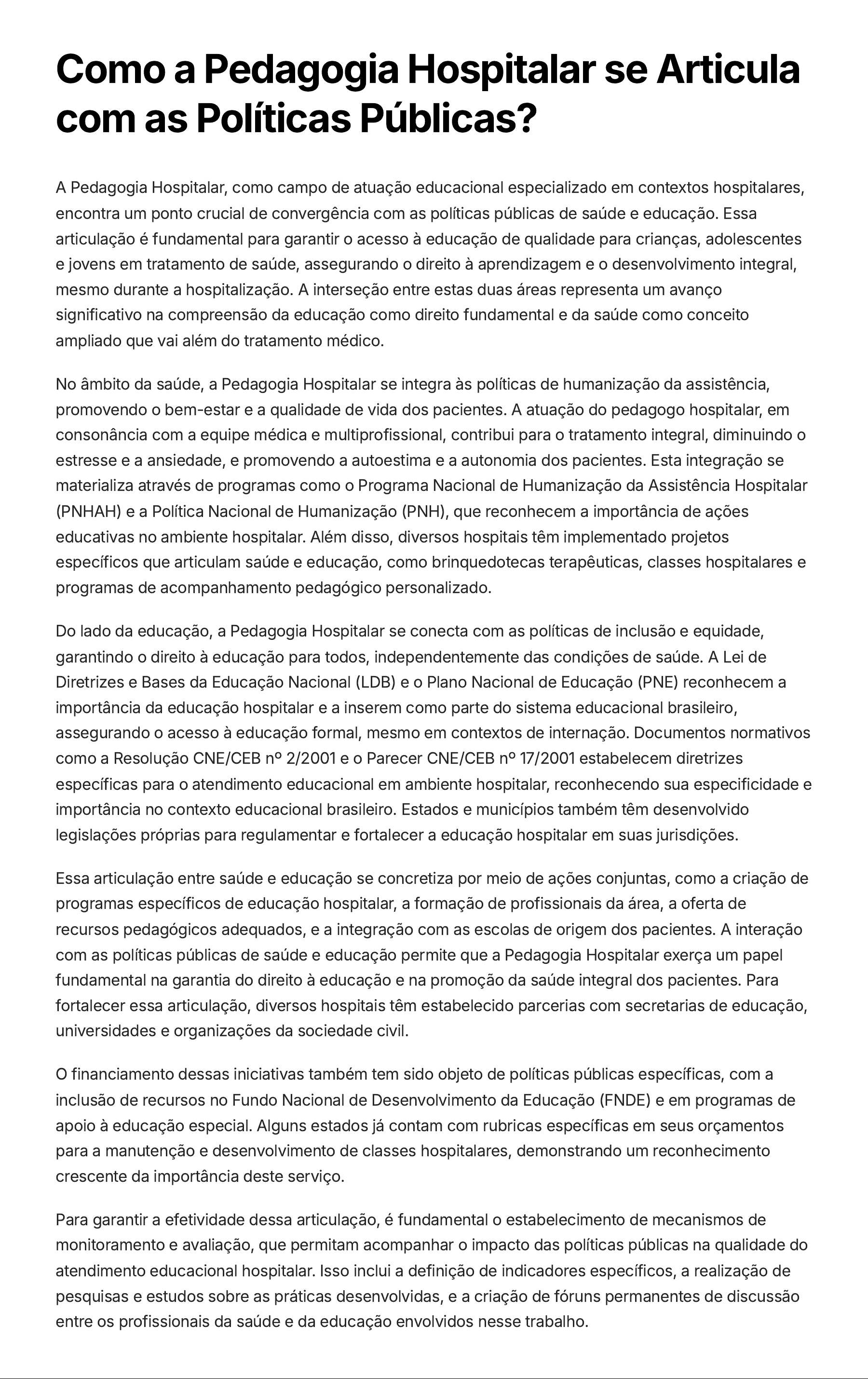 Como a Pedagogia Hospitalar se Articula com as Políticas Públicas? A Pedagogia Hospitalar, como campo de atuação educacional especializado em contextos hospitalares, encontra um ponto crucial de convergência com as políticas públicas de saúde e educação. Essa articulação é fundamental para garantir o acesso à educação de qualidade para crianças, adolescentes e jovens em tratamento de saúde, assegurando o direito à aprendizagem e o desenvolvimento integral, mesmo durante a hospitalização. A interseção entre estas duas áreas representa um avanço significativo na compreensão da educação como direito fundamental e da saúde como conceito ampliado que vai além do tratamento médico. No âmbito da saúde, a Pedagogia Hospitalar se integra às políticas de humanização da assistência, promovendo o bem-estar e a qualidade de vida dos pacientes. A atuação do pedagogo hospitalar, em consonância com a equipe médica e multiprofissional, contribui para o tratamento integral, diminuindo o estresse e a ansiedade, e promovendo a autoestima e a autonomia dos pacientes. Esta integração se materializa através de programas como o Programa Nacional de Humanização da Assistência Hospitalar (PNHAH) e a Política Nacional de Humanização (PNH), que reconhecem a importância de ações educativas no ambiente hospitalar. Além disso, diversos hospitais têm implementado projetos específicos que articulam saúde e educação, como brinquedotecas terapêuticas, classes hospitalares e programas de acompanhamento pedagógico personalizado. Do lado da educação, a Pedagogia Hospitalar se conecta com as políticas de inclusão e equidade, garantindo o direito à educação para todos, independentemente das condições de saúde. A Lei de Diretrizes e Bases da Educação Nacional (LDB) e o Plano Nacional de Educação (PNE) reconhecem a importância da educação hospitalar e a inserem como parte do sistema educacional brasileiro, assegurando o acesso à educação formal, mesmo em contextos de internação. Documentos normativos como a Resolução CNE/CEB nº 2/2001 e o Parecer CNE/CEB nº 17/2001 estabelecem diretrizes específicas para o atendimento educacional em ambiente hospitalar, reconhecendo sua especificidade e importância no contexto educacional brasileiro. Estados e municípios também têm desenvolvido legislações próprias para regulamentar e fortalecer a educação hospitalar em suas jurisdições. Essa articulação entre saúde e educação se concretiza por meio de ações conjuntas, como a criação de programas específicos de educação hospitalar, a formação de profissionais da área, a oferta de recursos pedagógicos adequados, e a integração com as escolas de origem dos pacientes. A interação com as políticas públicas de saúde e educação permite que a Pedagogia Hospitalar exerça um papel fundamental na garantia do direito à educação e na promoção da saúde integral dos pacientes. Para fortalecer essa articulação, diversos hospitais têm estabelecido parcerias com secretarias de educação, universidades e organizações da sociedade civil. O financiamento dessas iniciativas também tem sido objeto de políticas públicas específicas, com a inclusão de recursos no Fundo Nacional de Desenvolvimento da Educação (FNDE) e em programas de apoio à educação especial. Alguns estados já contam com rubricas específicas em seus orçamentos para a manutenção e desenvolvimento de classes hospitalares, demonstrando um reconhecimento crescente da importância deste serviço. Para garantir a efetividade dessa articulação, é fundamental o estabelecimento de mecanismos de monitoramento e avaliação, que permitam acompanhar o impacto das políticas públicas na qualidade do atendimento educacional hospitalar. Isso inclui a definição de indicadores específicos, a realização de pesquisas e estudos sobre as práticas desenvolvidas, e a criação de fóruns permanentes de discussão entre os profissionais da saúde e da educação envolvidos nesse trabalho.