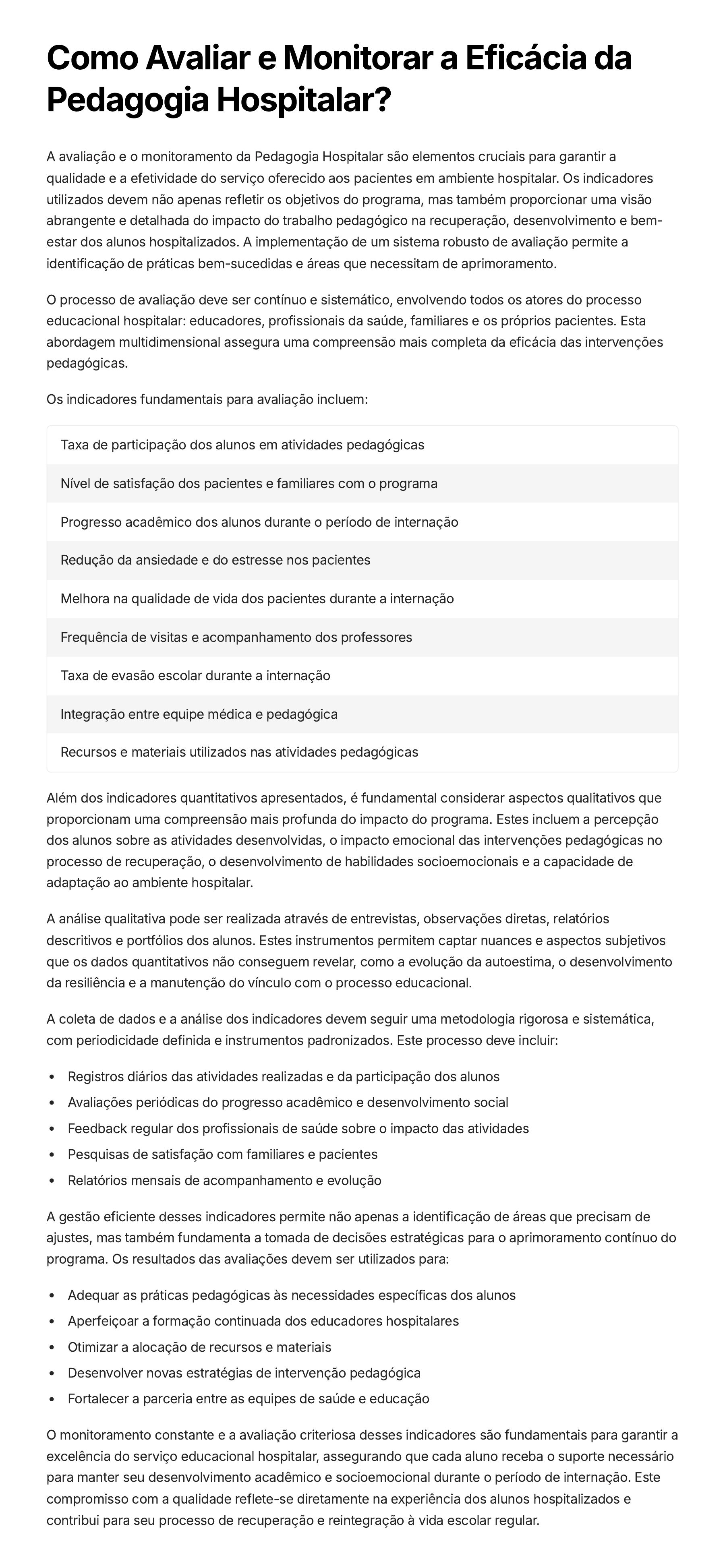 A avaliação e o monitoramento da Pedagogia Hospitalar são elementos cruciais para garantir a