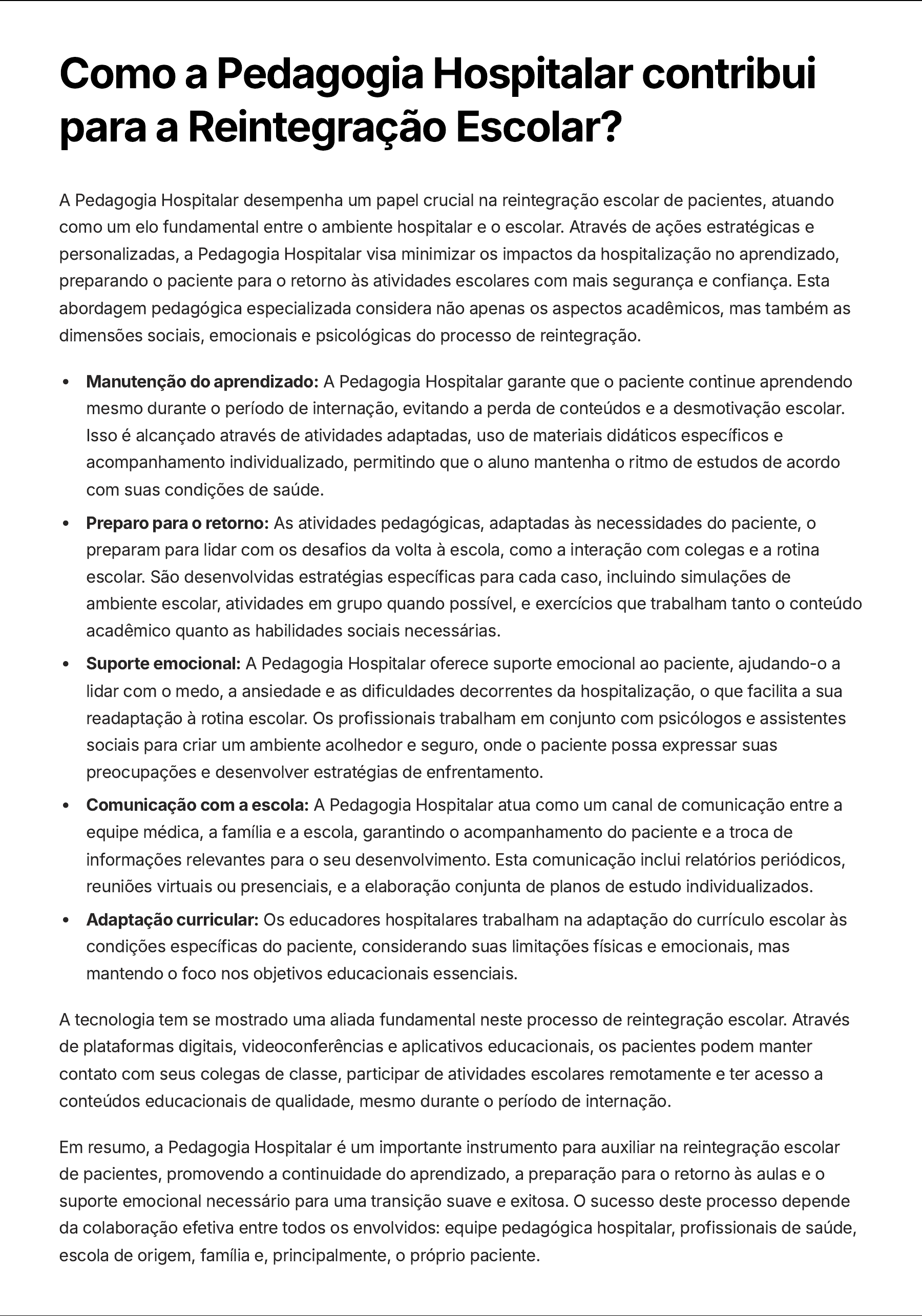 Como a Pedagogia Hospitalar contribui para a Reintegração Escolar? A Pedagogia Hospitalar desempenha um papel crucial na reintegração escolar de pacientes, atuando como um elo fundamental entre o ambiente hospitalar e o escolar. Através de ações estratégicas e personalizadas, a Pedagogia Hospitalar visa minimizar os impactos da hospitalização no aprendizado, preparando o paciente para o retorno às atividades escolares com mais segurança e confiança. Esta abordagem pedagógica especializada considera não apenas os aspectos acadêmicos, mas também as dimensões sociais, emocionais e psicológicas do processo de reintegração. Manutenção do aprendizado: A Pedagogia Hospitalar garante que o paciente continue aprendendo mesmo durante o período de internação, evitando a perda de conteúdos e a desmotivação escolar. Isso é alcançado através de atividades adaptadas, uso de materiais didáticos específicos e acompanhamento individualizado, permitindo que o aluno mantenha o ritmo de estudos de acordo com suas condições de saúde. Preparo para o retorno: As atividades pedagógicas, adaptadas às necessidades do paciente, o preparam para lidar com os desafios da volta à escola, como a interação com colegas e a rotina escolar. São desenvolvidas estratégias específicas para cada caso, incluindo simulações de ambiente escolar, atividades em grupo quando possível, e exercícios que trabalham tanto o conteúdo acadêmico quanto as habilidades sociais necessárias. Suporte emocional: A Pedagogia Hospitalar oferece suporte emocional ao paciente, ajudando-o a lidar com o medo, a ansiedade e as dificuldades decorrentes da hospitalização, o que facilita a sua readaptação à rotina escolar. Os profissionais trabalham em conjunto com psicólogos e assistentes sociais para criar um ambiente acolhedor e seguro, onde o paciente possa expressar suas preocupações e desenvolver estratégias de enfrentamento. Comunicação com a escola: A Pedagogia Hospitalar atua como um canal de comunicação entre a equipe médica, a família e a escola, garantindo o acompanhamento do paciente e a troca de informações relevantes para o seu desenvolvimento. Esta comunicação inclui relatórios periódicos, reuniões virtuais ou presenciais, e a elaboração conjunta de planos de estudo individualizados. Adaptação curricular: Os educadores hospitalares trabalham na adaptação do currículo escolar às condições específicas do paciente, considerando suas limitações físicas e emocionais, mas mantendo o foco nos objetivos educacionais essenciais. A tecnologia tem se mostrado uma aliada fundamental neste processo de reintegração escolar. Através de plataformas digitais, videoconferências e aplicativos educacionais, os pacientes podem manter contato com seus colegas de classe, participar de atividades escolares remotamente e ter acesso a conteúdos educacionais de qualidade, mesmo durante o período de internação. Em resumo, a Pedagogia Hospitalar é um importante instrumento para auxiliar na reintegração escolar de pacientes, promovendo a continuidade do aprendizado, a preparação para o retorno às aulas e o suporte emocional necessário para uma transição suave e exitosa. O sucesso deste processo depende da colaboração efetiva entre todos os envolvidos: equipe pedagógica hospitalar, profissionais de saúde, escola de origem, família e, principalmente, o próprio paciente.