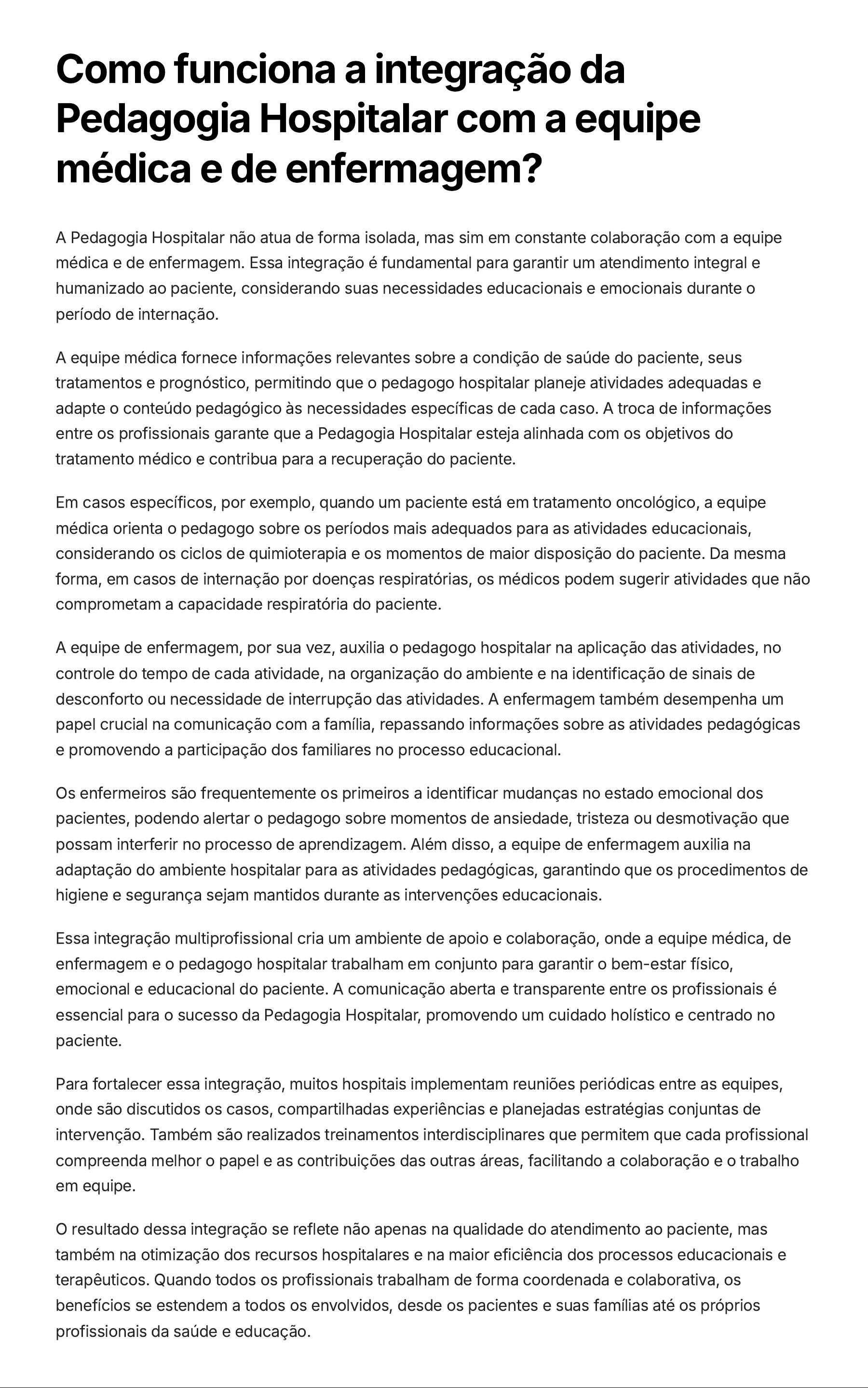 Como funciona a integração da Pedagogia Hospitalar com a equipe médica e de enfermagem? A Pedagogia Hospitalar não atua de forma isolada, mas sim em constante colaboração com a equipe médica e de enfermagem. Essa integração é fundamental para garantir um atendimento integral e humanizado ao paciente, considerando suas necessidades educacionais e emocionais durante o período de internação. A equipe médica fornece informações relevantes sobre a condição de saúde do paciente, seus tratamentos e prognóstico, permitindo que o pedagogo hospitalar planeje atividades adequadas e adapte o conteúdo pedagógico às necessidades específicas de cada caso. A troca de informações entre os profissionais garante que a Pedagogia Hospitalar esteja alinhada com os objetivos do tratamento médico e contribua para a recuperação do paciente. Em casos específicos, por exemplo, quando um paciente está em tratamento oncológico, a equipe médica orienta o pedagogo sobre os períodos mais adequados para as atividades educacionais, considerando os ciclos de quimioterapia e os momentos de maior disposição do paciente. Da mesma forma, em casos de internação por doenças respiratórias, os médicos podem sugerir atividades que não comprometam a capacidade respiratória do paciente. A equipe de enfermagem, por sua vez, auxilia o pedagogo hospitalar na aplicação das atividades, no controle do tempo de cada atividade, na organização do ambiente e na identificação de sinais de desconforto ou necessidade de interrupção das atividades. A enfermagem também desempenha um papel crucial na comunicação com a família, repassando informações sobre as atividades pedagógicas e promovendo a participação dos familiares no processo educacional. Os enfermeiros são frequentemente os primeiros a identificar mudanças no estado emocional dos pacientes, podendo alertar o pedagogo sobre momentos de ansiedade, tristeza ou desmotivação que possam interferir no processo de aprendizagem. Além disso, a equipe de enfermagem auxilia na adaptação do ambiente hospitalar para as atividades pedagógicas, garantindo que os procedimentos de higiene e segurança sejam mantidos durante as intervenções educacionais. Essa integração multiprofissional cria um ambiente de apoio e colaboração, onde a equipe médica, de enfermagem e o pedagogo hospitalar trabalham em conjunto para garantir o bem-estar físico, emocional e educacional do paciente. A comunicação aberta e transparente entre os profissionais é essencial para o sucesso da Pedagogia Hospitalar, promovendo um cuidado holístico e centrado no paciente. Para fortalecer essa integração, muitos hospitais implementam reuniões periódicas entre as equipes, onde são discutidos os casos, compartilhadas experiências e planejadas estratégias conjuntas de intervenção. Também são realizados treinamentos interdisciplinares que permitem que cada profissional compreenda melhor o papel e as contribuições das outras áreas, facilitando a colaboração e o trabalho em equipe. O resultado dessa integração se reflete não apenas na qualidade do atendimento ao paciente, mas também na otimização dos recursos hospitalares e na maior eficiência dos processos educacionais e terapêuticos. Quando todos os profissionais trabalham de forma coordenada e colaborativa, os benefícios se estendem a todos os envolvidos, desde os pacientes e suas famílias até os próprios profissionais da saúde e educação.