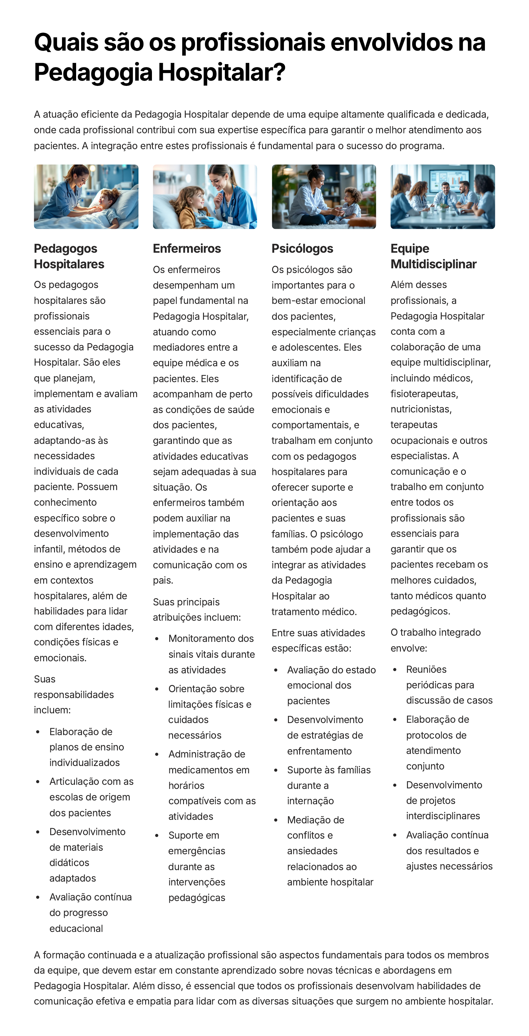 Quais são os profissionais envolvidos na Pedagogia Hospitalar? A atuação eficiente da Pedagogia Hospitalar depende de uma equipe altamente qualificada e dedicada, onde cada profissional contribui com sua expertise específica para garantir o melhor atendimento aos pacientes. A integração entre estes profissionais é fundamental para o sucesso do programa. Pedagogos Hospitalares Os pedagogos hospitalares são profissionais essenciais para o sucesso da Pedagogia Hospitalar. São eles que planejam, implementam e avaliam as atividades educativas, adaptando-as às necessidades individuais de cada paciente. Possuem conhecimento específico sobre o desenvolvimento infantil, métodos de ensino e aprendizagem em contextos hospitalares, além de habilidades para lidar com diferentes idades, condições físicas e emocionais. Suas responsabilidades incluem: Elaboração de planos de ensino individualizados Articulação com as escolas de origem dos pacientes Desenvolvimento de materiais didáticos adaptados Avaliação contínua do progresso educacional Enfermeiros Os enfermeiros desempenham um papel fundamental na Pedagogia Hospitalar, atuando como mediadores entre a equipe médica e os pacientes. Eles acompanham de perto as condições de saúde dos pacientes, garantindo que as atividades educativas sejam adequadas à sua situação. Os enfermeiros também podem auxiliar na implementação das atividades e na comunicação com os pais. Suas principais atribuições incluem: Monitoramento dos sinais vitais durante as atividades Orientação sobre limitações físicas e cuidados necessários Administração de medicamentos em horários compatíveis com as atividades Suporte em emergências durante as intervenções pedagógicas Psicólogos Os psicólogos são importantes para o bem-estar emocional dos pacientes, especialmente crianças e adolescentes. Eles auxiliam na identificação de possíveis dificuldades emocionais e comportamentais, e trabalham em conjunto com os pedagogos hospitalares para oferecer suporte e orientação aos pacientes e suas famílias. O psicólogo também pode ajudar a integrar as atividades da Pedagogia Hospitalar ao tratamento médico. Entre suas atividades específicas estão: Avaliação do estado emocional dos pacientes Desenvolvimento de estratégias de enfrentamento Suporte às famílias durante a internação Mediação de conflitos e ansiedades relacionados ao ambiente hospitalar Equipe Multidisciplinar Além desses profissionais, a Pedagogia Hospitalar conta com a colaboração de uma equipe multidisciplinar, incluindo médicos, fisioterapeutas, nutricionistas, terapeutas ocupacionais e outros especialistas. A comunicação e o trabalho em conjunto entre todos os profissionais são essenciais para garantir que os pacientes recebam os melhores cuidados, tanto médicos quanto pedagógicos. O trabalho integrado envolve: Reuniões periódicas para discussão de casos Elaboração de protocolos de atendimento conjunto Desenvolvimento de projetos interdisciplinares Avaliação contínua dos resultados e ajustes necessários A formação continuada e a atualização profissional são aspectos fundamentais para todos os membros da equipe, que devem estar em constante aprendizado sobre novas técnicas e abordagens em Pedagogia Hospitalar. Além disso, é essencial que todos os profissionais desenvolvam habilidades de comunicação efetiva e empatia para lidar com as diversas situações que surgem no ambiente hospitalar.