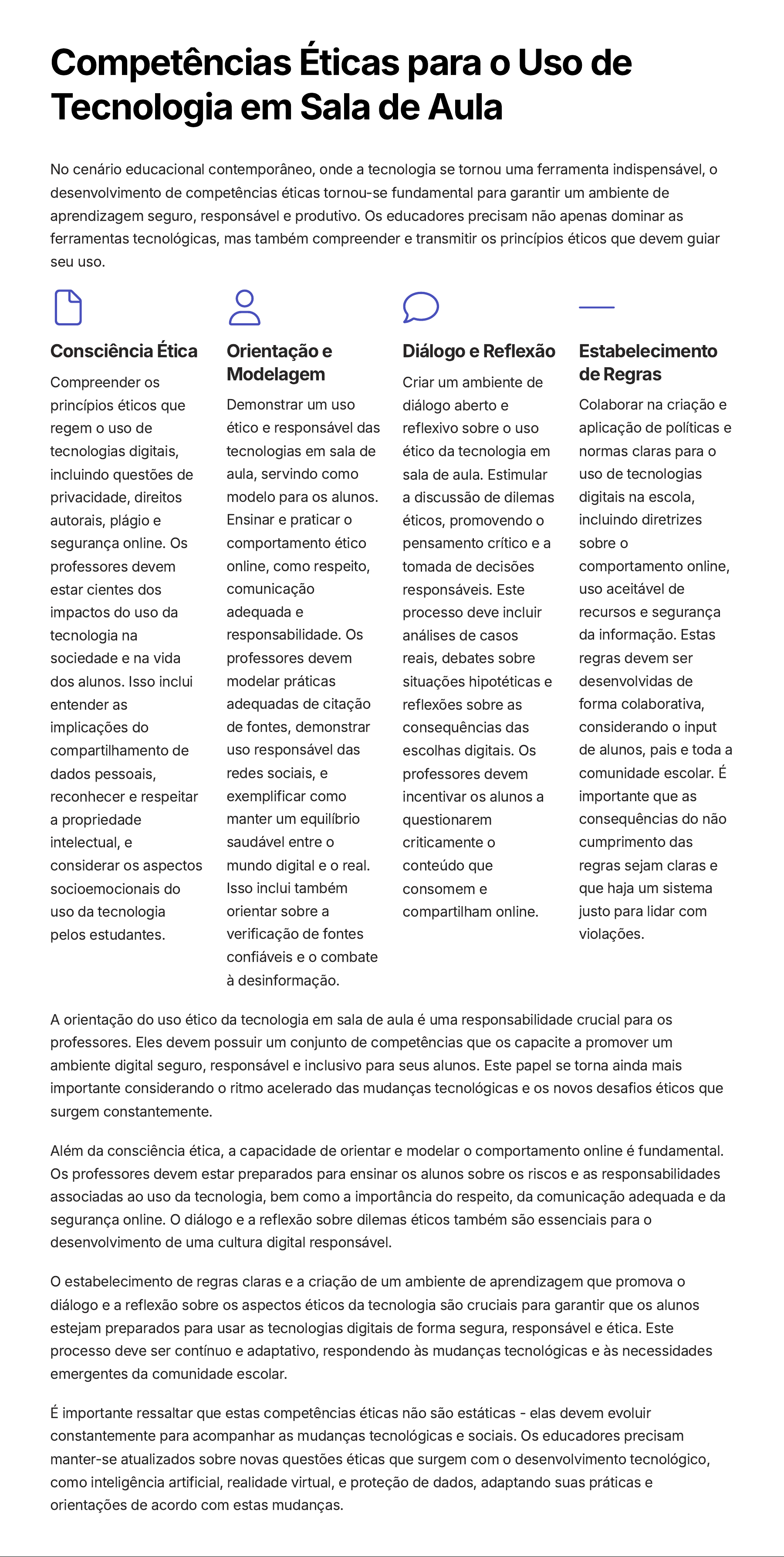 Competências Éticas para o Uso de Tecnologia em Sala de Aula No cenário educacional contemporâneo, onde a tecnologia se tornou uma ferramenta indispensável, o desenvolvimento de competências éticas tornou-se fundamental para garantir um ambiente de aprendizagem seguro, responsável e produtivo. Os educadores precisam não apenas dominar as ferramentas tecnológicas, mas também compreender e transmitir os princípios éticos que devem guiar seu uso. Consciência Ética Compreender os princípios éticos que regem o uso de tecnologias digitais, incluindo questões de privacidade, direitos autorais, plágio e segurança online. Os professores devem estar cientes dos impactos do uso da tecnologia na sociedade e na vida dos alunos. Isso inclui entender as implicações do compartilhamento de dados pessoais, reconhecer e respeitar a propriedade intelectual, e considerar os aspectos socioemocionais do uso da tecnologia pelos estudantes. Orientação e Modelagem Demonstrar um uso ético e responsável das tecnologias em sala de aula, servindo como modelo para os alunos. Ensinar e praticar o comportamento ético online, como respeito, comunicação adequada e responsabilidade. Os professores devem modelar práticas adequadas de citação de fontes, demonstrar uso responsável das redes sociais, e exemplificar como manter um equilíbrio saudável entre o mundo digital e o real. Isso inclui também orientar sobre a verificação de fontes confiáveis e o combate à desinformação. Diálogo e Reflexão Criar um ambiente de diálogo aberto e reflexivo sobre o uso ético da tecnologia em sala de aula. Estimular a discussão de dilemas éticos, promovendo o pensamento crítico e a tomada de decisões responsáveis. Este processo deve incluir análises de casos reais, debates sobre situações hipotéticas e reflexões sobre as consequências das escolhas digitais. Os professores devem incentivar os alunos a questionarem criticamente o conteúdo que consomem e compartilham online. Estabelecimento de Regras Colaborar na criação e aplicação de políticas e normas claras para o uso de tecnologias digitais na escola, incluindo diretrizes sobre o comportamento online, uso aceitável de recursos e segurança da informação. Estas regras devem ser desenvolvidas de forma colaborativa, considerando o input de alunos, pais e toda a comunidade escolar. É importante que as consequências do não cumprimento das regras sejam claras e que haja um sistema justo para lidar com violações. A orientação do uso ético da tecnologia em sala de aula é uma responsabilidade crucial para os professores. Eles devem possuir um conjunto de competências que os capacite a promover um ambiente digital seguro, responsável e inclusivo para seus alunos. Este papel se torna ainda mais importante considerando o ritmo acelerado das mudanças tecnológicas e os novos desafios éticos que surgem constantemente. Além da consciência ética, a capacidade de orientar e modelar o comportamento online é fundamental. Os professores devem estar preparados para ensinar os alunos sobre os riscos e as responsabilidades associadas ao uso da tecnologia, bem como a importância do respeito, da comunicação adequada e da segurança online. O diálogo e a reflexão sobre dilemas éticos também são essenciais para o desenvolvimento de uma cultura digital responsável. O estabelecimento de regras claras e a criação de um ambiente de aprendizagem que promova o diálogo e a reflexão sobre os aspectos éticos da tecnologia são cruciais para garantir que os alunos estejam preparados para usar as tecnologias digitais de forma segura, responsável e ética. Este processo deve ser contínuo e adaptativo, respondendo às mudanças tecnológicas e às necessidades emergentes da comunidade escolar. É importante ressaltar que estas competências éticas não são estáticas - elas devem evoluir constantemente para acompanhar as mudanças tecnológicas e sociais. Os educadores precisam manter-se atualizados sobre novas questões éticas que surgem com o desenvolvimento tecnológico, como inteligência artificial, realidade virtual, e proteção de dados, adaptando suas práticas e orientações de acordo com estas mudanças.