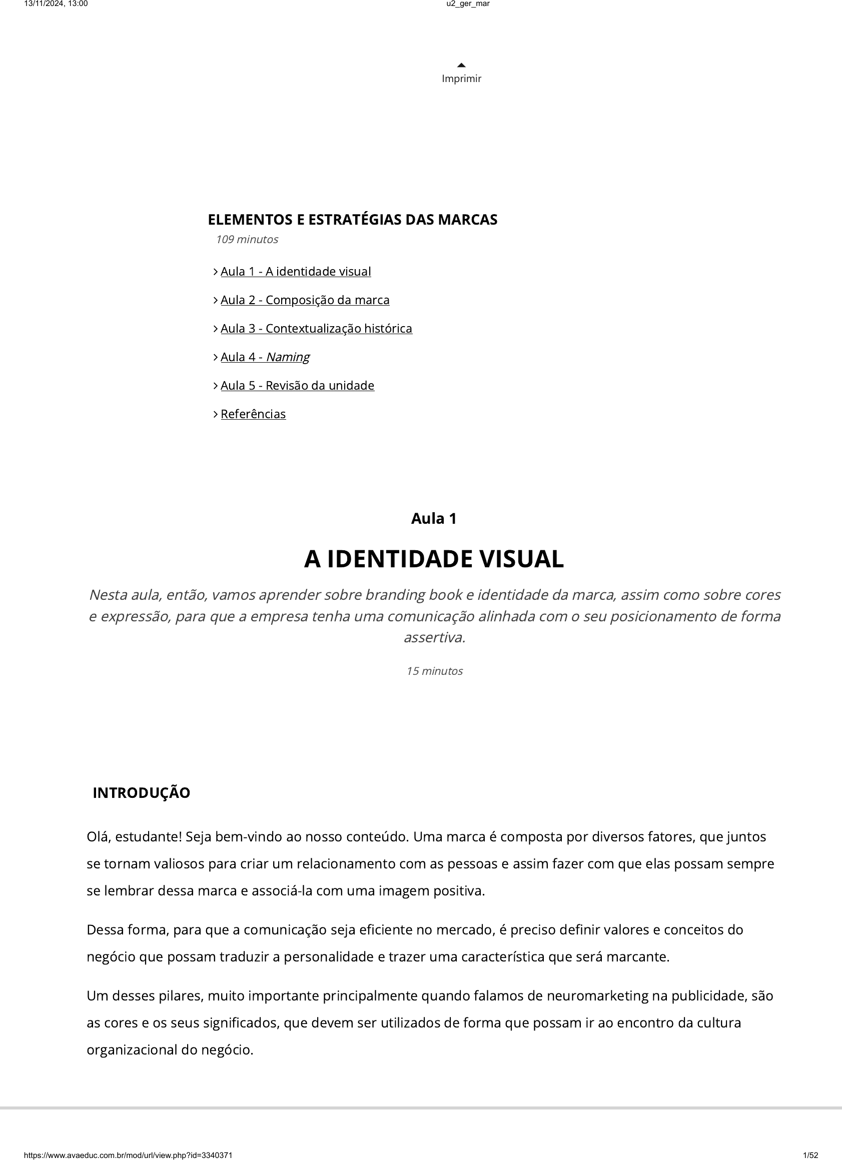 Imprimir INTRODUÇÃO Olá, estudante! Seja bem-vindo ao nosso conteúdo. Uma marca é composta por diversos fatores, que juntos se tornam valiosos para criar um relacionamento com as pessoas e assim fazer com que elas possam sempre se lembrar dessa marca e associá-la com uma imagem positiva. Dessa forma, para que a comunicação seja e�ciente no mercado, é preciso de�nir valores e conceitos do negócio que possam traduzir a personalidade e trazer uma característica que será marcante. Um desses pilares, muito importante principalmente quando falamos de neuromarketing na publicidade, são as cores e os seus signi�cados, que devem ser utilizados de forma que possam ir ao encontro da cultura organizacional do negócio. Aula 1 A IDENTIDADE VISUAL Nesta aula, então, vamos aprender sobre branding book e identidade da marca, assim como sobre cores e expressão, para que a empresa tenha uma comunicação alinhada com o seu posicionamento de forma assertiva. 15 minutos ELEMENTOS E ESTRATÉGIAS DAS MARCAS Aula 1 - A identidade visual Aula 2 - Composição da marca Aula 3 - Contextualização histórica Aula 4 - Naming Aula 5 - Revisão da unidade Referências 109 minutos 13/11/2024, 13:00 u2_ger_mar https://www.avaeduc.com.br/mod/url/view.php?id=3340371 1/52 Nesta aula, então, vamos aprender sobre branding book e identidade da marca, assim como sobre cores e expressão, para que a empresa tenha uma comunicação alinhada com o seu posicionamento de forma assertiva. 13/11/2024, 13:00 u2_ger_mar https://www.avaeduc.com.br/mod/url/view.php?id=3340371 2/52 POSICIONAMENTO DE MARCA NA MENTE DO CONSUMIDOR A gestão de marcas é um processo que tem como objetivo posicionar a marca na mente do consumidor, mostrando seus diferenciais e atraindo o público-alvo para satisfazer as necessidades dessas pessoas, através de produtos ou serviços que são ofertados. A marca é um conjunto de símbolos e signos que tem recursos linguísticos e visuais representativos dos valores relacionados a ela (ABEL, 2019). Vamos entender os principais passos nessa construção: Brand book Conhecido como manual da marca (PATEL, 2022), o brand book é um guia que deve descrever todas as diretrizes da identidade, contemplando aspectos relevantes que compõem a marca. É uma materialização em um documento que traz elementos como missão, valores e apresentação visual, com as características da marca mostrando um conjunto de regras e boas práticas. Seus principais objetivos são: Uni�car a comunicação da empresa. Criar um posicionamento na mente dos consumidores. Humanizar a marca com elementos de personalidade para gerar conexão. Com isso, o brand book é um documento que ajuda a aperfeiçoar a comunicação da marca, apresentando a empresa de forma única, com autoridade e credibilidade no mercado. Identidade de marca A identidade de marca é uma representação de valores e conceitos da empresa, como uma característica única e marcante, para se comunicar com e�ciência no mercado (SACRAMENTO, 2021). Trata-se de logotipos, design de produtos, estrutura de serviços e tudo o que diz respeito à marca, referindo- se à de�nição de missão e valores de uma empresa. Deve reunir elementos visuais e físicos para trazer uma impressão positiva, incluindo: Ser original. Mostrar como a marca realmente é. Propor soluções visíveis no mercado. Construir uma experiência do usuário. Para isso, é preciso de�nir os pilares das cinco dimensões da marca, em uma construção: Física: são elementos que fazem a marca ser única. 13/11/2024, 13:00 u2_ger_mar https://www.avaeduc.com.br/mod/url/view.php?id=3340371 3/52 Cultural: valores que são escolhidos de acordo com o que a empresa quer transmitir. De intersubjetividade: humanização da marca para criar conexões com as pessoas. Auxilia na tomada de decisão de compra. De signi�cado: criar contextualização entre os produtos ou serviços da marca, de modo atrelado ao comportamento dos consumidores que os utilizarão, após a compra. De mentalização: forma como a marca faz parte do pensamento do cliente e a sua personalidade para ser lembrada. Dessa forma, a identidade da marca diz respeito a como o público-alvo a reconhecerá de forma imediata, sempre que se deparar com qualquer um dos elementos da identidade da empresa. Cores e a in�uência na marca Quando nos referimos à construção de marca, as cores e suas expressões precisam ser consideradas para que facilitem a identi�cação do público, ao mesmo tempo que levam um signi�cado, a partir das razões pelas quais forem escolhidas. Assim, as cores não devem ser escolhidas por um gosto pessoal ou modismo (SOUZA, 2019). Na realidade, a escolha deve ser estratégica, para que a marca seja coesa, impactante e expressiva. As cores têm um grande poder de comunicação. Assim, elas criam vínculos emocionais, trazem valores e geram conexão de ideias com as pessoas. Sua escolha deve partir de uma análise profunda baseada no que é a empresa e no que ela quer transmitir. Sendo assim, todos esses pontos na gestão da marca devem ser focados no reconhecimento e fortalecimento dela, bem como no desejo despertado pela marca nos diferentes públicos com os quais ela quer se relacionar no mercado. 13/11/2024, 13:00 u2_ger_mar https://www.avaeduc.com.br/mod/url/view.php?id=3340371 4/52 ESTUDO DA MARCA E DO COMPORTAMENTO DO CONSUMIDOR Sempre que tratamos de gestão de marcas, precisamos analisar o branding, conforme explica Kotler - consultor e autor americano, considerado o pai do marketing (KOTLER, 2000). Segundo ele (TYBOUT, 2017), o ponto de partida nas características exclusivas e próprias de uma marca é um estudo de brand equity, conhecido como valor de marca, que diz respeito ao conjunto de atributos que são intangíveis, ou seja, que agregam muito valor a uma empresa. Na publicidade e propaganda, isso se dá no estudo do comportamento do consumidor, para que esses aspectos sejam de�nido
