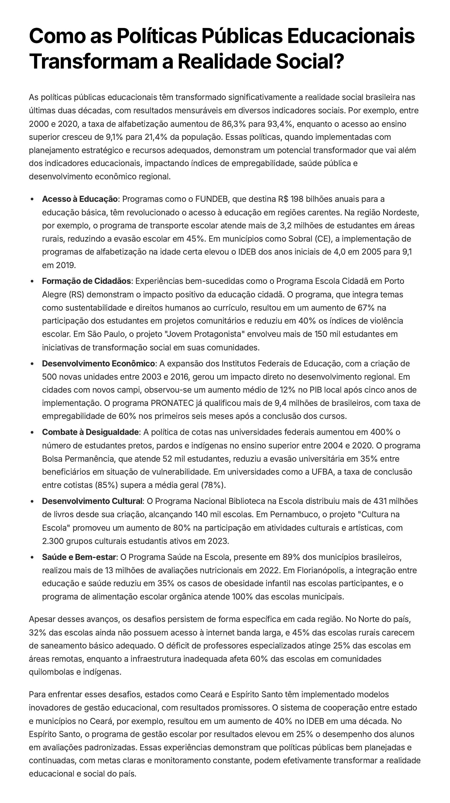 Como as Políticas Públicas Educacionais Transformam a Realidade Social? As políticas públicas educacionais têm transformado significativamente a realidade social brasileira nas últimas duas décadas, com resultados mensuráveis em diversos indicadores sociais. Por exemplo, entre 2000 e 2020, a taxa de alfabetização aumentou de 86,3% para 93,4%, enquanto o acesso ao ensino superior cresceu de 9,1% para 21,4% da população. Essas políticas, quando implementadas com planejamento estratégico e recursos adequados, demonstram um potencial transformador que vai além dos indicadores educacionais, impactando índices de empregabilidade, saúde pública e desenvolvimento econômico regional. Acesso à Educação: Programas como o FUNDEB, que destina R$ 198 bilhões anuais para a educação básica, têm revolucionado o acesso à educação em regiões carentes. Na região Nordeste, por exemplo, o programa de transporte escolar atende mais de 3,2 milhões de estudantes em áreas rurais, reduzindo a evasão escolar em 45%. Em municípios como Sobral (CE), a implementação de programas de alfabetização na idade certa elevou o IDEB dos anos iniciais de 4,0 em 2005 para 9,1 em 2019. Formação de Cidadãos: Experiências bem-sucedidas como o Programa Escola Cidadã em Porto Alegre (RS) demonstram o impacto positivo da educação cidadã. O programa, que integra temas como sustentabilidade e direitos humanos ao currículo, resultou em um aumento de 67% na participação dos estudantes em projetos comunitários e reduziu em 40% os índices de violência escolar. Em São Paulo, o projeto "Jovem Protagonista" envolveu mais de 150 mil estudantes em iniciativas de transformação social em suas comunidades. Desenvolvimento Econômico: A expansão dos Institutos Federais de Educação, com a criação de 500 novas unidades entre 2003 e 2016, gerou um impacto direto no desenvolvimento regional. Em cidades com novos campi, observou-se um aumento médio de 12% no PIB local após cinco anos de implementação. O programa PRONATEC já qualificou mais de 9,4 milhões de brasileiros, com taxa de empregabilidade de 60% nos primeiros seis meses após a conclusão dos cursos. Combate à Desigualdade: A política de cotas nas universidades federais aumentou em 400% o número de estudantes pretos, pardos e indígenas no ensino superior entre 2004 e 2020. O programa Bolsa Permanência, que atende 52 mil estudantes, reduziu a evasão universitária em 35% entre beneficiários em situação de vulnerabilidade. Em universidades como a UFBA, a taxa de conclusão entre cotistas (85%) supera a média geral (78%). Desenvolvimento Cultural: O Programa Nacional Biblioteca na Escola distribuiu mais de 431 milhões de livros desde sua criação, alcançando 140 mil escolas. Em Pernambuco, o projeto "Cultura na Escola" promoveu um aumento de 80% na participação em atividades culturais e artísticas, com 2.300 grupos culturais estudantis ativos em 2023. Saúde e Bem-estar: O Programa Saúde na Escola, presente em 89% dos municípios brasileiros, realizou mais de 13 milhões de avaliações nutricionais em 2022. Em Florianópolis, a integração entre educação e saúde reduziu em 35% os casos de obesidade infantil nas escolas participantes, e o programa de alimentação escolar orgânica atende 100% das escolas municipais. Apesar desses avanços, os desafios persistem de forma específica em cada região. No Norte do país, 32% das escolas ainda não possuem acesso à internet banda larga, e 45% das escolas rurais carecem de saneamento básico adequado. O déficit de professores especializados atinge 25% das escolas em áreas remotas, enquanto a infraestrutura inadequada afeta 60% das escolas em comunidades quilombolas e indígenas. Para enfrentar esses desafios, estados como Ceará e Espírito Santo têm implementado modelos inovadores de gestão educacional, com resultados promissores. O sistema de cooperação entre estado e municípios no Ceará, por exemplo, resultou em um aumento de 40% no IDEB em uma década. No Espírito Santo, o programa de gestão escolar por resultados elevou em 25% o desempenho dos alunos em avaliações padronizadas. Essas experiências demonstram que políticas públicas bem planejadas e continuadas, com metas claras e monitoramento constante, podem efetivamente transformar a realidade educacional e social do país.