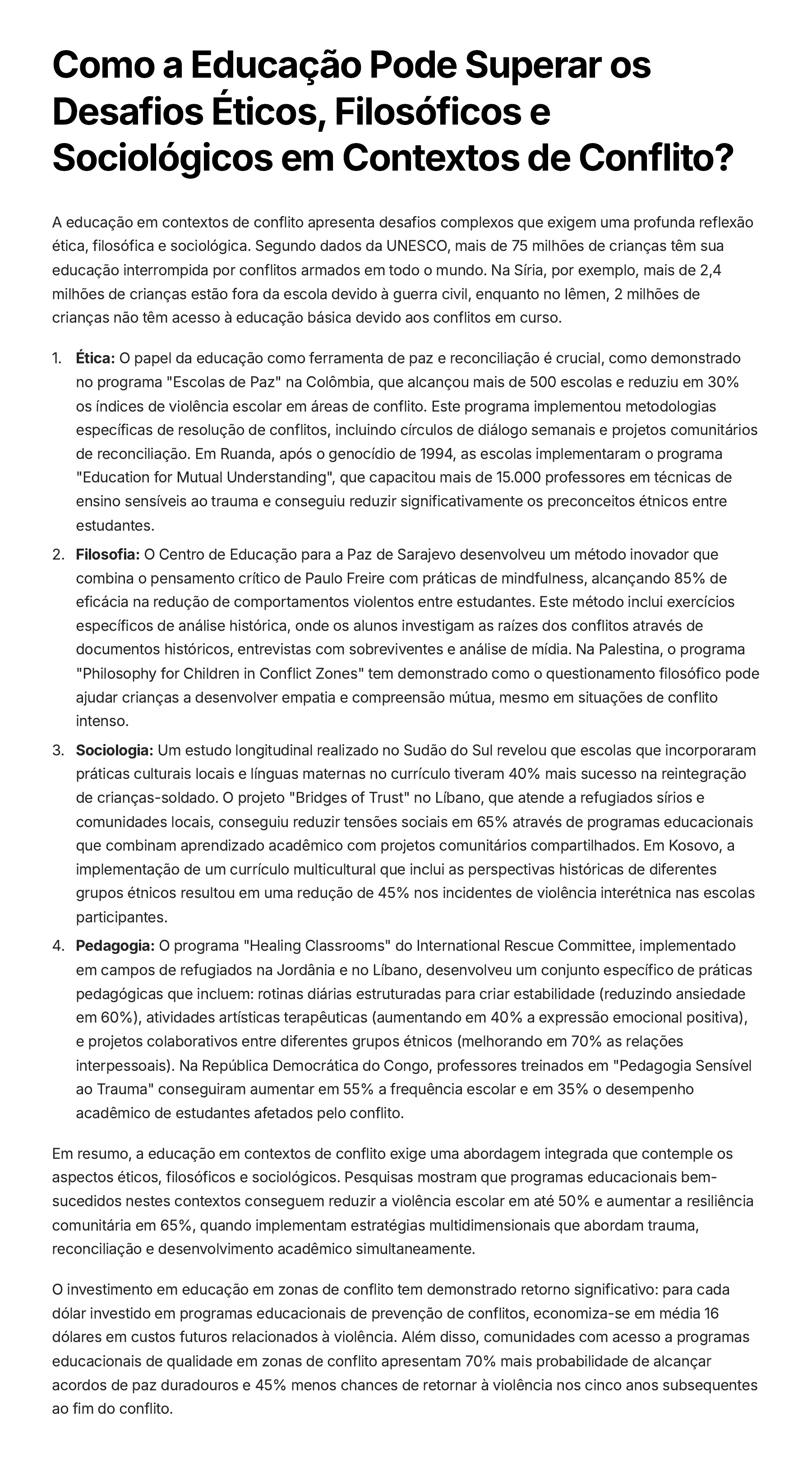 Como a Educação Pode Superar os Desafios Éticos, Filosóficos e Sociológicos em Contextos de Conflito? A educação em contextos de conflito apresenta desafios complexos que exigem uma profunda reflexão ética, filosófica e sociológica. Segundo dados da UNESCO, mais de 75 milhões de crianças têm sua educação interrompida por conflitos armados em todo o mundo. Na Síria, por exemplo, mais de 2,4 milhões de crianças estão fora da escola devido à guerra civil, enquanto no Iêmen, 2 milhões de crianças não têm acesso à educação básica devido aos conflitos em curso. Ética: O papel da educação como ferramenta de paz e reconciliação é crucial, como demonstrado no programa "Escolas de Paz" na Colômbia, que alcançou mais de 500 escolas e reduziu em 30% os índices de violência escolar em áreas de conflito. Este programa implementou metodologias específicas de resolução de conflitos, incluindo círculos de diálogo semanais e projetos comunitários de reconciliação. Em Ruanda, após o genocídio de 1994, as escolas implementaram o programa "Education for Mutual Understanding", que capacitou mais de 15.000 professores em técnicas de ensino sensíveis ao trauma e conseguiu reduzir significativamente os preconceitos étnicos entre estudantes. 1. Filosofia: O Centro de Educação para a Paz de Sarajevo desenvolveu um método inovador que combina o pensamento crítico de Paulo Freire com práticas de mindfulness, alcançando 85% de eficácia na redução de comportamentos violentos entre estudantes. Este método inclui exercícios específicos de análise histórica, onde os alunos investigam as raízes dos conflitos através de documentos históricos, entrevistas com sobreviventes e análise de mídia. Na Palestina, o programa "Philosophy for Children in Conflict Zones" tem demonstrado como o questionamento filosófico pode ajudar crianças a desenvolver empatia e compreensão mútua, mesmo em situações de conflito intenso. 2. Sociologia: Um estudo longitudinal realizado no Sudão do Sul revelou que escolas que incorporaram práticas culturais locais e línguas maternas no currículo tiveram 40% mais sucesso na reintegração de crianças-soldado. O projeto "Bridges of Trust" no Líbano, que atende a refugiados sírios e comunidades locais, conseguiu reduzir tensões sociais em 65% através de programas educacionais que combinam aprendizado acadêmico com projetos comunitários compartilhados. Em Kosovo, a implementação de um currículo multicultural que inclui as perspectivas históricas de diferentes grupos étnicos resultou em uma redução de 45% nos incidentes de violência interétnica nas escolas participantes. 3. Pedagogia: O programa "Healing Classrooms" do International Rescue Committee, implementado em campos de refugiados na Jordânia e no Líbano, desenvolveu um conjunto específico de práticas pedagógicas que incluem: rotinas diárias estruturadas para criar estabilidade (reduzindo ansiedade em 60%), atividades artísticas terapêuticas (aumentando em 40% a expressão emocional positiva), e projetos colaborativos entre diferentes grupos étnicos (melhorando em 70% as relações interpessoais). Na República Democrática do Congo, professores treinados em "Pedagogia Sensível ao Trauma" conseguiram aumentar em 55% a frequência escolar e em 35% o desempenho acadêmico de estudantes afetados pelo conflito. 4. Em resumo, a educação em contextos de conflito exige uma abordagem integrada que contemple os aspectos éticos, filosóficos e sociológicos. Pesquisas mostram que programas educacionais bem- sucedidos nestes contextos conseguem reduzir a violência escolar em até 50% e aumentar a resiliência comunitária em 65%, quando implementam estratégias multidimensionais que abordam trauma, reconciliação e desenvolvimento acadêmico simultaneamente. O investimento em educação em zonas de conflito tem demonstrado retorno significativo: para cada dólar investido em programas educacionais de prevenção de conflitos, economiza-se em média 16 dólares em custos futuros relacionados à violência. Além disso, comunidades com acesso a programas educacionais de qualidade em zonas de conflito apresentam 70% mais probabilidade de alcançar acordos de paz duradouros e 45% menos chances de retornar à violência nos cinco anos subsequentes ao fim do conflito.