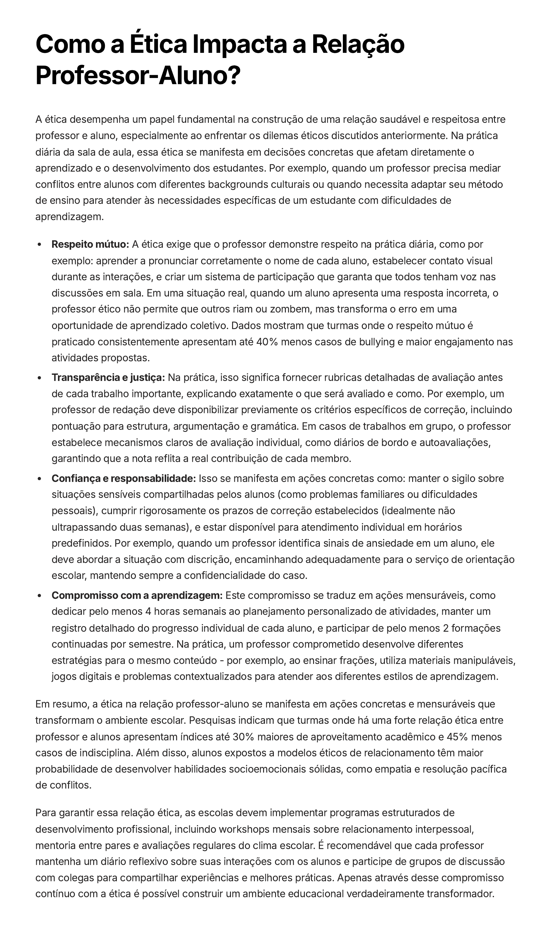Como a Ética Impacta a Relação Professor-Aluno? A ética desempenha um papel fundamental na construção de uma relação saudável e respeitosa entre professor e aluno, especialmente ao enfrentar os dilemas éticos discutidos anteriormente. Na prática diária da sala de aula, essa ética se manifesta em decisões concretas que afetam diretamente o aprendizado e o desenvolvimento dos estudantes. Por exemplo, quando um professor precisa mediar conflitos entre alunos com diferentes backgrounds culturais ou quando necessita adaptar seu método de ensino para atender às necessidades específicas de um estudante com dificuldades de aprendizagem. Respeito mútuo: A ética exige que o professor demonstre respeito na prática diária, como por exemplo: aprender a pronunciar corretamente o nome de cada aluno, estabelecer contato visual durante as interações, e criar um sistema de participação que garanta que todos tenham voz nas discussões em sala. Em uma situação real, quando um aluno apresenta uma resposta incorreta, o professor ético não permite que outros riam ou zombem, mas transforma o erro em uma oportunidade de aprendizado coletivo. Dados mostram que turmas onde o respeito mútuo é praticado consistentemente apresentam até 40% menos casos de bullying e maior engajamento nas atividades propostas. Transparência e justiça: Na prática, isso significa fornecer rubricas detalhadas de avaliação antes de cada trabalho importante, explicando exatamente o que será avaliado e como. Por exemplo, um professor de redação deve disponibilizar previamente os critérios específicos de correção, incluindo pontuação para estrutura, argumentação e gramática. Em casos de trabalhos em grupo, o professor estabelece mecanismos claros de avaliação individual, como diários de bordo e autoavaliações, garantindo que a nota reflita a real contribuição de cada membro. Confiança e responsabilidade: Isso se manifesta em ações concretas como: manter o sigilo sobre situações sensíveis compartilhadas pelos alunos (como problemas familiares ou dificuldades pessoais), cumprir rigorosamente os prazos de correção estabelecidos (idealmente não ultrapassando duas semanas), e estar disponível para atendimento individual em horários predefinidos. Por exemplo, quando um professor identifica sinais de ansiedade em um aluno, ele deve abordar a situação com discrição, encaminhando adequadamente para o serviço de orientação escolar, mantendo sempre a confidencialidade do caso. Compromisso com a aprendizagem: Este compromisso se traduz em ações mensuráveis, como dedicar pelo menos 4 horas semanais ao planejamento personalizado de atividades, manter um registro detalhado do progresso individual de cada aluno, e participar de pelo menos 2 formações continuadas por semestre. Na prática, um professor comprometido desenvolve diferentes estratégias para o mesmo conteúdo - por exemplo, ao ensinar frações, utiliza materiais manipuláveis, jogos digitais e problemas contextualizados para atender aos diferentes estilos de aprendizagem. Em resumo, a ética na relação professor-aluno se manifesta em ações concretas e mensuráveis que transformam o ambiente escolar. Pesquisas indicam que turmas onde há uma forte relação ética entre professor e alunos apresentam índices até 30% maiores de aproveitamento acadêmico e 45% menos casos de indisciplina. Além disso, alunos expostos a modelos éticos de relacionamento têm maior probabilidade de desenvolver habilidades socioemocionais sólidas, como empatia e resolução pacífica de conflitos. Para garantir essa relação ética, as escolas devem implementar programas estruturados de desenvolvimento profissional, incluindo workshops mensais sobre relacionamento interpessoal, mentoria entre pares e avaliações regulares do clima escolar. É recomendável que cada professor mantenha um diário reflexivo sobre suas interações com os alunos e participe de grupos de discussão com colegas para compartilhar experiências e melhores práticas. Apenas através desse compromisso contínuo com a ética é possível construir um ambiente educacional verdadeiramente transformador.