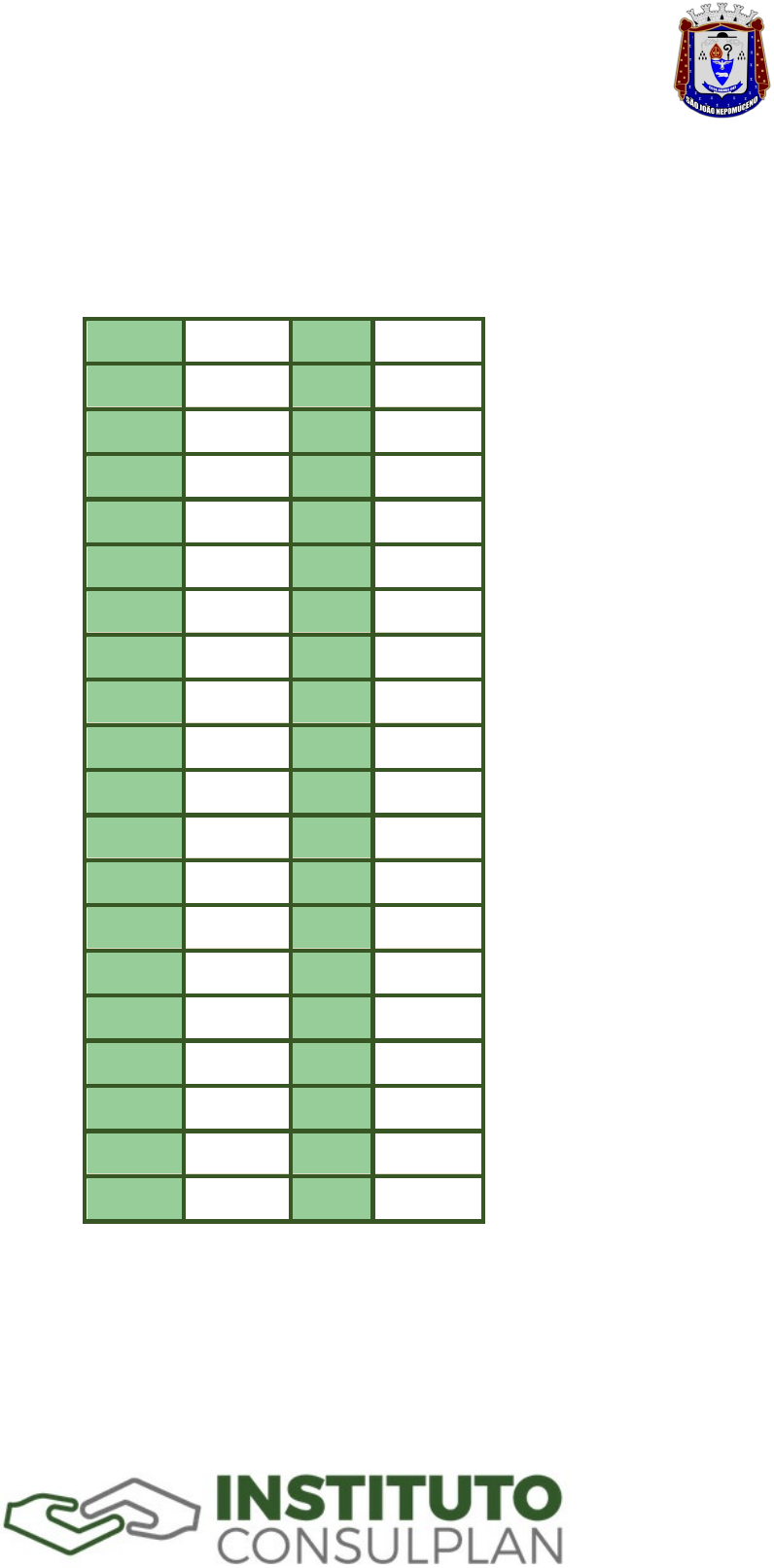 GABARITO PRELIMINAR – CONCURSO PÚBLICO PREFEITURA MUNICIPAL DE SÃO JOÃO NEPOMUCENO CARGO: TÉCNICO DE NÍVEL SUPERIOR – ASSISTENTE SOCIAL PROVA – TIPO 1 – BRANCA 01 D 21 B 02 D 22 B 03 B 23 C 04 C 24 D 05 B 25 D 06 B 26 D 07 A 27 C 08 B 28 B 09 B 29 D 10 A 30 B 11 C 31 A 12 D 32 D 13 A 33 A 14 A 34 B 15 D 35 C 16 D 36 D 17 D 37 D 18 A 38 D 19 A 39 B 20 A 40 C GABARITO PRELIMINAR – CONCURSO PÚBLICO PREFEITURA MUNICIPAL DE SÃO JOÃO NEPOMUCENO CARGO: PROFESSOR REGENTE II – CIÊNCIAS PROVA – TIPO 1 – BRANCA 01 A 21 A 02 A 22 A 03 B 23 D 04 A 24 C 05 A 25 C 06 C 26 C 07 D 27 D 08 A 28 B 09 B 29 C 10 B 30 D 11 C 31 A 12 D 32 B 13 D 33 C 14 B 34 B 15 D 35 B 16 B 36 B 17 A 37 D 18 C 38 B 19 D 39 B 20 A 40 C GABARITO PRELIMINAR – CONCURSO PÚBLICO PREFEITURA MUNICIPAL DE SÃO JOÃO NEPOMUCENO CARGO: PROFESSOR REGENTE II – EDUCAÇÃO FÍSICA PROVA – TIPO 1 – BRANCA 01 A 21 A 02 A 22 A 03 B 23 D 04 A 24 C 05 A 25 C 06 C 26 C 07 D 27 D 08 A 28 B 09 B 29 C 10 B 30 D 11 C 31 B 12 D 32 D 13 D 33 A 14 B 34 A 15 D 35 B 16 B 36 B 17 A 37 A 18 C 38 D 19 D 39 D 20 A 40 D GABARITO PRELIMINAR – CONCURSO PÚBLICO PREFEITURA MUNICIPAL DE SÃO JOÃO NEPOMUCENO CARGO: AUXILIAR DE APRENDIZAGEM PARA ESTUDANTE COM DEFICIÊNCIA PROVA – TIPO 1 – BRANCA 01 C 21 B 02 B 22 B 03 B 23 C 04 A 24 C 05 D 25 D 06 D 26 A 07 A 27 A 08 D 28 D 09 D 29 D 10 C 30 B 11 C 31 C 12 D 32 A 13 A 33 A 14 C 34 D 15 D 35 A 16 D 36 C 17 C 37 B 18 B 38 C 19 C 39 D 20 C 40 D GABARITO PRELIMINAR – CONCURSO PÚBLICO PREFEITURA MUNICIPAL DE SÃO JOÃO NEPOMUCENO CARGO: PROFESSOR REGENTE II – HISTÓRIA PROVA – TIPO 1 – BRANCA 01 A 21 A 02 A 22 A 03 B 23 D 04 A 24 C 05 A 25 C 06 C 26 C 07 D 27 D 08 A 28 B 09 B 29 C 10 B 30 D 11 C 31 D 12 D 32 A 13 D 33 C 14 B 34 B 15 D 35 C 16 B 36 D 17 A 37 C 18 C 38 A 19 D 39 A 20 A 40 A GABARITO PRELIMINAR – CONCURSO PÚBLICO PREFEITURA MUNICIPAL DE SÃO JOÃO NEPOMUCENO CARGO: PROFESSOR REGENTE II – GEOGRAFIA PROVA – TIPO 1 – BRANCA 01 A 21 A 02 A 22 A 03 B 23 D 04 A 24 C 05 A 25 C 06 C 26 C 07 D 27 D 08 A 28 B 09 B 29 C 10 B 30 D 11 C 31 D 12 D 32 D 13 D 33 C 14 B 34 C 15 D 35 C 16 B 36 C 17 A 37 D 18 C 38 C 19 D 39 B 20 A 40 D GABARITO PRELIMINAR – CONCURSO PÚBLICO PREFEITURA MUNICIPAL DE SÃO JOÃO NEPOMUCENO CARGO: AGENTE ADMINISTRATIVO PROVA – TIPO 1 – BRANCA 01 A 16 B 02 B 17 D 03 C 18 C 04 B 19 B 05 A 20 C 06 B 21 D 07 B 22 A 08 C 23 B 09 C 24 B 10 D 25 A 11 A 26 A 12 D 27 D 13 B 28 A 14 D 29 C 15 B 30 A GABARITO PRELIMINAR – CONCURSO PÚBLICO PREFEITURA MUNICIPAL DE SÃO JOÃO NEPOMUCENO CARGO: AUXILIAR DE SERVIÇOS GERAIS PROVA – TIPO 1 – BRANCA 01 A 16 A 02 A 17 C 03 D 18 B 04 D 19 B 05 B 20 D 06 D 21 C 07 C 22 A 08 A 23 A 09 C 24 A 10 B 25 C 11 A 26 A 12 C 27 C 13 B 28 D 14 C 29 A 15 C 30 D GABARITO PRELIMINAR – CONCURSO PÚBLICO PREFEITURA MUNICIPAL DE SÃO JOÃO NEPOMUCENO CARGO: PROFESSOR REGENTE II – MATEMÁTICA PROVA – TIPO 1 – BRANCA 01 A 21 A 02 A 22 A 03 B 23 D 04 A 24 C 05 A 25 C 06 C 26 C 07 D 27 D 08 A 28 B 09 B 29 C 10 B 30 D 11 C 31 D 12 D 32 D 13 D 33 B 14 B 34 B 15 D 35 A 16 B 36 A 17 A 37 A 18 C 38 B 19 D 39 D 20 A 40 D GABARITO PRELIMINAR – CONCURSO PÚBLICO PREFEITURA MUNICIPAL DE SÃO JOÃO NEPOMUCENO CARGO: AGENTE DE COMBATE A ENDEMIAS PROVA – TIPO 1 – BRANCA 01 B 21 D 02 B 22 D 03 C 23 A 04 B 24 C 05 A 25 A 06 B 26 A 07 C 27 D 08 A 28 C 09 A 29 A 10 C 30 D 11 C 31 B 12 C 32 C 13 A 33 B 14 C 34 D 15 B 35 D 16 B 36 D 17 B 37 C 18 D 38 D 19 D 39 C 20 C 40 C GABARITO PRELIMINAR – CONCURSO PÚBLICO PREFEITURA MUNICIPAL DE SÃO JOÃO NEPOMUCENO CARGO: PROFESSOR REGENTE II – LÍNGUA PORTUGUESA PROVA – TIPO 1 – BRANCA 01 A 21 A 02 A 22 A 03 B 23 D 04 A 24 C 05 A 25 C 06 C 26 C 07 D 27 D 08 A 28 B 09 B 29 C 10 B 30 D 11 C 31 D 12 D 32 A 13 D 33 A 14 B 34 D 15 D 35 B 16 B 36 A 17 A 37 C 18 C 38 B 19 D 39 C 20 A 40 C GABARITO PRELIMINAR – CONCURSO PÚBLICO PREFEITURA MUNICIPAL DE SÃO JOÃO NEPOMUCENO CARGO: MOTORISTA II PROVA – TIPO 1 – BRANCA 01 B 16 A 02 A 17 C 03 B 18 C 04 B 19 B 05 A 20 C 06 A 21 A 07 B 22 D 08 B 23 D 09 B 24 D 10 B 25 B 11 C 26 B 12 C 27 D 13 D 28 B 14 A 29 D 15 B 30 C GABARITO PRELIMINAR – CONCURSO PÚBLICO PREFEITURA MUNICIPAL DE SÃO JOÃO NEPOMUCENO CARGO: OFICIAL I PROVA – TIPO 1 – BRANCA 01 B 16 A 02 A 17 C 03 B 18 C 04 B 19 B 05 A 20 C 06 A 21 A 07 B 22 D 08 B 23 D 09 B 24 D 10 B 25 B 11 C 26 B 12 C 27 D 13 D 28 B 14 A 29 D 15 B 30 C GABARITO PRELIMINAR – CONCURSO PÚBLICO PREFEITURA MUNICIPAL DE SÃO JOÃO NEPOMUCENO CARGO: OFICIAL II PROVA – TIPO 1 – BRANCA 01 B 16 A 02 A 17 C 03 B 18 C 04 B 19 B 05 A 20 C 06 A 21 A 07 B 22 D 08 B 23 D 09 B 24 D 10 B 25 B 11 C 26 B 12 C 27 D 13 D 28 B 14 A 29 D 15 B 30 C GABARITO PRELIMINAR – CONCURSO PÚBLICO PREFEITURA MUNICIPAL DE SÃO JOÃO NEPOMUCENO CARGO: SERVENTE ESCOLAR PROVA – TIPO 1 – BRANCA 01 B 16 A 02 A 17 C 03 B 18 C 04 B 19 B 05 A 20 C 06 A 21 A 07 B 22 D 08 B 23 D 09 B 24 D 10 B 25 B 11 C 26 B 12 C 27 D 13 D 28 B 14 A 29 D 15 B 30 C GABARITO PRELIMINAR – CONCURSO PÚBLICO PREFEITURA MUNICIPAL DE SÃO JOÃO NEPOMUCENO CARGO: OPERADOR DE MÁQUINA PROVA – TIPO 1 – BRANCA 01 C 16 D 02 A 17 D 03 A 18 D 04 A 19 C 05 D 20 C 06 D 21 A 07 C 22 D 08 B 23 D 09 D 24 D 10 C 25 A 11 C 26 B 12 B 27 A 13 B 28 B 14 B 29 C 15 A 30 B GABARITO PRELIMINAR – CONCURSO PÚBLICO PREFEITURA MUNICIPAL DE SÃO JOÃO NEPOMUCENO CARGO: ATENDENTE DE SAÚDE PROVA – TIPO 1 – BRANCA 01 C 16 D 02 A 17 D 03 A 18 D 04 A 19 C 05 D 20 C 06 D 21 A 07 C 22 D 08 B 23 D 09 D 24 D 10 C 25 A 11 C 26 B 12 B 27 A 13 B 28 B 14 B 29 C 15 A 30 B GABARITO PRELIMINAR – CONCURSO PÚBLICO PREFEITURA MUNICIPAL DE SÃO JOÃO NEPOMUCENO CARGO: AUXILIAR DE SAÚDE BUCAL PROVA – TIPO 1 – BRANCA 01 C 16 D 02 A 17 D 03 A 18 D 04 A 19 C 05 D 20 C 06 D 21 A 07 C 22 D 08 B 23 D 09 D 24 D 10 C 25 A 11 C 26 B 12 B 27 A 13 B 28 B 14 B 29 C 15 A 30 B GABARITO PRELIMINAR – CONCURSO PÚBLICO PREFEITURA MUNICIPAL DE SÃO JOÃO NEPOMUCENO CARGO: TÉCNIC