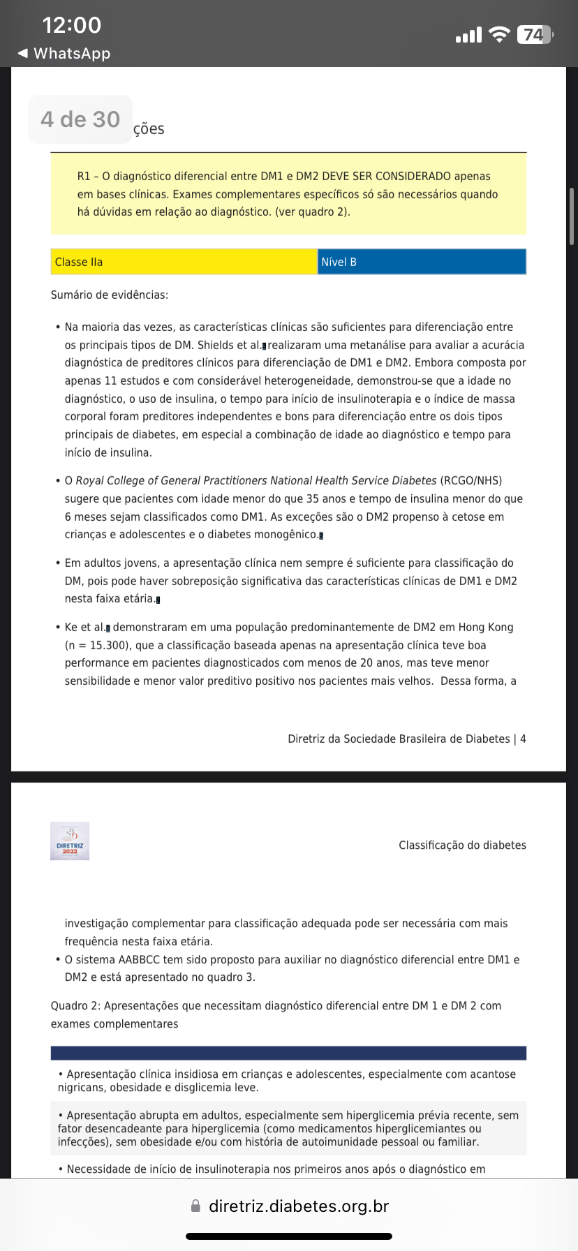 12:00 74 WhatsApp 4 de 30 ções R1 o diagnóstico diferencial entre DM1 e DM2 DEVE SER CONSIDERADO apenas em bases clínicas. Exames complementares específicos só são necessários quando há dúvidas em relação ao diagnóstico. (ver quadro 2). Classe lla Nível Sumário de evidências: Na maioria das vezes, as características clínicas são suficientes para diferenciação entre os principais tipos de DM. Shields et uma metanálise para avaliar a acurácia diagnóstica de preditores clínicos para diferenciação de DM1 e DM2. Embora composta por apenas 11 estudos e com considerável heterogeneidade, demonstrou-se que a idade no diagnóstico, 0 uso de insulina, tempo para início de insulinoterapia e índice de massa corporal foram preditores independentes e bons para diferenciação entre os dois tipos principais de diabetes, em especial a combinação de idade ao diagnóstico e tempo para início de insulina. o Royal College of General Practitioners National Health Service Diabetes (RCGO/NHS) sugere que pacientes com idade menor do que 35 anos e tempo de insulina menor do que 6 meses sejam classificados como DM1. As exceções são o DM2 propenso à cetose em crianças e adolescentes e o diabetes Em adultos jovens, a apresentação clínica nem sempre é suficiente para classificação do DM, pois pode haver sobreposição significativa das características clínicas de DM1 e DM2 nesta faixa etária. Ke et demonstraram em uma população predominantemente de DM2 em Hong Kong (n = 15.300), que a classificação baseada apenas na apresentação clínica teve boa performance em pacientes diagnosticados com menos de 20 anos, mas teve menor sensibilidade e menor valor preditivo positivo nos pacientes mais velhos. Dessa forma, a Diretriz da Sociedade Brasileira de Diabetes 4 DIRETRIZ Classificação do diabetes 2022 investigação complementar para classificação adequada pode ser necessária com mais frequência nesta faixa etária. o sistema AABBCC tem sido proposto para auxiliar no diagnóstico diferencial entre DM1 e DM2 e está apresentado no quadro 3. Quadro 2: Apresentações que necessitam diagnóstico diferencial entre DM 1 e DM 2 com exames complementares Apresentação clínica insidiosa em crianças e adolescentes, especialmente com acantose nigricans, obesidade e disglicemia leve. Apresentação abrupta em adultos especialmente sem hiperglicemia prévia recente, sem fator desencadeante para hiperglicemia (como medicamentos hiperglicemiantes ou infecções), sem obesidade e/ou com história de autoimunidade pessoal ou Necessidade de início de insulinoterapia nos primeiros anos após 0 diagnóstico em diretriz.diabetes.org.br