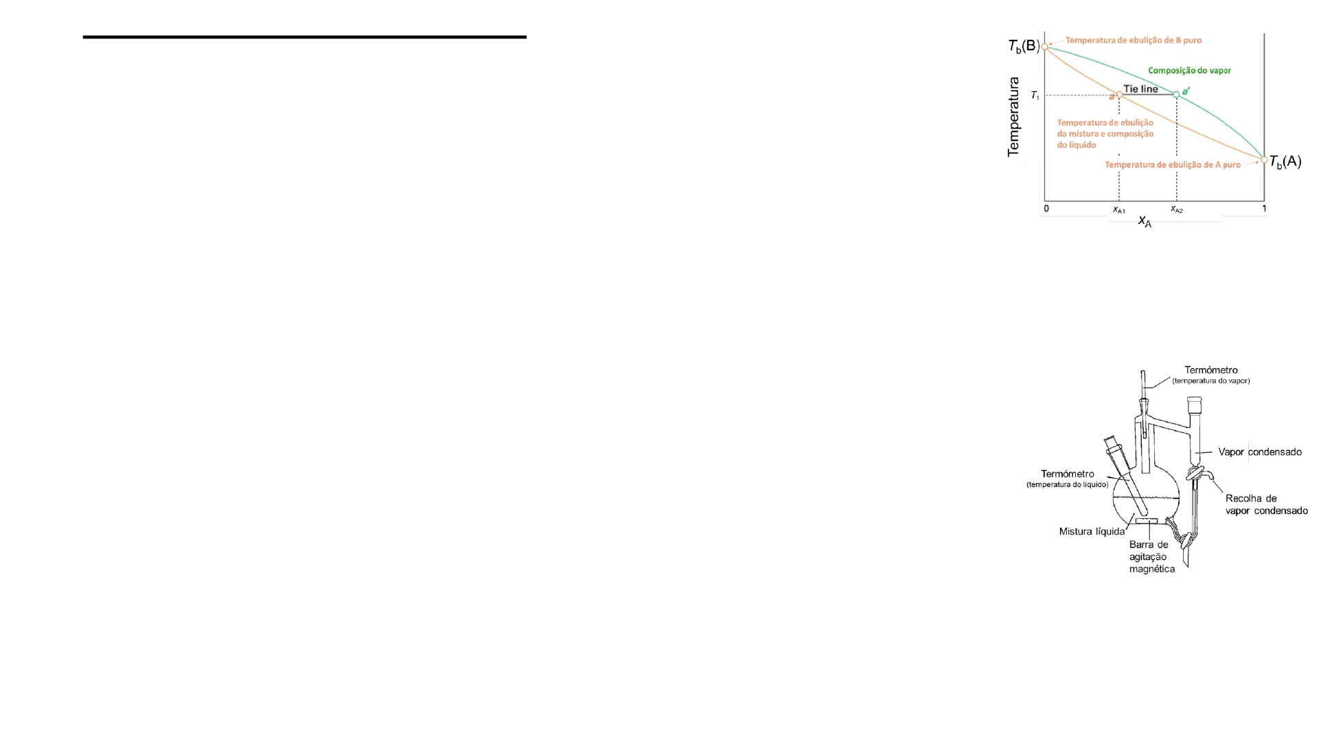 13. Diagramas de fases de misturas Como vimos, quando tratámos de substâncias puras, um diagrama de fases mostra qual fase mais estável nas condições experimentais que interessa considerar. Os diagramas de fases mais úteis para misturas são do tipo temperatura-composição (T-x) e aplicam-se, essencialmente, aos equilíbrios líquido-vapor (misturas de líquidos voláteis), líquido-líquido (misturas de líquidos parcialmente miscíveis) e sólido-líquido (misturas de sólidos e líquidos). Tal como até agora serão ilustrados para misturas binárias. 13.1. Diagramas líquido-vapor para misturas de líquidos voláteis A Figura 24.1 mostra um diagrama de fases típico de uma mistura binária de dois líquidos voláteis A e B. Este tipo de diagrama é essencial para entender a destilação fracionada, que é uma técnica amplamente utilizada na indústria e no laboratório. O diagrama indica que uma mistura cuja fração molar do componente A é xA1, entra em ebulição à temperatura T1 (ponto a). A essa mesma temperatura (ponto a’) o vapor está em equilíbrio com o líquido, sendo também constituído por dois componentes. Mas, tal como seria de esperar, é mais rico do que o líquido no componente mais volátil, A, ao qual corresponde a menor temperatura de ebulição, ou seja, Tb(A)removido, o líquido restante fica ainda mais rico no componente B e a sua composição do desloca-se para a4. • Mas agora a composição do líquido e do vapor tornam-se idênticas. • Nesta fase, a evaporação ocorre sem mudança de composição sendo impossível separar so dois components porque o vapor condensado retém a composição do líquido original. Diz-se então que a mistura forma um azeótropo. O termo foi proposto em 1911 pelo químico inglês John Wade a partir das palavras Gregas ζέειν (ferver) e τρόπος (mudança) e do prefixo de negação α- (não), para originar o significado global “ferver sem modificação”. Um exemplo de azeótropo positivo é o sistema ácido clorídrico/água, em que a mistura azeotrópica corresponde a 80% de água (em massa) e pode ser mantida inalterada em ebulição a 108.6 ºC. O sistema mostrado de Figura 24.7b também é azeotrópico, mas de caráter diferente. Consideremos, neste caso que a mistura corresponde inicialmente à composição a1. • A mistura entra em ebulição a2, originando um vapor de composição a’2. • Este vapor condensa na coluna para dar um líquido de composição a3. • Esse líquido atinge o equilíbrio com um vapor de composição a’3. A continuação do fracionamento, desloca o vapor até composição azeotrópica em a4. Mas, uma vez atingido esse ponto, o o vapor e o líquido mantêm a mesma composição e é impossível continuar a enriquecer o líquido no componente B. Um exemplo de azeótropo negativo é a mistura etanol/água (4% de água em massa) cuja temperatura de ebulição é 78 ° C. 13.2. Diagramas líquido-líquido Líquidos parcialmente miscíveis são aqueles que não se misturam em todas as proporções. A Figura 24.8 mostra um diagrama temperatura-composição típico para uma mistura binária deste tipo. A linha paraboloide marca a separação entre as zonas do diagrama em que o sistema é bifásico e monofásico. Figura 24.8. Diagrama temperatura- composição típico de uma mistura de líquidos parcialmente miscíveis. Figura 24.9. Montagem para obtenção de um diagrama temperatura-composição de uma mistura binária de líquidos parcialmente miscíveis. Diagramas como o da Figura 24.8 podem ser obtidos experimentalmente usando uma montagem semelhante à da Figura 24.9. Consideremos que o recipiente contém inicialmente uma mistura líquida com composição e temperatura correspondentes ao ponto ao da Figura 24.8. Nestas condições os dois componentes não são completamente miscíveis e, assim que a mistura é colocada em agitação, as duas fases inicialmente separadas são dsipersas, observando-se turvação. A temperatura é, em seguida aumentada até se observar o desaparecimento da turbidez, indicando que o sistema passou a ser monofásico (completamente miscível). Isto acontece à temperatura correspondente ao ponto a1. Repetindo a experiência para uma série de misturas diferentes é possível traçar a curva da Figura 24.8, que, como atrás mencionado marca a fronteira entre as zonas bifásica e monofásica. Suponhamos que inicialmente existe apenas hexano (hx) puro à temperatura T’ (xN = 0). Adicionando nitrobenzeno (N) o sistema permanecerá monofásico até ao ponto a’. A partir daí a amostra passa a ser constituída por duas fases em equilíbrio uma com a outra: a fase mais abundante com a composição do ponto a’ é constituída por hexano saturado com nitrobenzeno; a menos abundante representada pelo ponto a” é composta por uma pequena quantidade de nitrobenzeno saturado com hexano. Tal como no caso do equilíbro líquido-vapor, também aqui a É também possivel analisar o comportamento de uma mistura de líquidos parcialmente miscíveis à medida que a sua composição vai variando, a temperatura constante. Consideremos o sistema hexano/nitrobenzeno, cujo diagrama está representado na Figura 24.10. Figura 24.10. Diagrama temperatura- composição típico do sistema hexano (Hx)/nitrobenzeno (N). Quantidade da fase com composição ' ' Quantidade da fase com composição '' " a l a l = Continuando a adicionar nitrobenzeno a composição global da mistura move-se para a direita no diagrama de fases, mas as composições das duas fases em equilíbrio permanecem iguais a a’ e a”. No entanto, nesse processo, a quantidade da fase a” vai aumentando à custa da diminuição da fase a’, de acordo com a regra da alavanca. Quando a composição global da mistura atinge o ponto a”, a quantidade de nitrobenzeno presente é suficiente para dissolver todo o hexano, e o sistema torna-se novamente monofásico. Aumentando posteriormente a tempertur