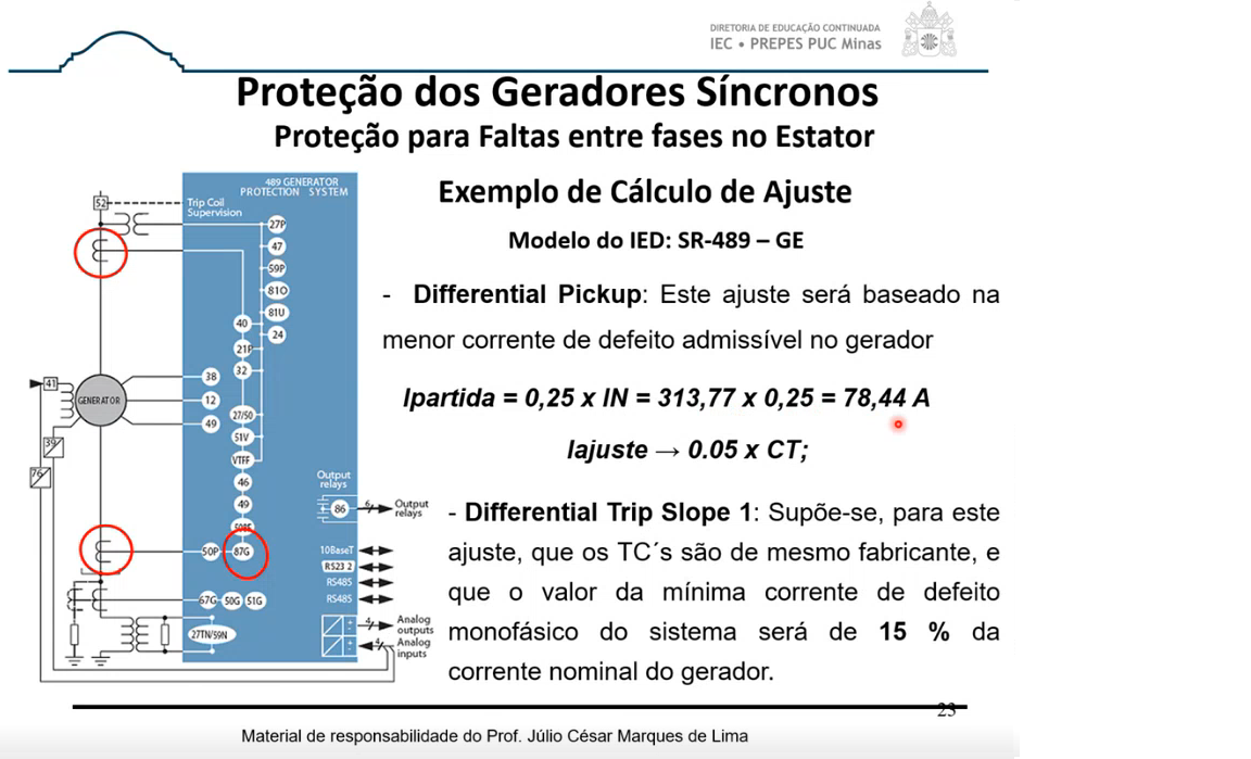 DIRETORIA DE EDUCAÇÃO CONTINUADA IEC PREPES PUC Minas Proteção dos Geradores Síncronos Proteção para Faltas entre fases no Estator GENERATOR PROTECTION SYSTEM 52 Trip Coi Exemplo de Cálculo de Ajuste Supervision Modelo do IED: SR-489 - GE & 47 59P 810 - Differential Pickup: Este ajuste será baseado na 81U 40 24 menor corrente de defeito admissível no gerador 32 38 41 GENERATOR 12 Ipartida = 0,25 X IN = 313,77 X 0,25 = 78,44 A 27/50 49 39 SIV lajuste 0.05 X CT; Output 46 relays 49 86 Output relays - Differential Trip Slope 1: Supõe-se, para este CORE 87G ajuste, que os TC's são de mesmo fabricante, e RS23 RS485 67G SOG que o valor da mínima corrente de defeito : Analog 27TN/59N outputs monofásico do sistema será de 15 % da Analog inputs corrente nominal do gerador. Material de responsabilidade do Prof. Júlio César Marques de Lima