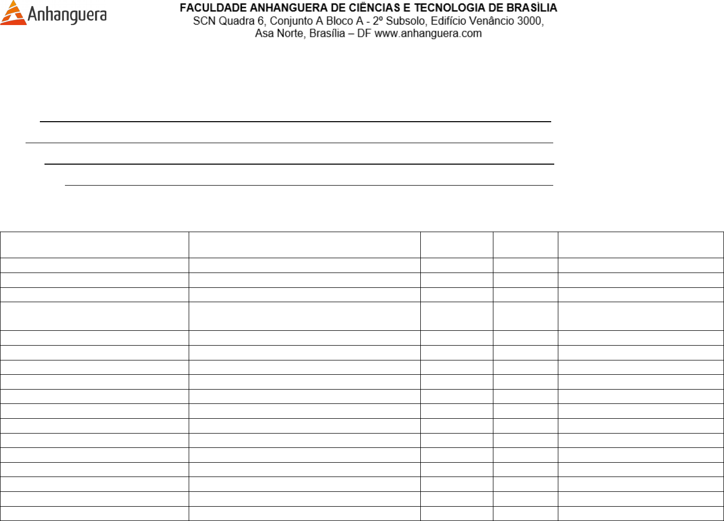 PLANILHA DE ATIVIDADES DE ESTÁGIO SUPERVISIONADO Est. Básico IV – Práticas Individuais e Grupais Aluno: _ Elizama ferreira de Oliveira ___________________________________________________________ RA: __121636957988________________________________________________________________________ Turma: _6º Semestre Noturno _________________________________________________________________ Supervisor: _ Melissa Souza __________________________________________________________________ Descrição de atividade Local das atividades Data Carga horária Observações (professor, supervisor) Aula de orientação e ambientação Faculdade Anhanguera Brasília-Asa Norte 10/08/2024 4h00min Aula de orientação e ambientação Faculdade Anhanguera Brasília-Asa Norte 17/08/2024 4h00min Aula de orientação e ambientação Faculdade Anhanguera Brasília-Asa Norte 24/08/2024 4h00min 1º Vivência Junto ao Estágio Supervisionado Centro Educacional São Francisco 31/08/2024 4h00min Supervisão Faculdade Anhanguera Brasília-Asa Norte 05/09/2024 4h00min 1º Prova Faculdade Anhanguera Brasília-Asa Norte 05/09/2024 2h00min Supervisão Faculdade Anhanguera Brasília-Asa Norte 12/09/2024 2h00min 1º dia de Campo de Estágio Creche Monte Moriá 13/09/2024 2h00min Supervisão Faculdade Anhanguera Brasília-Asa Norte 19/09/2024 2h00min 2º dia de Campo de Estágio Creche Monte Moriá 20/09/2024 4h00min Supervisão Faculdade Anhanguera Brasília-Asa Norte 26/09/2024 2h00min 3º dia de Campo de Estágio Creche Monte Moriá 27/09/2024 4h00min Supervisão Faculdade Anhanguera Brasília-Asa Norte 03/10/2024 2h00min 4º dia de Campo de Estágio Creche Monte Moriá 04/10/2024 4h00min Supervisão Faculdade Anhanguera Brasília-Asa Norte 10/10/2024 2h00min 5º dia de Campo de Estágio Creche Monte Moriá 11/10/2024 4h00min Supervisão Faculdade Anhanguera Brasília-Asa Norte 17/10/2024 2h00min 6º dia de Campo de Estágio Creche Monte Moriá 18/10/2024 4h00min Supervisão Faculdade Anhanguera Brasília-Asa Norte 24/10/2024 2h00min 7º dia de Campo de Estágio Creche Monte Moriá 25/10/2024 4h00min Prova Faculdade Anhanguera Brasília-Asa Norte 31/10/2024 2h00min 8º dia de Campo de Estágio Creche Monte Moriá 01/11/2024 4h00min Supervisão Faculdade Anhanguera Brasília-Asa Norte 07/11/2024 2h00min 9º dia de Campo de Estágio Creche Monte Moriá 08/11/2024 4h00min Encerramento Centro Educacional São Francisco 09/11/2024 2h00min Elaboração de Relatório Final Home Office 18/11/2024 4h00min feedback Faculdade Anhanguera Brasília-Asa Norte 26/11/2024 2h00min Total 84horas Assinatura do Aluno _________________________ Página ___ de ___ Assinatura e carimbo do Supervisor__________________________ image1.png image2.png
