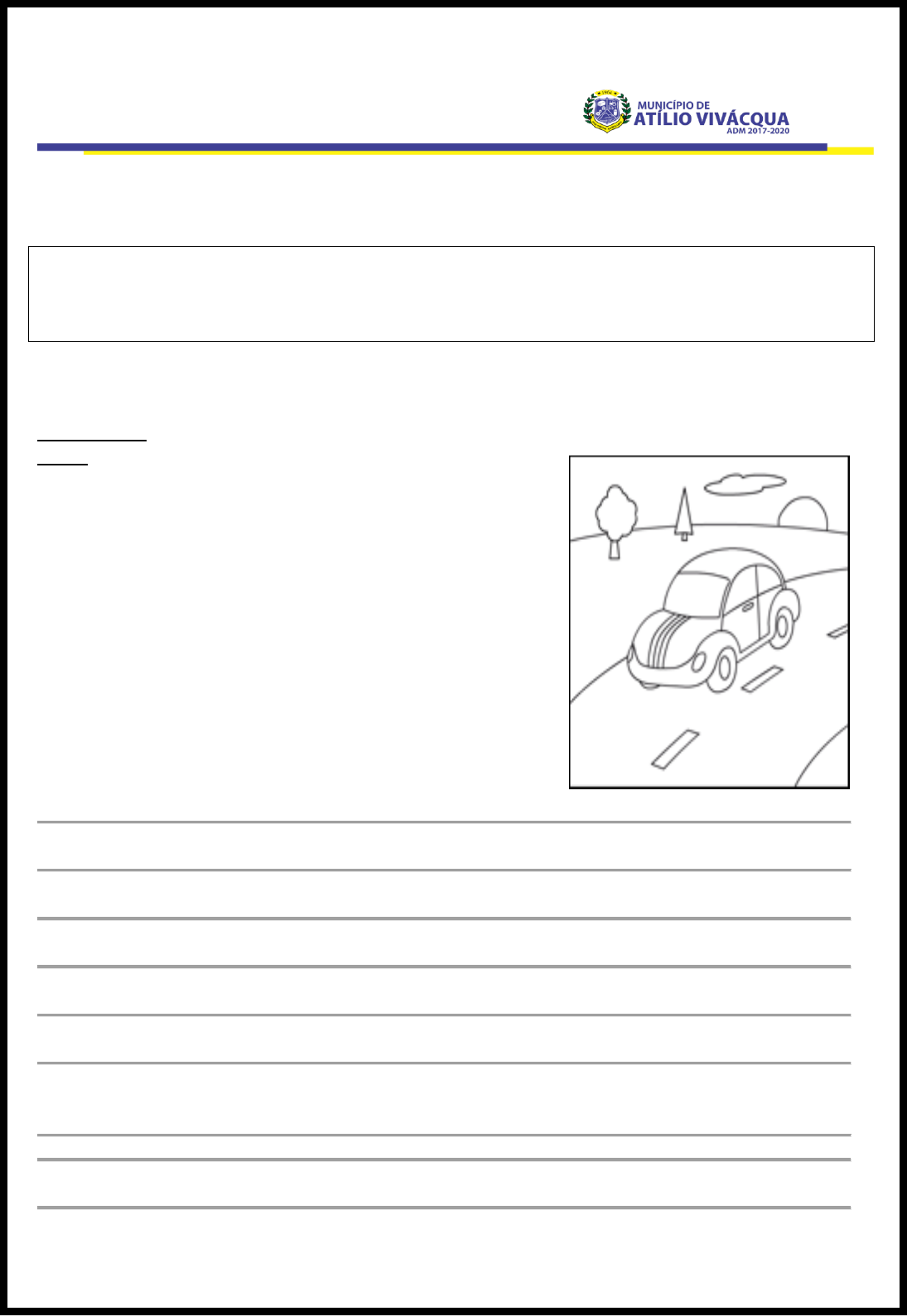 <p>“Ensinar para Aprender, Valorizar para Ter!”</p><p>“Feliza Nação cujo Deus é o Senhor!”</p><p>ATIVIDADES DOMICILIARES SEMANAIS DAS TURMAS DE 2º ANO</p><p>PERÍODO:21/09/2020 A 25/09/2020</p><p>ESCOLA MUNICIPAL DE EDUCAÇÃO BÁSICA “________________________________”</p><p>PROFESSOR (A)_________________________________________________________</p><p>ALUNO (A)_______________________________________________DATA___/___/____</p><p>LÍNGUA PORTUGUESA</p><p>ATIVIDADE 1: TEXTO: MÚSICA, APROVEITE E CANTE.</p><p>MOTORISTA</p><p>Eliana</p><p>MOTORISTA, MOTORISTA</p><p>OLHA A PISTA, OLHA A PISTA</p><p>NELA TEM BURACOS, NELA TEM BURACOS (HÁ HÁHÁ)</p><p>COBRADOR, COBRADOR</p><p>OLHA O TROCO, OLHA O TROCO</p><p>ESTÁ TUDO ERRADO, ESTA TUDO ERRADO(HÁ HÁHÁ )</p><p>MOTORISTA, MOTORISTA</p><p>OLHA O POSTE, OLHA O POSTE</p><p>NÃO É DE BORRACHA, NÃO É DE BORRACHA</p><p>VAI BATER...JÁ BATEU</p><p>ATIVIDADE 2:RESPONDA DE ACORDO COM O TEXTO:</p><p>A) QUAL O ASSUNTO DO TEXTO?</p><p>B) QUAL É O GÊNEROTEXTUAL?</p><p>(C) POR QUE O MOTORISTA TEM QUE OLHAR A PISTA?</p><p>D)QUEM É QUE DIRIGE O CARRO?</p><p>E) COMO É O POSTE, SEGUNDO A MÚSICA?</p><p>F) A FALTA DE ATENÇÃO DO MOTORISTA PODE CAUSAR O QUÊ?</p><p>G) OUTRO PERSONAGEM DO TRÂNSITO É O PEDESTRE, AQUELE QUE NÃO ESTÁ EM</p><p>VEÍCULO, ELE PRECISA TER CUIDADO NO TRÂNSITO? POR QUÊ?</p><p>H) O QUE EXISTE NAS PISTAS QUE AUXILIA O TRÂNSITO?</p><p>SecretariaMunicipalde</p><p>EDUCAÇÃO</p><p>https://www.letras.com.br/eliana</p><p>“Ensinar para Aprender, Valorizar para Ter!”</p><p>“Feliza Nação cujo Deus é o Senhor!”</p><p>SABENDO QUE AS PALAVRAS TÊM LETRAS QUE FORMAM SÍLABAS E PODEMOS CONTAR</p><p>QUANDO ABRIMOS A NOSSA BOCA PARA PRONUNCIÁ-LAS. QUANTO AO NÚMERO DE</p><p>SÍLABAS TEMOS:</p><p>MONOSSÍLABAS(PALAVRAS QUE POSSUI SÓ 1 SÍLABA),</p><p>DISSÍLABAS (SÃO PALAVRAS QUE POSSUEM 2 SÍLABAS),</p><p>TRISSÍLABAS (SÃO PALAVRAS QUE POSSUEM 3 SÍLABAS),</p><p>POLISSÍLABAS (PALAVRAS QUE POSSUEM 4 OU MAIS SÍLABAS).</p><p>ATIVIDADE 3:RETIRE DO TEXTO PALAVRAS:</p><p>3 PALAVRAS MONOSSÍLABAS:____________________________________________</p><p>4 PALAVRAS DISSÍLABAS:________________________________________________</p><p>5 PALAVRAS TRISSÍLABAS:_______________________________________________</p><p>1PALAVRA POLISSÍLABA:_______________________________________________</p><p>ATIVIDADE 4: FORME 1 FRASE COM CADA PALAVRA ABAIXO:(LEMBRE-SE QUE AS FRASES</p><p>INICIAM COM LETRA MAIÚSCULA E TEM PONTO FINAL / EXCLAMAÇÃO / INTERROGAÇÃO</p><p>NO FINAL DA FRASE)</p><p>MOTORISTA – PISTA – PEDESTRES – ATENÇÃO -- PARE</p><p>HISTÓRIA/GEOGRAFIA</p><p>MEIOS DE TRANSPORTES</p><p>USADO PARA TRANSPORTAR PESSOAS OU PRODUTOS DE UM LUGAR A OUTRO PODENDO</p><p>SER PRÓXIMO OU LONGE.</p><p>ATIVIDADE 1:OBSERVE AS GRAVURAS ABAIXO.</p><p>https://docplayer.com.br/14382358-A-palavra-transporte-vem-do-latim-trans-de-um-lado-a-outro-e-portare-carregar-</p><p>transporte-e-o-movimento-de-pessoas-ou-coisas-de-um-lugar-para.html</p><p>ATIVIDADE 2:PARA QUÊ SERVE OS ITENS DO QUADRO ACIMA?</p><p>https://docplayer.com.br/14382358-A-palavra-transporte-vem-do-latim-trans-de-um-lado-a-outro-e-portare-carregar-transporte-e-o-movimento-de-pessoas-ou-coisas-de-um-lugar-para.html</p><p>https://docplayer.com.br/14382358-A-palavra-transporte-vem-do-latim-trans-de-um-lado-a-outro-e-portare-carregar-transporte-e-o-movimento-de-pessoas-ou-coisas-de-um-lugar-para.html</p><p>“Ensinar para Aprender, Valorizar para Ter!”</p><p>“Feliza Nação cujo Deus é o Senhor!”</p><p>ATIVIDADE 3:ENUMERE OS ITENS DA GRAVURA ACIMA E SEPARE POR ÁREA:</p><p>TERRESTRES AÉREOS AQUÁTICOS</p><p>ATIVIDADE 4:SOMOS TODOS RESPONSÁVEIS PELA SAÚDE DE NOSSO PLANETA E POR</p><p>PRESERVÁ-LO. A MAIORIA DOS MEIOS DE TRANSPORTES POLUI O MEIO AMBIENTE COM</p><p>FUMAÇA QUE SAI DE SEUS MOTORES. COMO PODEMOS COLABORAR PARA DIMINUIR A</p><p>POLUIÇÃO DO AR CAUSADA PELOS VEICULOS?</p><p>ENSINO RELIGIOSO/PROJETO: PASSEAR? SÓ COM POESIAS...</p><p>PARA VIVER EM PAZ SEM ACIDENTES, DEVEMOSRECONHECER A IMPORTÂNCIA DE</p><p>RESPEITAR E CUMPRIR AS LEIS DE TRÂNSITO.</p><p>ATIVIDADE 1: FAÇA UM ACRÓSTICO COM A PALAVRA:</p><p>P</p><p>A</p><p>Z</p><p>ATIVIDADE 2:RESPEITANDO O TRÂNSITO ESTOU RESPEITANDO A MINHA VIDA E DO</p><p>OUTRO, QUE É O MOTORISTA, AS PESSOAS QUE ESTÃO DENTRO DO CARRO E TAMBÉM</p><p>OS PEDESTRES. PARA GARANTIR A PAZ NO TRÂNSITO, PRECISAMOS RESPEITAR UNS</p><p>AOS OUTROS. ESCREVA UMA FRASE SOBRE PAZ NO TRÂNSITO.</p><p>MATEMÁTICA/CIÊNCIAS/GEOGRAFIA</p><p>ATIVIDADE 1:AS CRIANÇAS DO 2º ANO DECIDIRAM FAZER UM LEVANTAMENTO SOBRE</p><p>COMO CADA ALUNO DA SALA DE AULA FAZ PARA CHEGAR À ESCOLA. DEPOIS,</p><p>REGISTRARAM A QUANTIDADE EM UM GRÁFICO.</p><p>http://2.bp.blogspot.com/-s-CJL4ZW9iU/UAwxxn9GnZI/AAAAAAAAApk/EiKmEbBJIU4/s1600/ScreenShot002+(3).jpg</p><p>http://2.bp.blogspot.com/-s-CJL4ZW9iU/UAwxxn9GnZI/AAAAAAAAApk/EiKmEbBJIU4/s1600/ScreenShot002+(3).jpg</p><p>“Ensinar para Aprender, Valorizar para Ter!”</p><p>“Feliza Nação cujo Deus é o Senhor!”</p><p>OBSERVE O GRÁFICO E RESPONDA:</p><p>A)QUAL É O MEIO DE TRANSPORTE MAIS USADO PELOS ALUNOS?___________________</p><p>B) QUANTOS ALUNOS VÃO À ESCOLA DE BICICLETA?____________________</p><p>C) QUANTOS ALUNOS VÃO À ESCOLA DE ÔNIBUS?____________________</p><p>D) QUANTOS ALUNOS VÃO DE CARRO?________________</p><p>E)QUANTOS ALUNOS VÃO A PÉ?___________________</p><p>F) QUAL É O MEIO DE TRANSPORTE MENOS USADO PELOS ALUNOS?__________________</p><p>F) QUANTOS ALUNOS ESTUDAM NESSA CLASSE?________________________</p><p>ATIVIDADE 2:TODOS OS DIAS ACONTECEM ACIDENTES DE TRÂNSITO EM ALGUM LUGAR.</p><p>PARA EVITAR ESSES ACIDENTES TEMOS QUE RESPEITAR AS LEIS DE TRÂNSITO PORQUE</p><p>ELAS FORAM FEITAS PARA AUXILIAR TODOS. OBSERVE O QUADRO ABAIXO, FAÇA OS</p><p>CÁLCULOS E DESCUBRA UMA DICA IMPORTANTE PARA EVITAR ACIDENTE NO TRÂNSITO.</p><p>ATIVIDADE 3:COMPLETE AS FRASES COM AS PALAVRAS DO QUADRO, EXPLIC