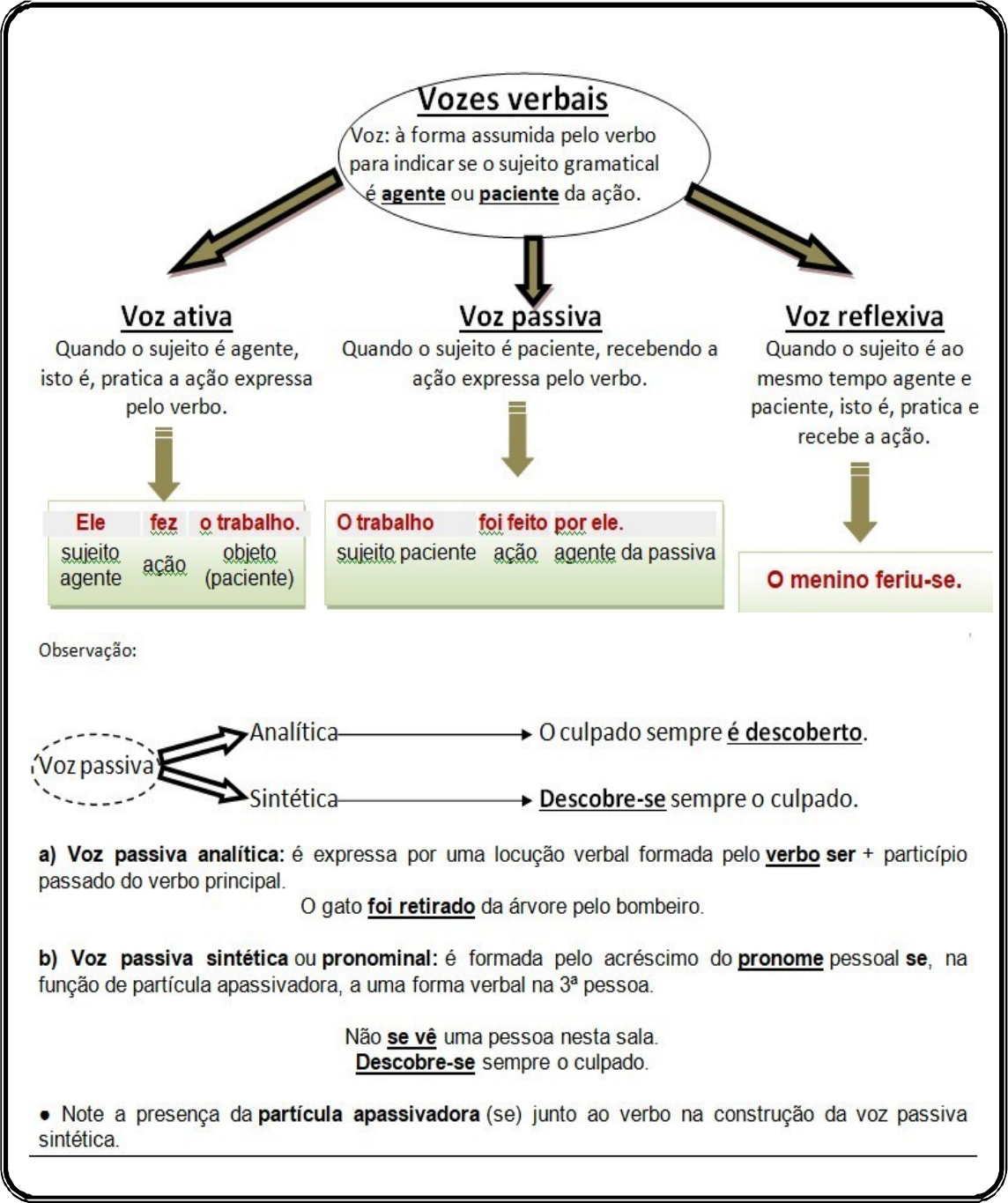 REVISÃO - VOZES VERBAIS Leia: Atividades Heroínas Livro faz releitura feminina de clássicos As escritoras Laura Conrado, Pam Gonçalves e Ray Tavares se uniram para recontar, sob o ponto de vista feminino e em versões contemporâneas, clássicos da literatura, no livro "Heroínas" (Ed. Record). No conto “Uma por todas e todas por uma”, Laura Conrado fala de uma jovem que une esforços com as amigas para defender uma Ong de proteção aos animais. Em “Távola redonda”, de Pam Gonçalves, uma aluna tenta salvar a festa de fim de ano da escola, depois que todo o dinheiro foi roubado. E a “Robin Hood” de Ray Tavares é uma hacker que desvia dinheiro de políticos corruptos para causas mais justas. Disponível em: . (Com cortes). Questão 1 – Identifique a oração em que o verbo está na voz ativa: ( ) “As escritoras Laura Conrado, Pam Gonçalves e Ray Tavares se uniram [...]” ( ) “No conto “Uma por todas e todas por uma”, Laura Conrado fala de uma jovem [...]” ( ) “[...] depois que todo o dinheiro foi roubado.” Questão 2 – Pode-se afirmar que a voz ativa ocorre quando: ( ) o sujeito é agente da ação indicada pelo verbo. ( ) o sujeito é paciente da ação indicada pelo verbo. ( ) o sujeito é agente e paciente da ação indicada pelo verbo. Questão 3 – No segmento “[...] que desvia dinheiro de políticos corruptos para causas mais justas.”, o verbo na voz ativa destacado tem como sujeito: ( ) “uma jovem” ( ) “uma aluna” ( ) “uma hacker” Questão 4 – Na frase “[...] tenta salvar a festa de fim de ano [...]”, o verbo ativo “tenta” exprime: ( ) uma ação ( ) um estado ( ) uma característica Questão 5 – Em “Livro faz releitura feminina de clássicos”, o verbo na voz ativa grifado é: ( ) intransitivo porque tem sentido completo. ( ) transitivo indireto porque precisa de complemento com preposição. ( ) transitivo direto porque precisa de complemento sem preposição. Questão 6 - Em que voz estão os verbos nas frases a seguir? a) No Natal, as crianças invadem as lojas dos shoppings. ATIVA b) A pequena praça era enfeitada por luzes coloridas. PASSIVA c) Diariamente chegava à cidade o velho trem de carga. ATIVA d) Eu me machuquei com um martelo. REFLEXIVA e) São divulgados , através da TV , os resultados da loteria. PASSIVA f) As lagartas destruíram o pomar. ATIVA g) A praia era iluminada por um lindo sol de setembro. PASSIVA h) O ser humano criou muitos rituais religiosos. ATIVA i) Os alunos se abraçaram. REFLEXIVA j) O lobo machucou a ovelha.ATIVA k) O juiz foi vaiado pela torcida. PASSIVA l) As ruas foram lavadas pela chuva. PASSIVA m) Os exercícios foram feitos por Carlos. PASSIVA n) Muitos animais foram domesticados pelo homem. PASSIVA o) Muitos animais fogem do contato com o homem. ATIVA p) A jovem se penteava diante do espelho. REFLEXIVA q) A cidade foi cercada pelo exército. PASSIVA r) O goleiro desviou a bola. ATIVA Questão 7-Passe as orações do exercício anterior da voz ativa para a voz passiva analítica e identifique o agente da passiva: a) No Natal, as crianças invadem as lojas dos shoppings. No natal, as lojas do shopping são invadidas pelas crianças b) Diariamente chegava à cidade o velho trem de carga. Não há como passar para a voz passiva, pois não tem objeto direto. c) As lagartas destruíram o pomar. O pomar foi destruido pelas as lagastas d) O ser humano criou muitos rituais religiosos. Muitos rituias religiosos foram criados pelo ser humano e) O lobo machucou a ovelha. A ovelha foi machuacada pelo lobo f) Muitos animais fogem do contato com o homem. Não há como passar para a voz passiva, pois não tem objeto direto g) O goleiro desviou a bola. A bola foi desviada pelo goleiro Questão 8- Passe as orações do exercício 1 da voz passiva para a voz ativa e identifique o objeto dire- to. a) A pequena praça era enfeitada por luzes coloridas. As luzes coloridas enfeitavam a pequena praça. b) São divulgados, através da TV, os resultados da loteria. A tv divulga os resultados da loteria. c) A praia era iluminada por um lindo sol de setembro. Um lindo sol de setembro iluminava a praia d) O juiz foi vaiado pela torcida. A torcida vaiava o juiz. e) As ruas foram lavadas pela chuva. A chuva lavou as ruas. f) Muitos animais foram domesticados pelo homem. O homem domesticou muitos animais. g) Os exercícios foram feitos por Carlos. Carlos fez os exercicios h) A cidade foi cercada pelo exército. O exército cercou a cidade. Questão 9-Transforme as orações em voz passiva sintética. Atenção à concordância. a) Babás são contratadas. Contratam-se babás b) Casa é alugada em condomínio. Aluga-se casas em condominio c) A festa foi comemorada. Comemorou-se a festa. d) Propostas foram estudadas. Estudaram-se as propostas e) Bicicletas são anunciadas a preços baixos. Anunciam-se bicicletas a preços baixos. Questão 10 - Transforme as orações abaixo em voz passiva analítica. a) Nintendo lidera guerra dos games. Guerra dos games é liderada por Nitendo. b) Cuba prepara reaparição de Fidel Castro. Reaparição de Fidel Castro é preparada por Cuba c) Empresas adotam a prática da ginástica laboral. A pratica da ginastica laboral é adotada por empresas d) Certidão digital reduziu a papelada. Papelada é reduzida por certidão digital e) O comitê estabeleceu a premiação. A premiação foi estabelecida pelo comitê Questão 11 Assinale (SI) para sujeito indeterminado (VR) para voz reflexiva ou (OS) para voz passiva sintética: a) (SI )Precisa-se de empregada. b) (SI ) Vive-se bem. c) (VR) Você se surpreendeu! d) (VR)O furacão se movia rapidamente. e) (OS) Aluga-se consultório. CONSULTORIO É ALUGADO f) (VR ) Eu me dividi. g) (VR) Você não precisa se descabelar. Questão 12 Leia as orações: · Os professores reavaliaram sua decisão. · Um novo horário foi proposto pelos professores. a) Identifique o sujeito das orações. O sujeito da primeira oração é “os pro