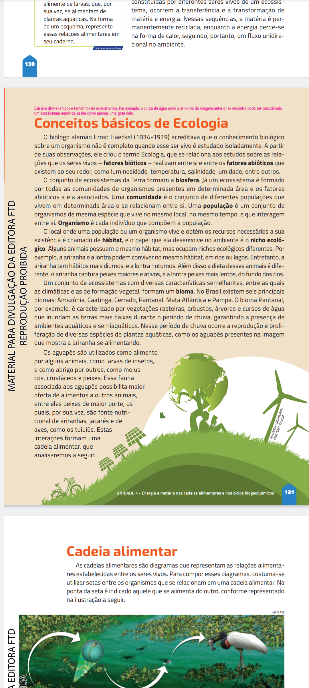 alimente de larvas, que, por constituidas por diferentes seres VIVOS de um ecossis- sua vez, se alimentam de tema, ocorrem a transferência e a transformação de plantas aquáticas. Na forma matéria e energia. Nessas sequências, a matéria é per- de um esquema, represente manentemente reciclada, enquanto a energia perde-se essas relações alimentares em na forma de calor, seguindo, portanto, um fluxo unidire- seu caderno. cional no 130 Existem diversos tipos e tamanhos de Por exemplo, o corpo de água onde a ariranha da imagem anterior se encontra pode ser considerado um ecossistema assim como apenas uma gota Conceitos básicos de Ecologia o biólogo alemão Ernst Haeckel (1834-1919) acreditava que o conhecimento biológico sobre um organismo não é completo quando esse ser vivo é isoladamente. A partir de suas observações, ele criou o termo Ecologia, que se relaciona aos estudos sobre as rela- ções que os seres vivos fatores bióticos realizam entre si e entre os fatores abióticos que existem ao seu redor, como luminosidade, temperatura, salinidade, umidade, entre outros. o conjunto de ecossistemas da Terra formam a biosfera. lá um ecossistema é formado por todas as comunidades de organismos presentes em determinada área e os fatores abióticos a ela associados. Uma comunidade é o conjunto de diferentes populações que vivem em determinada área e se relacionam entre si. Uma população é um conjunto de organismos de mesma espécie que vive no mesmo local, no mesmo tempo, e que interagem entre si. Organismo é cada indivíduo que compõem a população. local onde uma população ou um organismo vive e obtém os recursos necessários a sua existência é chamado de hábitat, e o papel que ela desenvolve no ambiente é o nicho ecoló- gico. Alguns animais possuem o mesmo hábitat mas ocupam nichos ecológicos diferentes. Por exemplo, a ariranha e a lontra podem conviver no mesmo hábitat, em rios ou lagos. Entretanto, a ariranha tem hábitos mais diurnos, e a lontra noturnos. Além disso a dieta desses animais é dife- rente. A ariranha captura peixes maiores e ativos, e a lontra peixes mais lentos, do fundo dos rios. Um conjunto de ecossistemas com diversas características semelhantes, entre as quais as climáticas e as de formação vegetal, formam um bioma. No Brasil existem seis principais biomas: Amazônia, Caatinga, Cerrado, Pantanal, Mata Atlântica e Pampa. o bioma Pantanal, por exemplo, é caracterizado por vegetações rasteiras, arbustos, árvores e cursos de água que inundam as terras mais baixas durante o período de chuva, garantindo a presença de ambientes aquáticos e semiaquáticos. Nesse período de chuva ocorre a reprodução e proli- PARA feração de diversas espécies de plantas aquáticas, como os aguapés presentes na imagem que mostra a ariranha se alimentando. Os aguapés são utilizados como alimento por alguns animais, como larvas de insetos, e como abrigo por outros, como molus- cos, crustáceos e peixes. Essa fauna associada aos aguapés possibilita maior oferta de alimentos a outros animais, entre eles peixes de maior porte, os quais, por sua vez, são fonte nutri- cional de ariranhas, jacarés e de aves, como os Estas interações formam uma cadeia alimentar, que analisaremos a seguir. UNIDADE 4 Energia e matéria nas cadeias alimentares e nos ciclos 131 Cadeia alimentar As cadeias alimentares são diagramas que representam as relações alimenta- res estabelecidas entre os seres vivos. Para compor esses diagramas, costuma-se utilizar setas entre os organismos que se relacionam em uma cadeia alimentar. Na ponta da seta é indicado aquele que se alimenta do outro, conforme representado na ilustração a seguir.