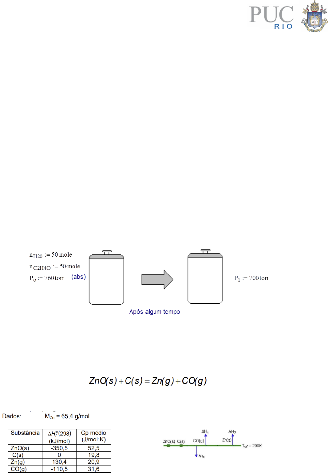 ENG1802 – INTRODUÇÃO À ENGENHARIA QUÍMICA Professor: Brunno Santos/ bsantos@puc-rio.br EXERCÍCIOS 1) Um gás mediu 300 cm3 a 27,5oC e por causa de uma variação de temperatura, com a pressão permanecendo constante, o volume diminuiu para 125 cm3. Qual foi a nova temperatura em oC? 2) Um tanque de aço com capacidade de três m contém hélio a 35oC e 205 kN/m2. Calcular a massa, em kg, do hélio. 3) Uma mistura gasosa consistindo de 50 % em mol de hidrogênio e 50 % em mol de acetaldeído (C2H4O) está inicialmente contida em um recipiente rígido a uma pressão total de 760 mmHg abs. A formação de etanol (C2H6O) ocorre de acordo com C2H4O + H2 = C2H6O Após um tempo notou-se que a pressão total no recipiente rígido caiu para 700 mmHg abs. Calcular o grau de conclusão da reação usando as seguintes suposições: Todos os reagente e produtos estão no estado gasoso. O recipiente e seu conteúdo estavam na mesma temperatura quando as duas pressões foram medidas. 4) Um litro de oxigênio a 760 mm é forçado para o interior de um recipiente contendo um litro de nitrogênio a 760 mm. Qual será a pressão resultante? Que suposições são necessárias para sua resposta? 5) Óxido de zinco e carbono, ambos a 25°C, são alimentados, em quantidades estequiométricas, em um reator operado a 1,0 atm, onde ocorre a seguinte reação: A reação é completa e os produtos saem do reator a 1,0 atm e 1000°C. Calcule o calor que é adicionado ou removido do reator, por quilograma de zinco. 6) A entalpia de reação padrão a 25 ºC para a combustão do n-nonano líquido formando dióxido de carbono e água é o Hrº =-6124kJ/mol, e para o n-nonano gasoso, nas mesmas condições, é o Hrº =-6171 kJ/mol. a) Qual o significado da diferença de 47 kJ/mol entre os valores de o Hrº ? b) Se 3 moles/s de n-nonano líquido são consumidos e o reagentes e produtos estão a 25 ºC, calcule a taxa de calor em kW. Indique se ele é retirado ou fornecido ao sistema. 7) Dióxido de enxofre é oxidado para trióxido enxofre em um reator. SO2 e 100% de ar em excesso são alimentados no reator a 450 ºC. A reação tem uma conversão de 100% de SO2 e os produtos saem do reator a uma temperatura de 550 ºC. A taxa de produção do SO3 é de 100 kg/h. O reator é resfriado com auxílio de uma camisa onde água é alimentada a 25ºC. Faça o balanço de energia e calcule a vazão de água de resfriamento, sabendo que a diferença de temperatura da água não pode ultrapassar 15ºC. 8) Um evaporador é alimentado com 5000 kg/h de uma solução de açúcar em água, a 15% em massa de açúcar e 50oC. A solução é concentrada até 60% em massa de açúcar, com o sistema operando a 90oC sem que ocorra cristalização. a) Faça um desenho esquemático do processo e b) Supondo que o vapor deixa o evaporador na forma de vapor saturado, determine a carga térmica de aquecimento da unidade, Q. Dados: (i) tabela de vapor d’água saturado, em anexo. (ii) calor específico das soluções de açúcar (constante): solução a 15% 3,4 kJ kg-1 oC-1 solução a 60% 2,5 kJ kg-1 oC-1 supor a entalpia de diluição do açúcar igual a zero. 9) Monóxido de carbono é queimado com excesso de ar a 1 atm. Os reagentes são alimentados a 25 oC e a temperatura adiabática de chama é 1500 oC. a) Calcule o excesso de ar. b) Se aumentarmos a porcentagem de excesso de ar, o que aconteceria com a temperatura adiabática de chama? Dados: 10) Descreva o papel da biomassa no contexto de biocombustíveis. ANEXO