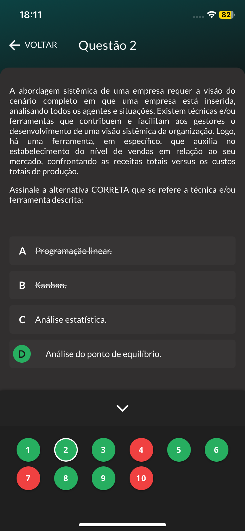 18:11 82 VOLTAR Questão 2 A abordagem sistêmica de uma empresa requer a visão do cenário completo em que uma empresa está inserida, analisando todos os agentes e situações. Existem técnicas e/ou ferramentas que contribuem e facilitam aos gestores desenvolvimento de uma visão sistêmica da organização. Logo, há uma ferramenta, em específico, que auxilia no estabelecimento do nível de vendas em relação ao seu mercado, confrontando as receitas totais versus os custos totais de produção. Assinale a alternativa CORRETA que se refere a técnica e/ou ferramenta descrita: A Programação linear. Kanban. Análise estatística. D Análise do ponto de equilíbrio. 1 2 3 4 5 6 7 8 9 10