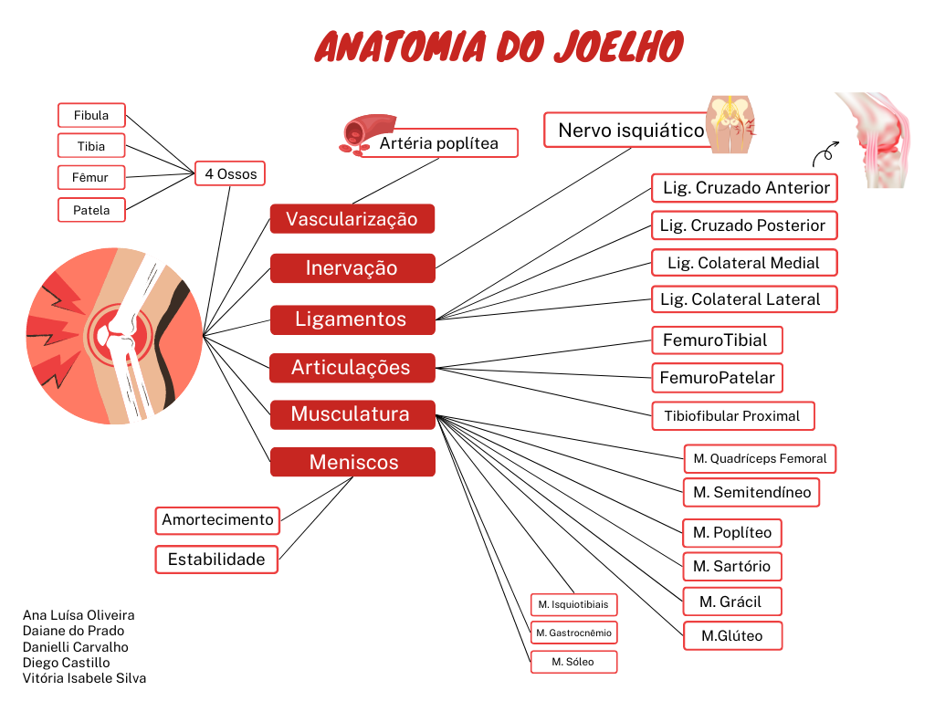 ANATOMIA DO JOELHO Fibula Nervo isquiático Tibia Artéria poplítea Fêmur 4 Ossos Lig. Cruzado Anterior Patela Vascularização Lig. Cruzado Posterior Inervação Lig. Colateral Medial Lig. Colateral Lateral Ligamentos FemuroTibial Articulações FemuroPatelar Musculatura Tibiofibular Proximal Meniscos M. Quadríceps Femoral M. Semitendíneo Amortecimento M. Poplíteo Estabilidade M. Sartório M. Isquiotibiais M. Grácil Ana Oliveira Daiane do Prado M. M.Glúteo Danielli Carvalho Diego Castillo M. Sóleo Vitória Isabele Silva