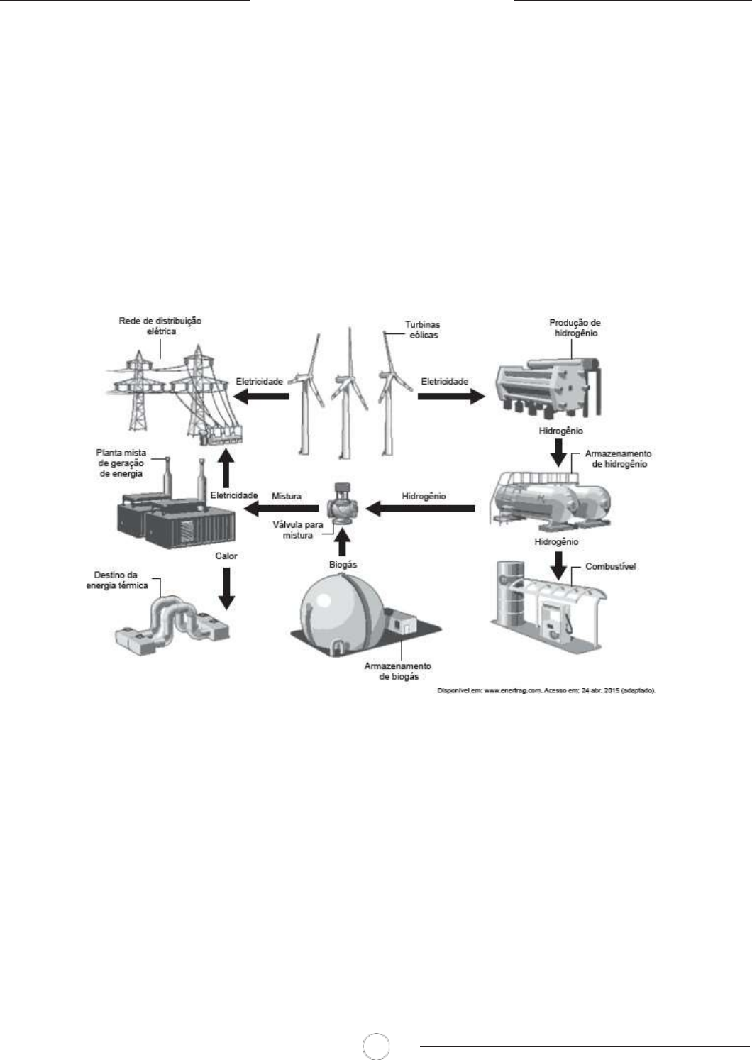 FÍSICA 3 O lado direito (depois de h = 0), temos a seguinte conservação de energia: E mecânica = E cinética + E potencial gravitacional E cinética = E mecânica – mgh Olhando para essa equação, podemos entender que, com o aumento do valor da altura (h), teremos uma diminuição do valor da energia cinética de forma linear. O lado esquerdo (antes de h = 0), temos a seguinte conservação de energia: E mecânica = E cinética + E potencial gravitacional + E potencial elástica Ecinética = Emecânica – mgh – kh²/2 (com x = h) Olhando para essa equação, podemos entender que, como temos uma equação do 2° com o valor de negativo do coeficiente angular, teremos uma parábola de concavidade para baixo. Conversão de energia potencial elástica em energia cinética. Obs.: Velocidade não é máxima em h=0, mas no equilíbrio dinâmico quando Fel = P 3. (ENEM – 2017) A figura mostra o funcionamento de uma estação híbrida de geração de eletricidade movida a energia eólica e bio- gás. Essa estação possibilita que a energia gerada no parque eólico seja armazenada na forma de gás hidrogênio, usado no fornecimento de energia para a rede elétrica comum e para abastecer células a combustível. Disponível em: . Acesso em: 24 abr. 2015 (adaptado). Mesmo com a ausência de ventos por curtos períodos, essa estação continua abastecendo a cidade onde está instalada, pois o(a) a) planta mista de geração de energia realiza eletrólise para enviar energia à rede de distribuição elétrica. b) hidrogênio produzido e armazenado é utilizado na combustão com o biogás para gerar calor e eletricidade. c) conjunto de turbinas continua girando com a mesma velocidade, por inércia, mantendo a eficiência anterior. d) combustão da mistura biogás-hidrogênio gera diretamente energia elétrica adicional para a manutenção da estação. e) planta mista de geração de energia é capaz de utilizar todo o calor fornecido na combustão para a geração de eletricidade. Resposta: Letra B. Por ser uma planta híbrida, ela poderá utilizar outras fontes de energia além do vento. Neste caso, usará o hidrogê- nio como combustível nas células de combustível. A combustão do hidrogênio é superenergética. Basta lembrar que ele é combustível de foguetes, neste caso é usado o hidrogênio líquido junto com o oxigênio líquido. Na questão se utilizaria a combustão dos combustíveis hi- drogênio gasoso + metano (biogás) com oxidante O2 do ar atmosférico. Na combustão com o ar atmosférico, um pouquinho de hidrogênio produz um volume muito maior do que o comparado ao produzido na combustão da gasolina, além de produzir maior entalpia. A produção de hidrogênio é interrompida na ausência de vento. Mas como já havia uma quantidade armazenada, ela será utilizada na combustão para gerar eletricidade. http://www.enertrag.com/ http://www.enertrag.com/
