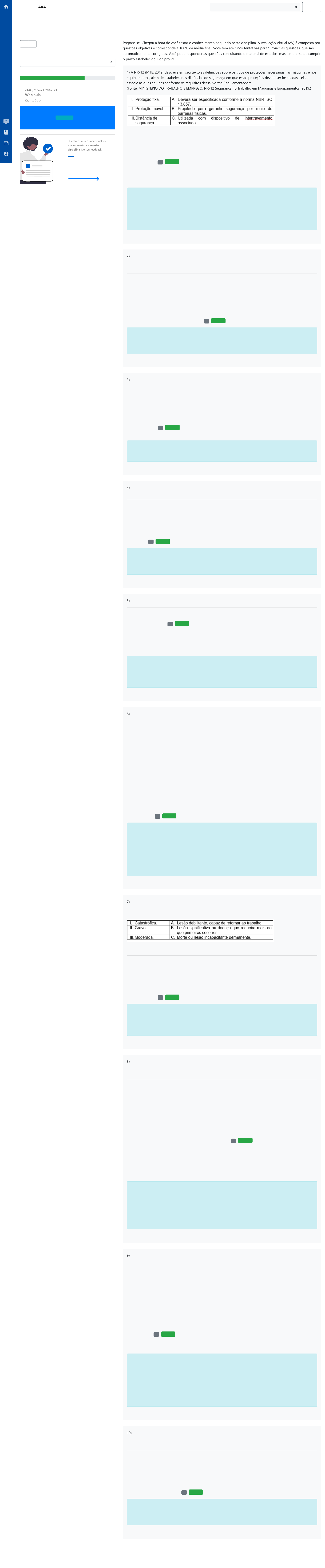 Cosmos • AVA Engenharia de Segurança do Trabalho Prevenção e controle de riscos em máquinas, equipamentos e instalações I Professor(a): Joubert Rodrigues Dos Santos Júnior (Mestrado acadêmico) Alterar Disciplina Prevenção e controle de riscos em máquinas, equipam Progresso da Disciplina 67.9% Queremos muito saber qual foi sua impressão sobre esta disciplina. Dê seu feedback! Pesquisa de opinião 24/09/2024 a 17/10/2024 Web aula Conteúdo 1) 2) 3) 4) 5) 6) 7) 8) 9) 10) Prepare-se! Chegou a hora de você testar o conhecimento adquirido nesta disciplina. A Avaliação Virtual (AV) é composta por questões objetivas e corresponde a 100% da média final. Você tem até cinco tentativas para “Enviar” as questões, que são automaticamente corrigidas. Você pode responder as questões consultando o material de estudos, mas lembre-se de cumprir o prazo estabelecido. Boa prova! A NR-12 (MTE, 2019) descreve em seu texto as definições sobre os tipos de proteções necessárias nas máquinas e nos equipamentos, além de estabelecer as distâncias de segurança em que essas proteções devem ser instaladas. Leia e associe as duas colunas conforme os requisitos dessa Norma Regulamentadora. (Fonte: MINISTÉRIO DO TRABALHO E EMPREGO. NR-12 Segurança no Trabalho em Máquinas e Equipamentos. 2019.) Assinale a alternativa que traz a associação correta entre as duas colunas: Alternativas: I – A; II – C; III – B. I – B; II – C; III – A. CORRETO I – C; II – A; III – B. I – C; II – B; III – A. I – B; II – A; III – C Código da questão: 65967 O método HRN correlaciona vários parâmetros para determinar a classificação de risco de uma máquina ou equipamento. Sua aplicação é de fácil compreensão visto a quantidade reduzida de índices que devem ser avaliados. Qual das alternativas está correta, referente ao método HRN? Alternativas: Utilizado exclusivamente para máquinas do tipo prensa ou similares. Considerado um método exclusivamente qualitativo. Seus índices podem ser alterados sem nenhum critério, desde que autorizado por um engenheiro de segurança. Criado pela Associação Brasileira de Normas Técnicas em 2018. Método pode ser aplicado em todos os tipos de máquinas e equipamentos, não tendo nenhuma restrição de uso quanto ao processo operacional das máquinas CORRETO Código da questão: 65992 Para determinar a categoria de segurança de uma máquina ou um equipamento, qual ferramenta é utilizada para facilitar o processo? Alternativas: Programa 5 S. Árvore de risco. Gráfico de Pareto. Matriz de seleção. CORRETO Análise preliminar de risco – APR. Código da questão: 65978 A categoria de segurança C, conforme a ABNT NBR ISO 13.849-1, equivale a qual categoria de segurança pela ABNT NBR 14.153? Alternativas: Categoria 4. Categoria 1. Categoria 3. Categoria B. Categoria 2. CORRETO Código da questão: 65984 Para determinar o valor do índice NR, é utilizada a seguinte expressão: Alternativas: NR = GS x FE x PO x NP. CORRETO NR = GS x FE x PO. NR = GS x FE x PO x 2. NR = GS x PO X NP. NR = FE x PO X NP. Código da questão: 65993 Sobre os passos para cumprimento da NR-12 visando garantir a segurança jurídica da empresa: I. De acordo com ABNT ISO/TR 14.121-2:2018 (ABNT, 2018), a matriz de risco é determinada por meio de uma tabela multidimensional, que associa o dano com a probabilidade de ocorrência. II. O método HRN (Hazard Rating Number) foi desenvolvido para determinar o grau de risco de uma máquina em função dos índices: GS, NP, PO e FE. III. Podemos traduzir HRN como "número de avaliação de perigo", em que, para cada item, é determinado um valor numérico em função de parâmetros preestabelecidos. IV. Na matriz de risco, o resultado da análise é dado pelo produto do grau de lesão, frequência de exposição, probabilidade de ocorrência e pelo número de pessoas expostas ao risco. V. O índice GPL ou GS é utilizado para determinar a frequência com que uma pessoa está exposta ao risco. São verdadeiras: Alternativas: I, II e V, apenas. I, II e IV, apenas. II, III e V, apenas. II, III e IV, apenas. I, II e III, apenas. CORRETO Código da questão: 65991 A matriz de risco é uma tabela multidimensional que, por meio da combinação dos parâmetros da gravidade do dano em função da probabilidade de ocorrência deste dano, resulta na classificação do risco. Leia e associe as duas colunas, referentes à gravidade dos danos abrangidos pelo método matriz de risco. Assinale a alternativa que traz a associação correta entre as duas colunas: Alternativas: I – C; II – B; III – A. I – B; II – C; III – A. I – A; II – C; III – B. I – A; II – B; III – C. I – C; II – A; III – B. CORRETO Código da questão: 65990 Para a instalação da cortina de luz e dos ___________, existe a necessidade de elaboração do cálculo de ________ de segurança para determinar a localização adequada desses dispositivos. A instalação de uma cortina de luz deve obedecer aos requisitos da norma _______: Alternativas: Tapetes de segurança; impedância; ABNT NBR ISO 13.855:2013. (ABNT. Associação Brasileira de Normas Técnicas. NBR ISO 13857:2013. Segurança de máquinas — Posicionamento dos equipamentos de proteção com referência à aproximação de partes do corpo humano. Rio de Janeiro, 2013). Dispositivos de segurança; distância; ABNT NBR ISO 13.855:2013. (ABNT. Associação Brasileira de Normas Técnicas. NBR ISO 13857:2013. Segurança de máquinas — Posicionamento dos equipamentos de proteção com referência à aproximação de partes do corpo humano. Rio de Janeiro, 2013). Tapetes de segurança; distância; ABNT NBR ISO 13.855:2013. (ABNT. Associação Brasileira de Normas Técnicas. NBR ISO 13857:2013. Segurança de máquinas — Posicionamento dos equipamentos de proteção com referência à aproximação de partes do corpo humano. Rio de Janeiro, 2013) CORRETO Dispositivo