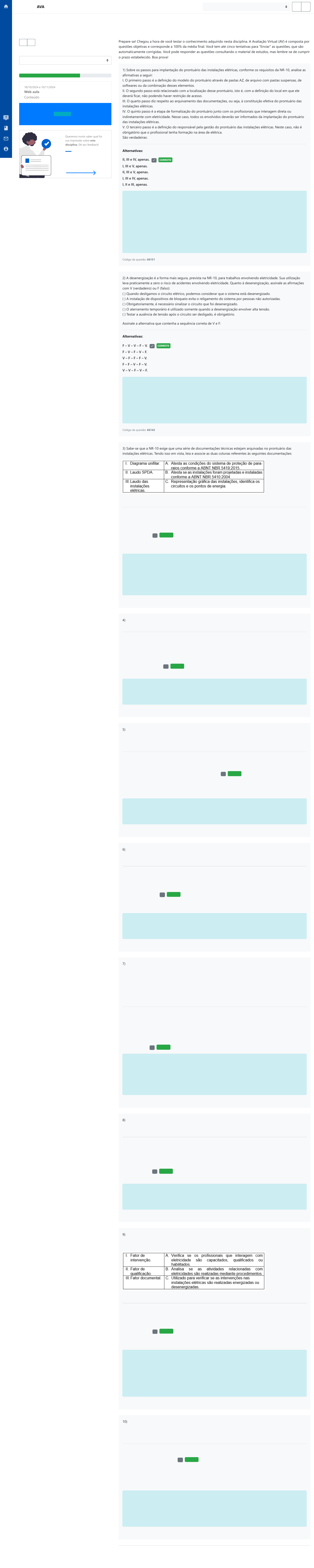 Cosmos • AVA Engenharia de Segurança do Trabalho Prevenção e controle de riscos em máquinas, equipamentos e instalações II Professor(a): Joubert Rodrigues Dos Santos Júnior (Mestrado acadêmico) Alterar Disciplina Prevenção e controle de riscos em máquinas, equipam Progresso da Disciplina 65.9% Queremos muito saber qual foi sua impressão sobre esta disciplina. Dê seu feedback! Pesquisa de opinião 18/10/2024 a 10/11/2024 Web aula Conteúdo 1) 2) 3) 4) 5) 6) 7) 8) 9) 10) Prepare-se! Chegou a hora de você testar o conhecimento adquirido nesta disciplina. A Avaliação Virtual (AV) é composta por questões objetivas e corresponde a 100% da média final. Você tem até cinco tentativas para “Enviar” as questões, que são automaticamente corrigidas. Você pode responder as questões consultando o material de estudos, mas lembre-se de cumprir o prazo estabelecido. Boa prova! Sobre os passos para implantação do prontuário das instalações elétricas, conforme os requisitos da NR-10, analise as afirmativas a seguir: I. O primeiro passo é a definição do modelo do prontuário através de pastas AZ, de arquivo com pastas suspensas, de softwares ou da combinação desses elementos. II. O segundo passo está relacionado com a localização desse prontuário, isto é, com a definição do local em que ele deverá ficar, não podendo haver restrição de acesso. III. O quarto passo diz respeito ao arquivamento das documentações, ou seja, à constituição efetiva do prontuário das instalações elétricas. IV. O quinto passo é a etapa de formalização do prontuário junto com os profissionais que interagem direta ou indiretamente com eletricidade. Nesse caso, todos os envolvidos deverão ser informados da implantação do prontuário das instalações elétricas. V. O terceiro passo é a definição do responsável pela gestão do prontuário das instalações elétricas. Neste caso, não é obrigatório que o profissional tenha formação na área de elétrica. São verdadeiras: Alternativas: II, III e IV, apenas. CORRETO I, III e V, apenas. II, III e V, apenas. I, III e IV, apenas. I, II e III, apenas. Código da questão: 66151 A desenergização é a forma mais segura, prevista na NR-10, para trabalhos envolvendo eletricidade. Sua utilização leva praticamente a zero o risco de acidentes envolvendo eletricidade. Quanto à desenergização, assinale as afirmações com V (verdadeiro) ou F (falso): ( ) Quando desligamos o circuito elétrico, podemos considerar que o sistema está desenergizado. ( ) A instalação de dispositivos de bloqueio evita o religamento do sistema por pessoas não autorizadas. ( ) Obrigatoriamente, é necessário sinalizar o circuito que foi desenergizado. ( ) O aterramento temporário é utilizado somente quando a desenergização envolver alta tensão. ( ) Testar a ausência de tensão após o circuito ser desligado, é obrigatório. Assinale a alternativa que contenha a sequência correta de V e F: Alternativas: F – V – V – F – V. CORRETO F – V – F – V – F. V – F – F – F – V. F – F – V – F – V. V – V – F – V – F. Código da questão: 66142 Sabe-se que a NR-10 exige que uma série de documentações técnicas estejam arquivadas no prontuário das instalações elétricas. Tendo isso em vista, leia e associe as duas colunas referentes às seguintes documentações: Assinale a alternativa que traz a associação correta entre as duas colunas: Alternativas: I – A; II – B; III – C. I – A; II – C; III – B. I – C; II – A; III – B. CORRETO I – C; II – B; III – A. I – B; II – A; III – C. Código da questão: 66150 Os procedimentos técnicos exigidos pela NR-10 contribuem de forma substancial para prevenção de acidentes relacionados à eletricidade desde que elaborados corretamente. Esses procedimentos são considerados como: Alternativas: Medidas para liberação de serviços. Medidas de proteção coletiva. Medidas de proteção individual. Medidas administrativas. CORRETO Ferramentas produtivas para medição . Código da questão: 66145 De acordo com a NR-16, atividades exercidas com as instalações desenergizadas não fazem jus ao adicional de periculosidade. Sabendo que desligar um circuito não garante a desenergização, qual das etapas a seguir não se refere ao procedimento de desenergização? Fonte: BRASIL. Ministério do Trabalho e Emprego. NR-16 – Atividades e operações perigosas. Brasília: MTE, 2019. Alternativas: Instalar o aterramento elétrico provisório. Fazer uma avaliação termográfica antes de desligar o circuito. CORRETO Testar a ausência de tensão assim que o circuito for desligado. Identificar e desligar o circuito que sofrerá a intervenção. Instalar dispositivos de bloqueio no circuito desligado. Código da questão: 66159 As atividades exercidas com extrabaixa tensão não fazem jus ao adicional de periculosidade de acordo com a NR-16. Qual o nível de tensão nominal para caracterizar trabalhos em extrabaixa tensão? Fonte: BRASIL. Ministério do Trabalho e Emprego. NR-16 – Atividades e operações perigosas. Brasília: MTE, 2019. Alternativas: Tensão entre 20 e 100 V. Tensão abaixo de 10 V. Tensão abaixo de 50 V. CORRETO Tensão entre 10 e 30 V. Tensão entre 127 e 220 V. Código da questão: 66160 A NR-10 exige que haja um profissional responsável pelo prontuário das instalações. Quanto a esse profissional, assinale as afirmações com V (verdadeiro) ou F (falso): ( ) Obrigatoriamente deverá apresentar formação na área de elétrica. ( ) Deve ser designado formalmente pela empresa. ( ) É responsável por manter o prontuário sempre atualizado. ( ) Todas as documentações do prontuário devem ser elaboradas por ele. ( ) O engenheiro de segurança do trabalho pode ocupar este cargo. Assinale a alternativa que contenha a sequência correta de V e F: Alternativas: V – F – F – F – V. F – F – V – F – V. F – V 