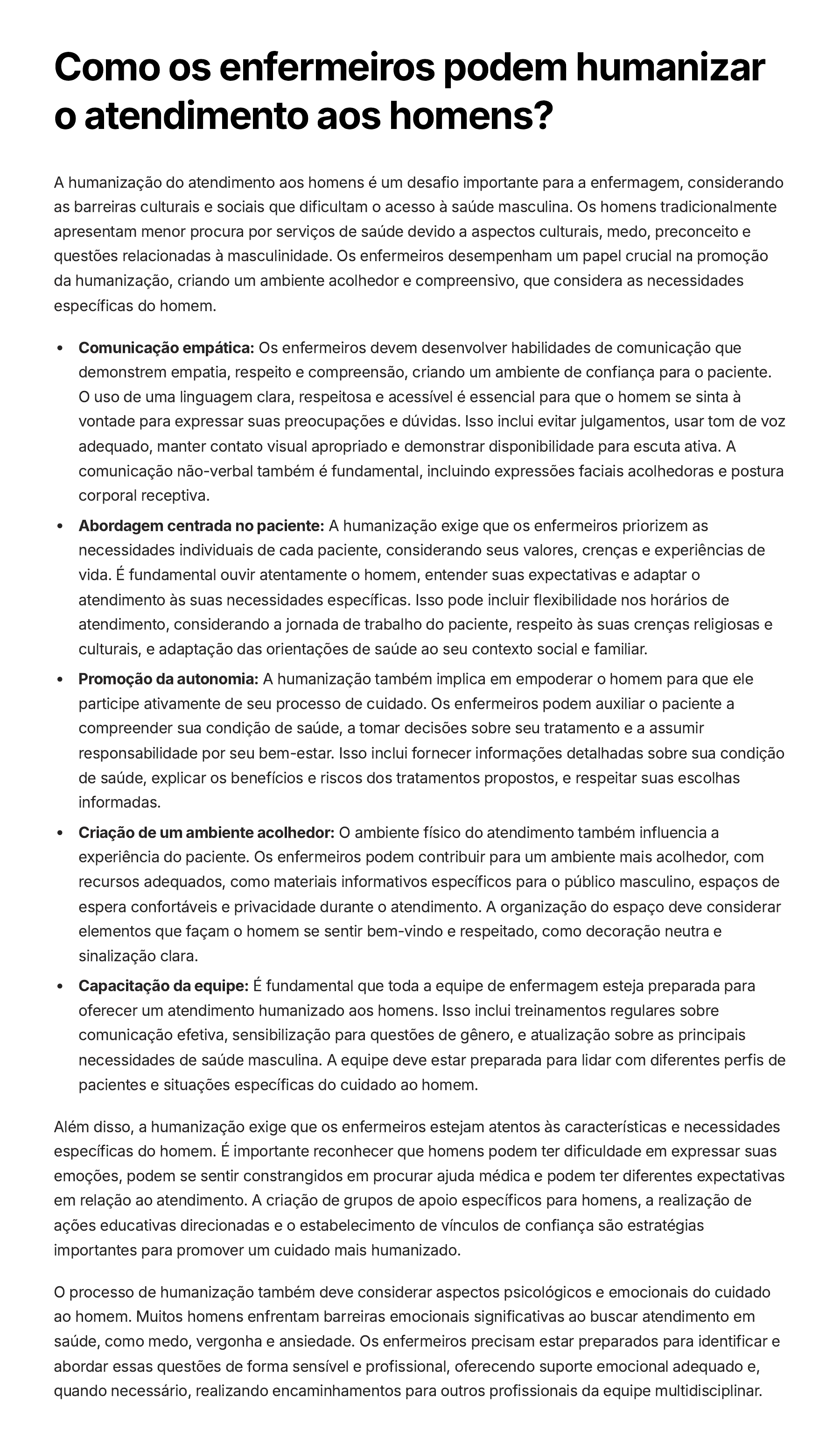 Como os enfermeiros podem humanizar o atendimento aos homens? A humanização do atendimento aos homens é um desafio importante para a enfermagem, considerando as barreiras culturais e sociais que dificultam o acesso à saúde masculina. Os homens tradicionalmente apresentam menor procura por serviços de saúde devido a aspectos culturais, medo, preconceito e questões relacionadas à masculinidade. Os enfermeiros desempenham um papel crucial na promoção da humanização, criando um ambiente acolhedor e compreensivo, que considera as necessidades específicas do homem. Comunicação empática: Os enfermeiros devem desenvolver habilidades de comunicação que demonstrem empatia, respeito e compreensão, criando um ambiente de confiança para o paciente. O uso de uma linguagem clara, respeitosa e acessível é essencial para que o homem se sinta à vontade para expressar suas preocupações e dúvidas. Isso inclui evitar julgamentos, usar tom de voz adequado, manter contato visual apropriado e demonstrar disponibilidade para escuta ativa. A comunicação não-verbal também é fundamental, incluindo expressões faciais acolhedoras e postura corporal receptiva. Abordagem centrada no paciente: A humanização exige que os enfermeiros priorizem as necessidades individuais de cada paciente, considerando seus valores, crenças e experiências de vida. É fundamental ouvir atentamente o homem, entender suas expectativas e adaptar o atendimento às suas necessidades específicas. Isso pode incluir flexibilidade nos horários de atendimento, considerando a jornada de trabalho do paciente, respeito às suas crenças religiosas e culturais, e adaptação das orientações de saúde ao seu contexto social e familiar. Promoção da autonomia: A humanização também implica em empoderar o homem para que ele participe ativamente de seu processo de cuidado. Os enfermeiros podem auxiliar o paciente a compreender sua condição de saúde, a tomar decisões sobre seu tratamento e a assumir responsabilidade por seu bem-estar. Isso inclui fornecer informações detalhadas sobre sua condição de saúde, explicar os benefícios e riscos dos tratamentos propostos, e respeitar suas escolhas informadas. Criação de um ambiente acolhedor: O ambiente físico do atendimento também influencia a experiência do paciente. Os enfermeiros podem contribuir para um ambiente mais acolhedor, com recursos adequados, como materiais informativos específicos para o público masculino, espaços de espera confortáveis e privacidade durante o atendimento. A organização do espaço deve considerar elementos que façam o homem se sentir bem-vindo e respeitado, como decoração neutra e sinalização clara. Capacitação da equipe: É fundamental que toda a equipe de enfermagem esteja preparada para oferecer um atendimento humanizado aos homens. Isso inclui treinamentos regulares sobre comunicação efetiva, sensibilização para questões de gênero, e atualização sobre as principais necessidades de saúde masculina. A equipe deve estar preparada para lidar com diferentes perfis de pacientes e situações específicas do cuidado ao homem. Além disso, a humanização exige que os enfermeiros estejam atentos às características e necessidades específicas do homem. É importante reconhecer que homens podem ter dificuldade em expressar suas emoções, podem se sentir constrangidos em procurar ajuda médica e podem ter diferentes expectativas em relação ao atendimento. A criação de grupos de apoio específicos para homens, a realização de ações educativas direcionadas e o estabelecimento de vínculos de confiança são estratégias importantes para promover um cuidado mais humanizado. O processo de humanização também deve considerar aspectos psicológicos e emocionais do cuidado ao homem. Muitos homens enfrentam barreiras emocionais significativas ao buscar atendimento em saúde, como medo, vergonha e ansiedade. Os enfermeiros precisam estar preparados para identificar e abordar essas questões de forma sensível e profissional, oferecendo suporte emocional adequado e, quando necessário, realizando encaminhamentos para outros profissionais da equipe multidisciplinar.