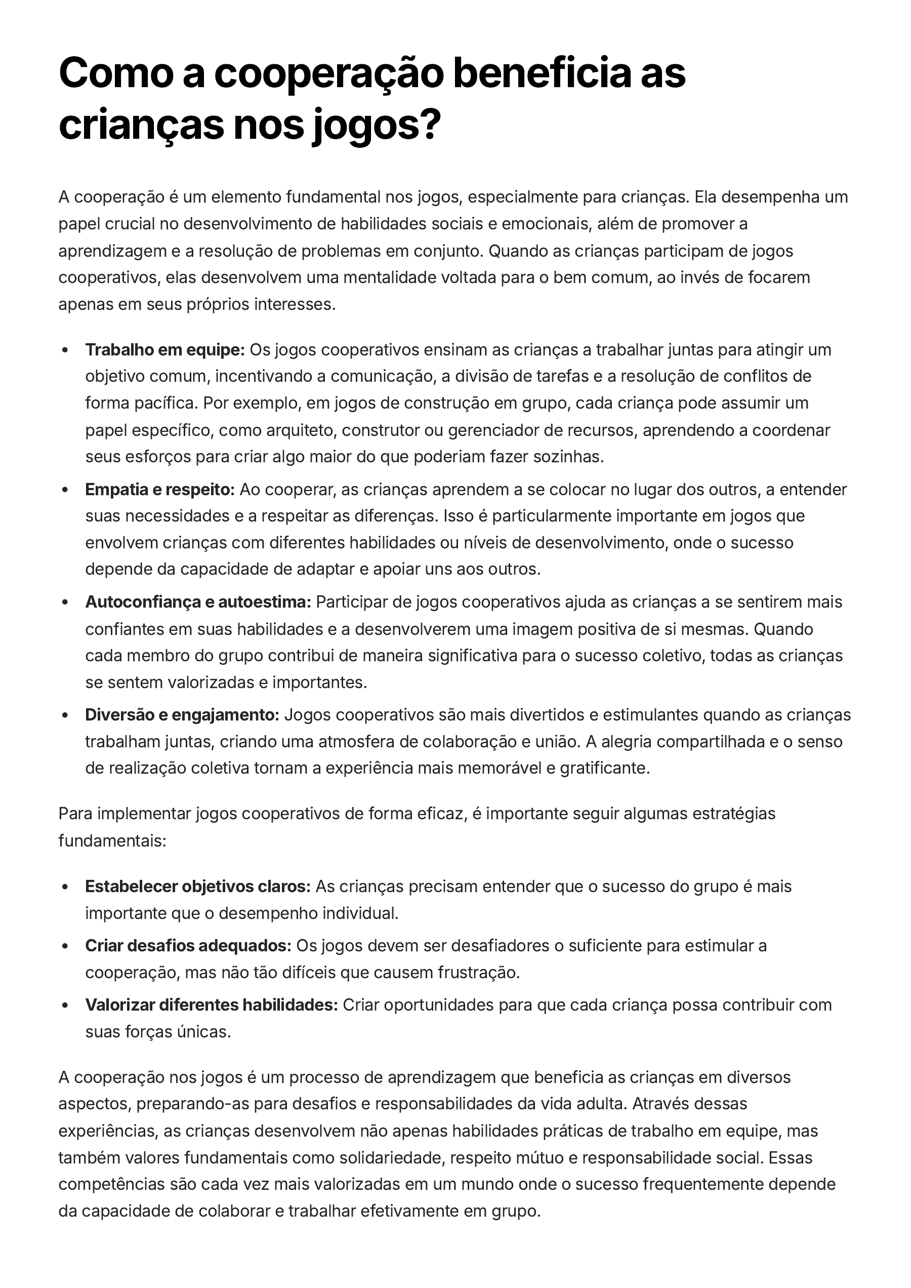 Como a cooperação beneficia as crianças nos jogos? A cooperação é um elemento fundamental nos jogos, especialmente para crianças. Ela desempenha um papel crucial no desenvolvimento de habilidades sociais e emocionais, além de promover a aprendizagem e a resolução de problemas em conjunto. Quando as crianças participam de jogos cooperativos, elas desenvolvem uma mentalidade voltada para o bem comum, ao invés de focarem apenas em seus próprios interesses. Trabalho em equipe: Os jogos cooperativos ensinam as crianças a trabalhar juntas para atingir um objetivo comum, incentivando a comunicação, a divisão de tarefas e a resolução de conflitos de forma pacífica. Por exemplo, em jogos de construção em grupo, cada criança pode assumir um papel específico, como arquiteto, construtor ou gerenciador de recursos, aprendendo a coordenar seus esforços para criar algo maior do que poderiam fazer sozinhas. Empatia e respeito: Ao cooperar, as crianças aprendem a se colocar no lugar dos outros, a entender suas necessidades e a respeitar as diferenças. Isso é particularmente importante em jogos que envolvem crianças com diferentes habilidades ou níveis de desenvolvimento, onde o sucesso depende da capacidade de adaptar e apoiar uns aos outros. Autoconfiança e autoestima: Participar de jogos cooperativos ajuda as crianças a se sentirem mais confiantes em suas habilidades e a desenvolverem uma imagem positiva de si mesmas. Quando cada membro do grupo contribui de maneira significativa para o sucesso coletivo, todas as crianças se sentem valorizadas e importantes. Diversão e engajamento: Jogos cooperativos são mais divertidos e estimulantes quando as crianças trabalham juntas, criando uma atmosfera de colaboração e união. A alegria compartilhada e o senso de realização coletiva tornam a experiência mais memorável e gratificante. Para implementar jogos cooperativos de forma eficaz, é importante seguir algumas estratégias fundamentais: Estabelecer objetivos claros: As crianças precisam entender que o sucesso do grupo é mais importante que o desempenho individual. Criar desafios adequados: Os jogos devem ser desafiadores o suficiente para estimular a cooperação, mas não tão difíceis que causem frustração. Valorizar diferentes habilidades: Criar oportunidades para que cada criança possa contribuir com suas forças únicas. A cooperação nos jogos é um processo de aprendizagem que beneficia as crianças em diversos aspectos, preparando-as para desafios e responsabilidades da vida adulta. Através dessas experiências, as crianças desenvolvem não apenas habilidades práticas de trabalho em equipe, mas também valores fundamentais como solidariedade, respeito mútuo e responsabilidade social. Essas competências são cada vez mais valorizadas em um mundo onde o sucesso frequentemente depende da capacidade de colaborar e trabalhar efetivamente em grupo.