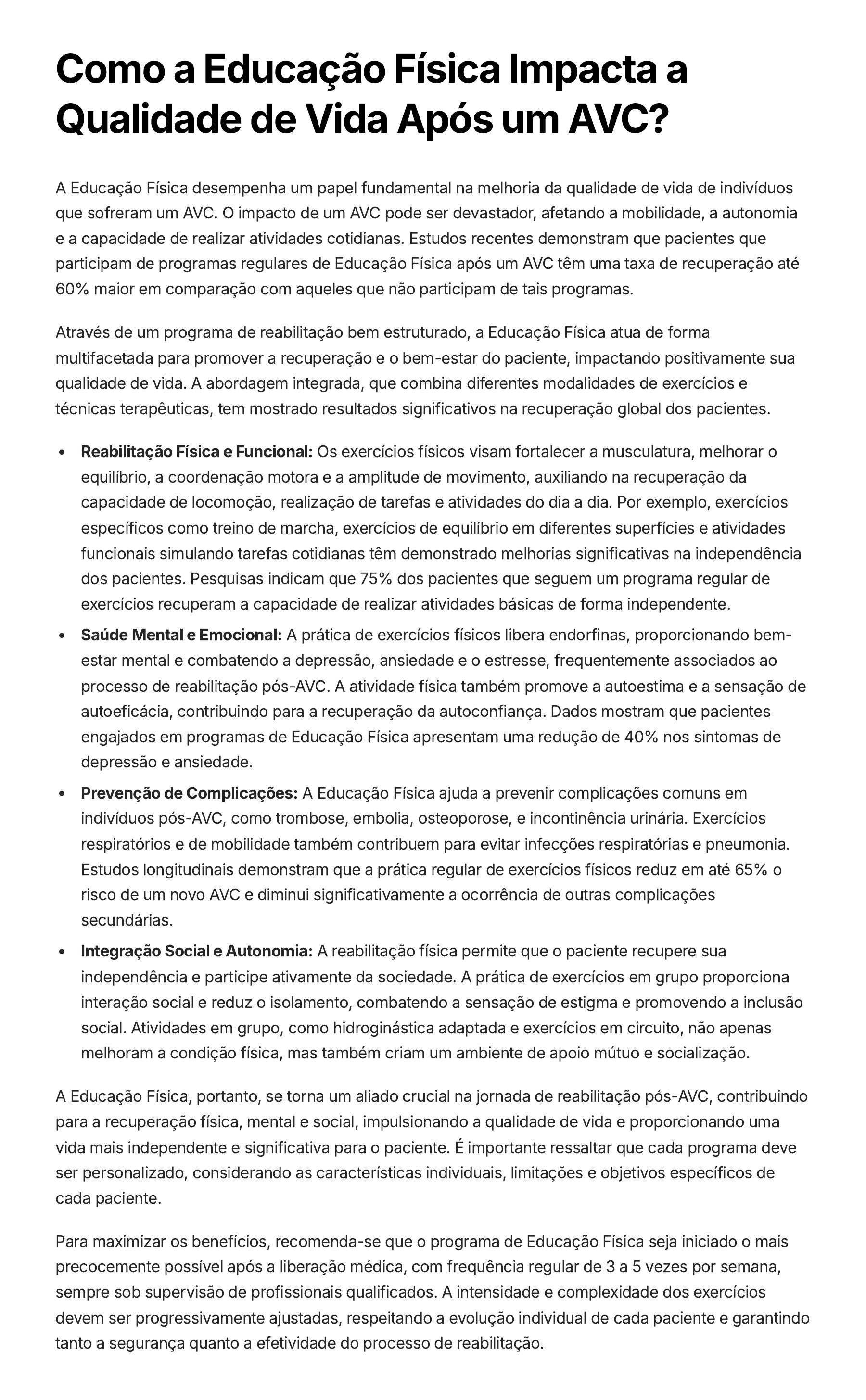 Como a Educação Física Impacta a Qualidade de Vida Após um AVC? A Educação Física desempenha um papel fundamental na melhoria da qualidade de vida de indivíduos que sofreram um AVC. O impacto de um AVC pode ser devastador, afetando a mobilidade, a autonomia e a capacidade de realizar atividades cotidianas. Estudos recentes demonstram que pacientes que participam de programas regulares de Educação Física após um AVC têm uma taxa de recuperação até 60% maior em comparação com aqueles que não participam de tais programas. Através de um programa de reabilitação bem estruturado, a Educação Física atua de forma multifacetada para promover a recuperação e o bem-estar do paciente, impactando positivamente sua qualidade de vida. A abordagem integrada, que combina diferentes modalidades de exercícios e técnicas terapêuticas, tem mostrado resultados significativos na recuperação global dos pacientes. Reabilitação Física e Funcional: Os exercícios físicos visam fortalecer a musculatura, melhorar o equilíbrio, a coordenação motora e a amplitude de movimento, auxiliando na recuperação da capacidade de locomoção, realização de tarefas e atividades do dia a dia. Por exemplo, exercícios específicos como treino de marcha, exercícios de equilíbrio em diferentes superfícies e atividades funcionais simulando tarefas cotidianas têm demonstrado melhorias significativas na independência dos pacientes. Pesquisas indicam que 75% dos pacientes que seguem um programa regular de exercícios recuperam a capacidade de realizar atividades básicas de forma independente. Saúde Mental e Emocional: A prática de exercícios físicos libera endorfinas, proporcionando bem- estar mental e combatendo a depressão, ansiedade e o estresse, frequentemente associados ao processo de reabilitação pós-AVC. A atividade física também promove a autoestima e a sensação de autoeficácia, contribuindo para a recuperação da autoconfiança. Dados mostram que pacientes engajados em programas de Educação Física apresentam uma redução de 40% nos sintomas de depressão e ansiedade. Prevenção de Complicações: A Educação Física ajuda a prevenir complicações comuns em indivíduos pós-AVC, como trombose, embolia, osteoporose, e incontinência urinária. Exercícios respiratórios e de mobilidade também contribuem para evitar infecções respiratórias e pneumonia. Estudos longitudinais demonstram que a prática regular de exercícios físicos reduz em até 65% o risco de um novo AVC e diminui significativamente a ocorrência de outras complicações secundárias. Integração Social e Autonomia: A reabilitação física permite que o paciente recupere sua independência e participe ativamente da sociedade. A prática de exercícios em grupo proporciona interação social e reduz o isolamento, combatendo a sensação de estigma e promovendo a inclusão social. Atividades em grupo, como hidroginástica adaptada e exercícios em circuito, não apenas melhoram a condição física, mas também criam um ambiente de apoio mútuo e socialização. A Educação Física, portanto, se torna um aliado crucial na jornada de reabilitação pós-AVC, contribuindo para a recuperação física, mental e social, impulsionando a qualidade de vida e proporcionando uma vida mais independente e significativa para o paciente. É importante ressaltar que cada programa deve ser personalizado, considerando as características individuais, limitações e objetivos específicos de cada paciente. Para maximizar os benefícios, recomenda-se que o programa de Educação Física seja iniciado o mais precocemente possível após a liberação médica, com frequência regular de 3 a 5 vezes por semana, sempre sob supervisão de profissionais qualificados. A intensidade e complexidade dos exercícios devem ser progressivamente ajustadas, respeitando a evolução individual de cada paciente e garantindo tanto a segurança quanto a efetividade do processo de reabilitação.
