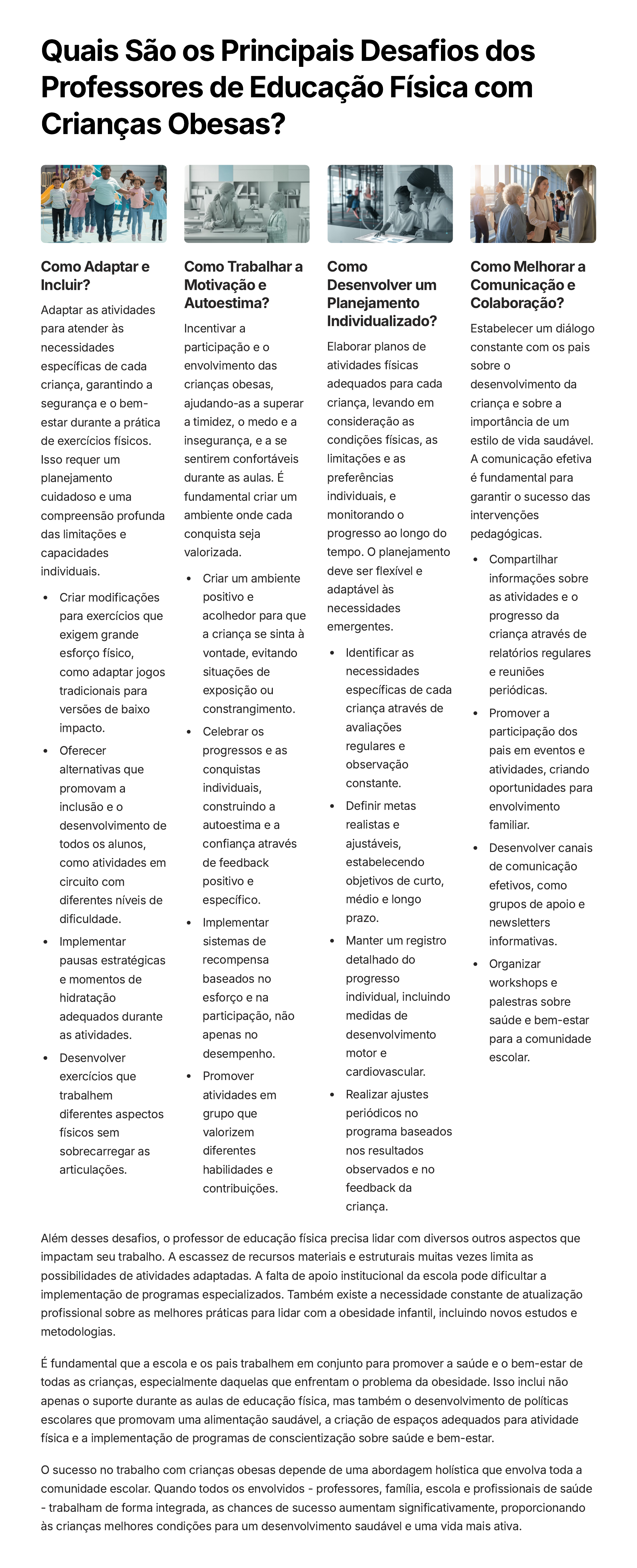 Quais São os Principais Desafios dos Professores de Educação Física com Crianças Obesas? Como Adaptar e Incluir? Adaptar as atividades para atender às necessidades específicas de cada criança, garantindo a segurança e o bem- estar durante a prática de exercícios físicos. Isso requer um planejamento cuidadoso e uma compreensão profunda das limitações e capacidades individuais. Criar modificações para exercícios que exigem grande esforço físico, como adaptar jogos tradicionais para versões de baixo impacto. Oferecer alternativas que promovam a inclusão e o desenvolvimento de todos os alunos, como atividades em circuito com diferentes níveis de dificuldade. Implementar pausas estratégicas e momentos de hidratação adequados durante as atividades. Desenvolver exercícios que trabalhem diferentes aspectos físicos sem sobrecarregar as articulações. Como Trabalhar a Motivação e Autoestima? Incentivar a participação e o envolvimento das crianças obesas, ajudando-as a superar a timidez, o medo e a insegurança, e a se sentirem confortáveis durante as aulas. É fundamental criar um ambiente onde cada conquista seja valorizada. Criar um ambiente positivo e acolhedor para que a criança se sinta à vontade, evitando situações de exposição ou constrangimento. Celebrar os progressos e as conquistas individuais, construindo a autoestima e a confiança através de feedback positivo e específico. Implementar sistemas de recompensa baseados no esforço e na participação, não apenas no desempenho. Promover atividades em grupo que valorizem diferentes habilidades e contribuições. Como Desenvolver um Planejamento Individualizado? Elaborar planos de atividades físicas adequados para cada criança, levando em consideração as condições físicas, as limitações e as preferências individuais, e monitorando o progresso ao longo do tempo. O planejamento deve ser flexível e adaptável às necessidades emergentes. Identificar as necessidades específicas de cada criança através de avaliações regulares e observação constante. Definir metas realistas e ajustáveis, estabelecendo objetivos de curto, médio e longo prazo. Manter um registro detalhado do progresso individual, incluindo medidas de desenvolvimento motor e cardiovascular. Realizar ajustes periódicos no programa baseados nos resultados observados e no feedback da criança. Como Melhorar a Comunicação e Colaboração? Estabelecer um diálogo constante com os pais sobre o desenvolvimento da criança e sobre a importância de um estilo de vida saudável. A comunicação efetiva é fundamental para garantir o sucesso das intervenções pedagógicas. Compartilhar informações sobre as atividades e o progresso da criança através de relatórios regulares e reuniões periódicas. Promover a participação dos pais em eventos e atividades, criando oportunidades para envolvimento familiar. Desenvolver canais de comunicação efetivos, como grupos de apoio e newsletters informativas. Organizar workshops e palestras sobre saúde e bem-estar para a comunidade escolar. Além desses desafios, o professor de educação física precisa lidar com diversos outros aspectos que impactam seu trabalho. A escassez de recursos materiais e estruturais muitas vezes limita as possibilidades de atividades adaptadas. A falta de apoio institucional da escola pode dificultar a implementação de programas especializados. Também existe a necessidade constante de atualização profissional sobre as melhores práticas para lidar com a obesidade infantil, incluindo novos estudos e metodologias. É fundamental que a escola e os pais trabalhem em conjunto para promover a saúde e o bem-estar de todas as crianças, especialmente daquelas que enfrentam o problema da obesidade. Isso inclui não apenas o suporte durante as aulas de educação física, mas também o desenvolvimento de políticas escolares que promovam uma alimentação saudável, a criação de espaços adequados para atividade física e a implementação de programas de conscientização sobre saúde e bem-estar. O sucesso no trabalho com crianças obesas depende de uma abordagem holística que envolva toda a comunidade escolar. Quando todos os envolvidos - professores, família, escola e profissionais de saúde - trabalham de forma integrada, as chances de sucesso aumentam significativamente, proporcionando às crianças melhores condições para um desenvolvimento saudável e uma vida mais ativa.