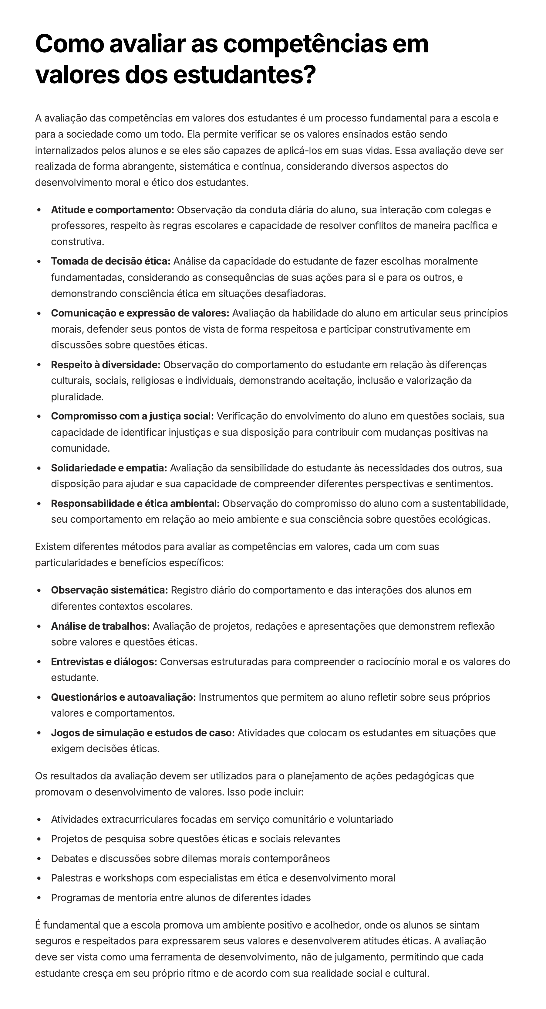 Como avaliar as competências em valores dos estudantes? A avaliação das competências em valores dos estudantes é um processo fundamental para a escola e para a sociedade como um todo. Ela permite verificar se os valores ensinados estão sendo internalizados pelos alunos e se eles são capazes de aplicá-los em suas vidas. Essa avaliação deve ser realizada de forma abrangente, sistemática e contínua, considerando diversos aspectos do desenvolvimento moral e ético dos estudantes. Atitude e comportamento: Observação da conduta diária do aluno, sua interação com colegas e professores, respeito às regras escolares e capacidade de resolver conflitos de maneira pacífica e construtiva. Tomada de decisão ética: Análise da capacidade do estudante de fazer escolhas moralmente fundamentadas, considerando as consequências de suas ações para si e para os outros, e demonstrando consciência ética em situações desafiadoras. Comunicação e expressão de valores: Avaliação da habilidade do aluno em articular seus princípios morais, defender seus pontos de vista de forma respeitosa e participar construtivamente em discussões sobre questões éticas. Respeito à diversidade: Observação do comportamento do estudante em relação às diferenças culturais, sociais, religiosas e individuais, demonstrando aceitação, inclusão e valorização da pluralidade. Compromisso com a justiça social: Verificação do envolvimento do aluno em questões sociais, sua capacidade de identificar injustiças e sua disposição para contribuir com mudanças positivas na comunidade. Solidariedade e empatia: Avaliação da sensibilidade do estudante às necessidades dos outros, sua disposição para ajudar e sua capacidade de compreender diferentes perspectivas e sentimentos. Responsabilidade e ética ambiental: Observação do compromisso do aluno com a sustentabilidade, seu comportamento em relação ao meio ambiente e sua consciência sobre questões ecológicas. Existem diferentes métodos para avaliar as competências em valores, cada um com suas particularidades e benefícios específicos: Observação sistemática: Registro diário do comportamento e das interações dos alunos em diferentes contextos escolares. Análise de trabalhos: Avaliação de projetos, redações e apresentações que demonstrem reflexão sobre valores e questões éticas. Entrevistas e diálogos: Conversas estruturadas para compreender o raciocínio moral e os valores do estudante. Questionários e autoavaliação: Instrumentos que permitem ao aluno refletir sobre seus próprios valores e comportamentos. Jogos de simulação e estudos de caso: Atividades que colocam os estudantes em situações que exigem decisões éticas. Os resultados da avaliação devem ser utilizados para o planejamento de ações pedagógicas que promovam o desenvolvimento de valores. Isso pode incluir: Atividades extracurriculares focadas em serviço comunitário e voluntariado Projetos de pesquisa sobre questões éticas e sociais relevantes Debates e discussões sobre dilemas morais contemporâneos Palestras e workshops com especialistas em ética e desenvolvimento moral Programas de mentoria entre alunos de diferentes idades É fundamental que a escola promova um ambiente positivo e acolhedor, onde os alunos se sintam seguros e respeitados para expressarem seus valores e desenvolverem atitudes éticas. A avaliação deve ser vista como uma ferramenta de desenvolvimento, não de julgamento, permitindo que cada estudante cresça em seu próprio ritmo e de acordo com sua realidade social e cultural.