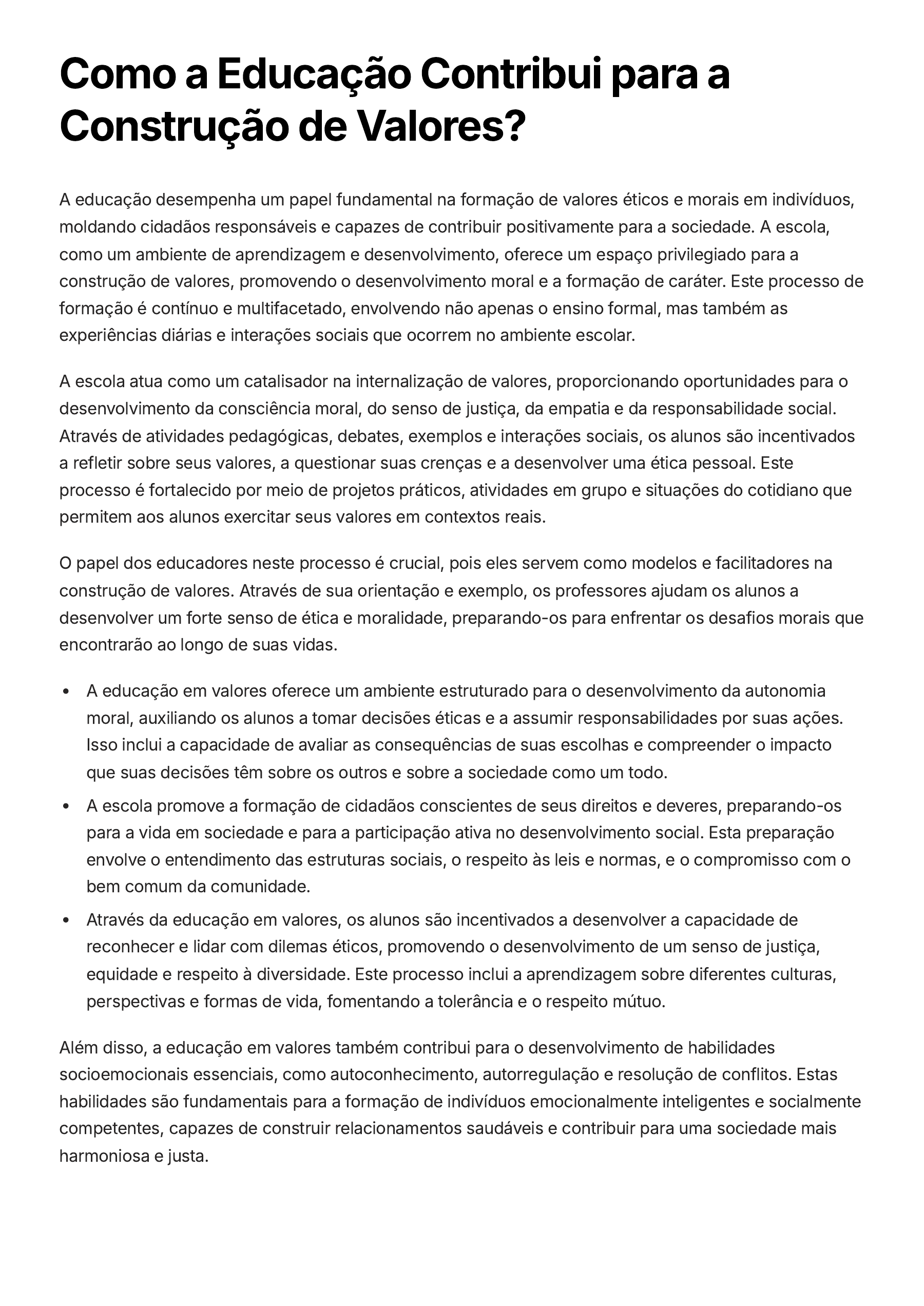 Como a Educação Contribui para a Construção de Valores? A educação desempenha um papel fundamental na formação de valores éticos e morais em indivíduos, moldando cidadãos responsáveis e capazes de contribuir positivamente para a sociedade. A escola, como um ambiente de aprendizagem e desenvolvimento, oferece um espaço privilegiado para a construção de valores, promovendo o desenvolvimento moral e a formação de caráter. Este processo de formação é contínuo e multifacetado, envolvendo não apenas o ensino formal, mas também as experiências diárias e interações sociais que ocorrem no ambiente escolar. A escola atua como um catalisador na internalização de valores, proporcionando oportunidades para o desenvolvimento da consciência moral, do senso de justiça, da empatia e da responsabilidade social. Através de atividades pedagógicas, debates, exemplos e interações sociais, os alunos são incentivados a refletir sobre seus valores, a questionar suas crenças e a desenvolver uma ética pessoal. Este processo é fortalecido por meio de projetos práticos, atividades em grupo e situações do cotidiano que permitem aos alunos exercitar seus valores em contextos reais. O papel dos educadores neste processo é crucial, pois eles servem como modelos e facilitadores na construção de valores. Através de sua orientação e exemplo, os professores ajudam os alunos a desenvolver um forte senso de ética e moralidade, preparando-os para enfrentar os desafios morais que encontrarão ao longo de suas vidas. A educação em valores oferece um ambiente estruturado para o desenvolvimento da autonomia moral, auxiliando os alunos a tomar decisões éticas e a assumir responsabilidades por suas ações. Isso inclui a capacidade de avaliar as consequências de suas escolhas e compreender o impacto que suas decisões têm sobre os outros e sobre a sociedade como um todo. A escola promove a formação de cidadãos conscientes de seus direitos e deveres, preparando-os para a vida em sociedade e para a participação ativa no desenvolvimento social. Esta preparação envolve o entendimento das estruturas sociais, o respeito às leis e normas, e o compromisso com o bem comum da comunidade. Através da educação em valores, os alunos são incentivados a desenvolver a capacidade de reconhecer e lidar com dilemas éticos, promovendo o desenvolvimento de um senso de justiça, equidade e respeito à diversidade. Este processo inclui a aprendizagem sobre diferentes culturas, perspectivas e formas de vida, fomentando a tolerância e o respeito mútuo. Além disso, a educação em valores também contribui para o desenvolvimento de habilidades socioemocionais essenciais, como autoconhecimento, autorregulação e resolução de conflitos. Estas habilidades são fundamentais para a formação de indivíduos emocionalmente inteligentes e socialmente competentes, capazes de construir relacionamentos saudáveis e contribuir para uma sociedade mais harmoniosa e justa.